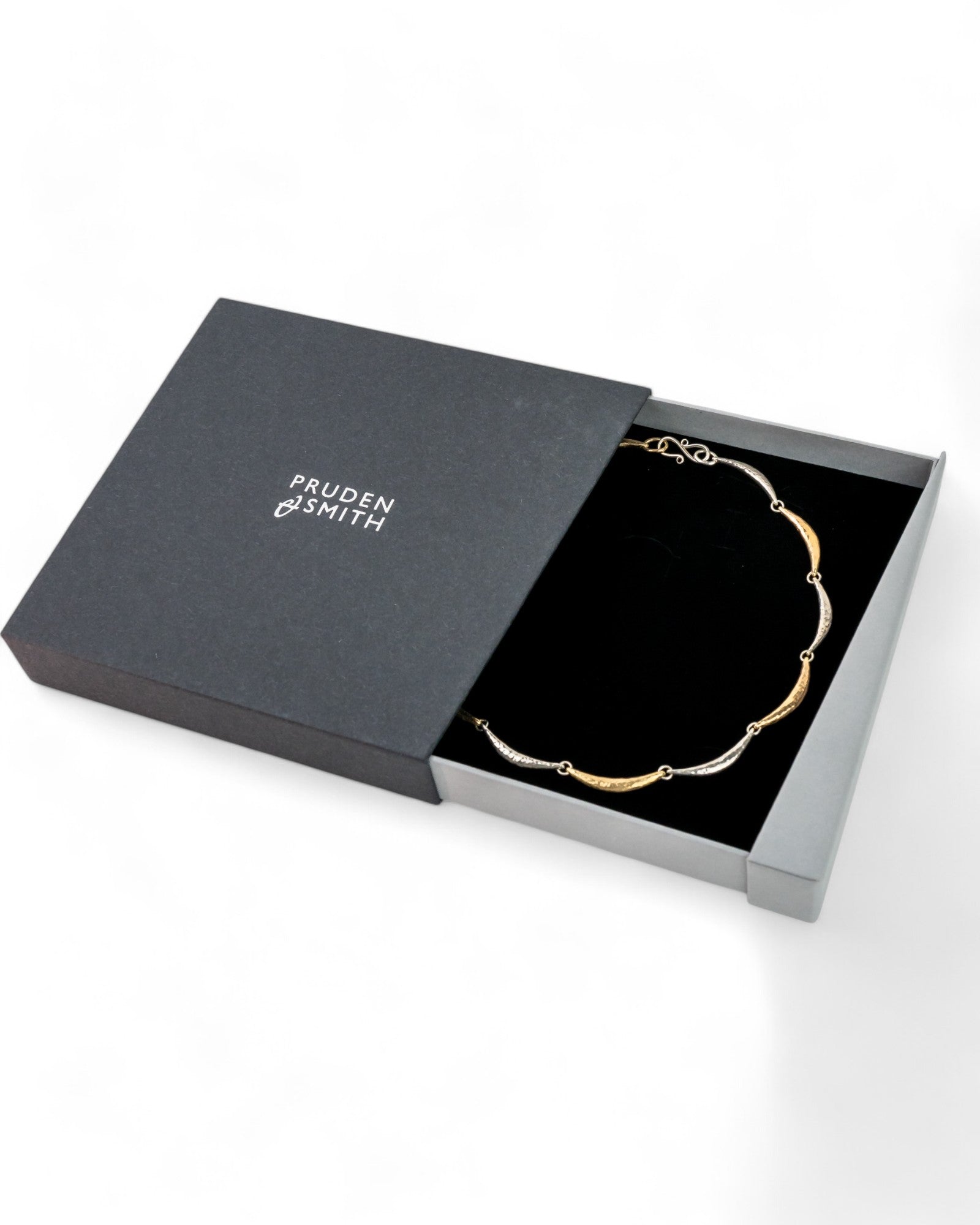 • Gehämmerte Textur: Jedes Gold- und Silberstück ist gehämmert, was die optische Attraktivität der Halskette erhöht und eine reizvolle Textur erzeugt, die das Licht wunderschön einfängt.