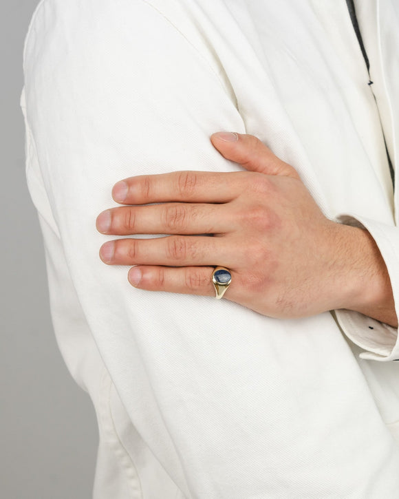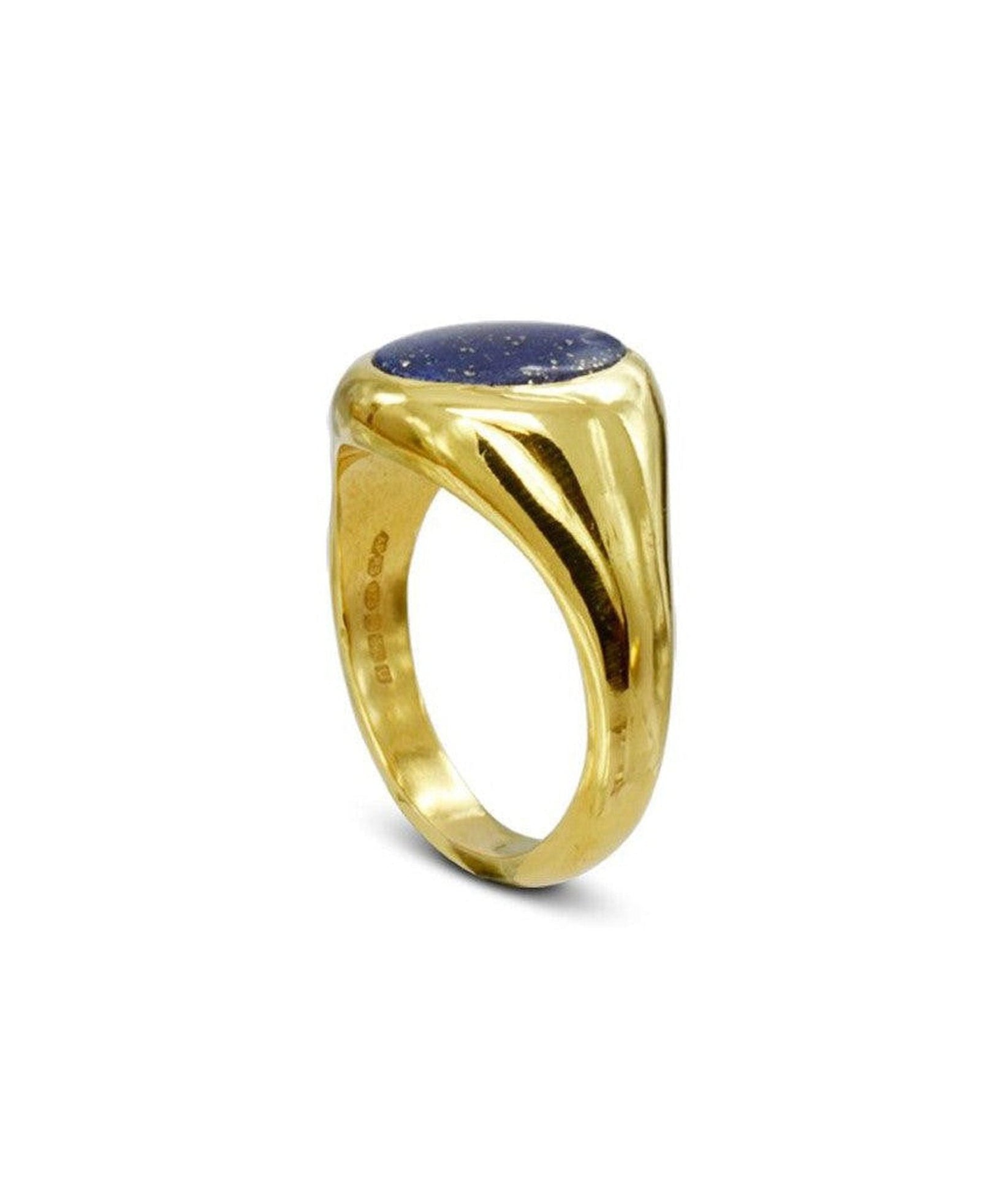 The Lapis Lazuli Signet Ring is handmade from sterling silver and crowned with a 14x12mm lapis lazuli cabochon.