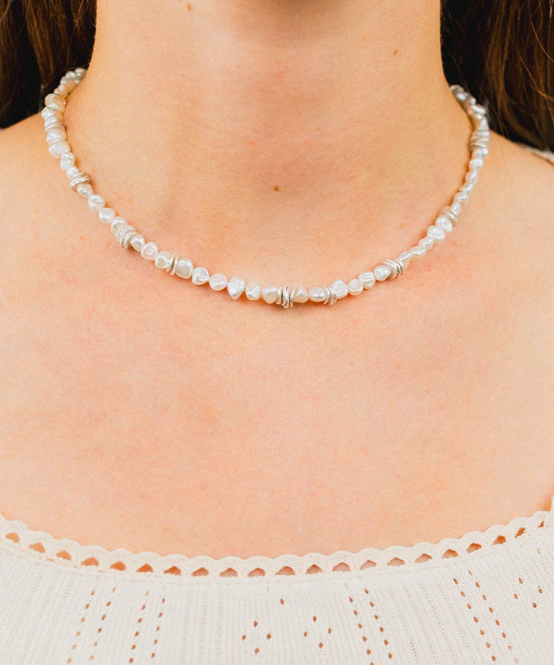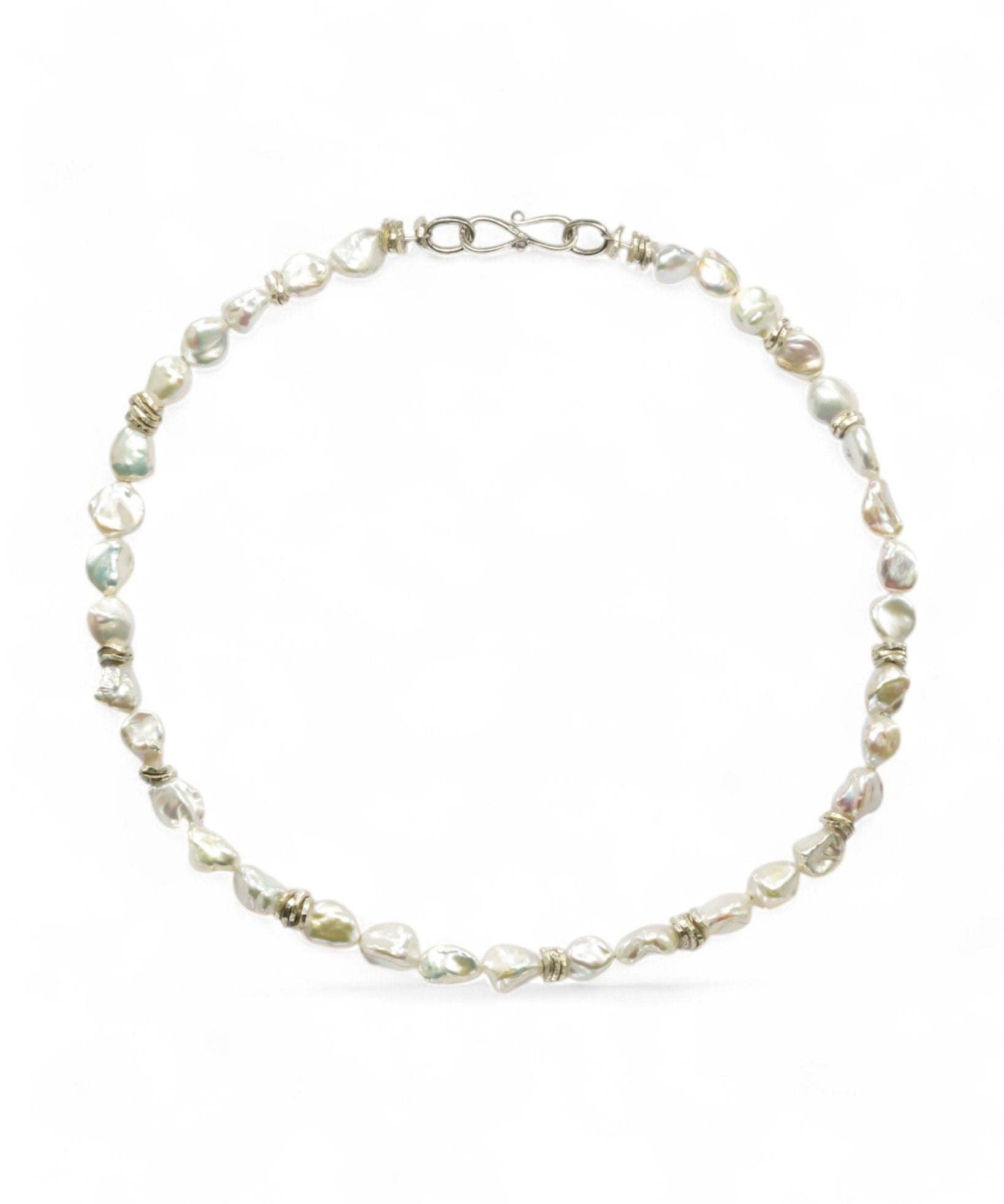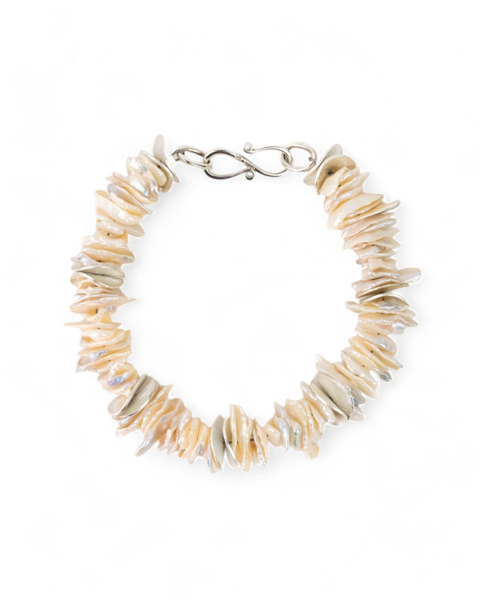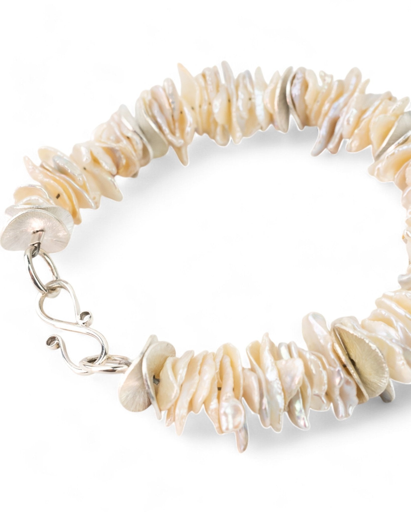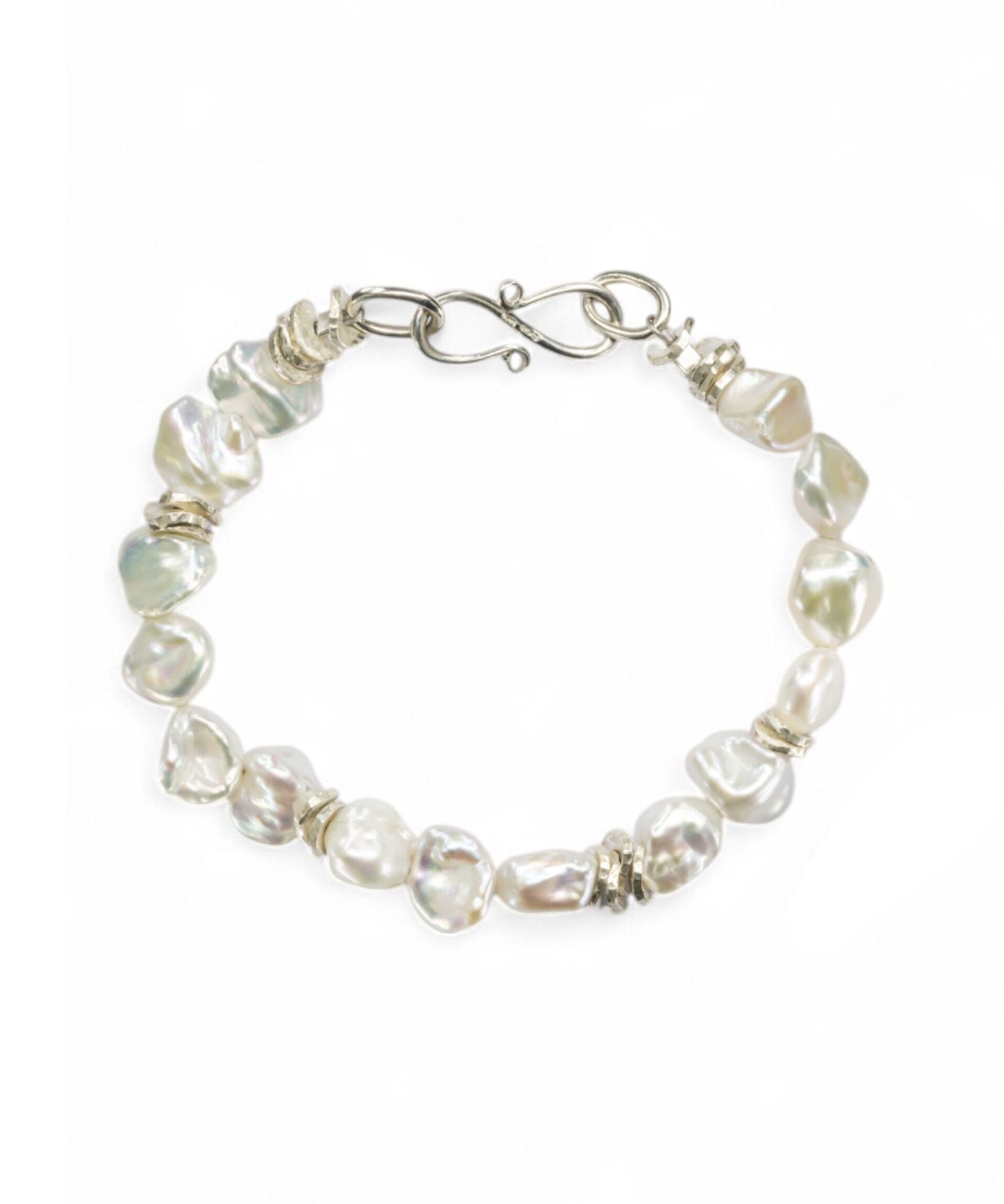 The Keshi Pearl Silver Disc Bracelet combines 12mm sterling silver discs with lustrous Keshi pearls.
