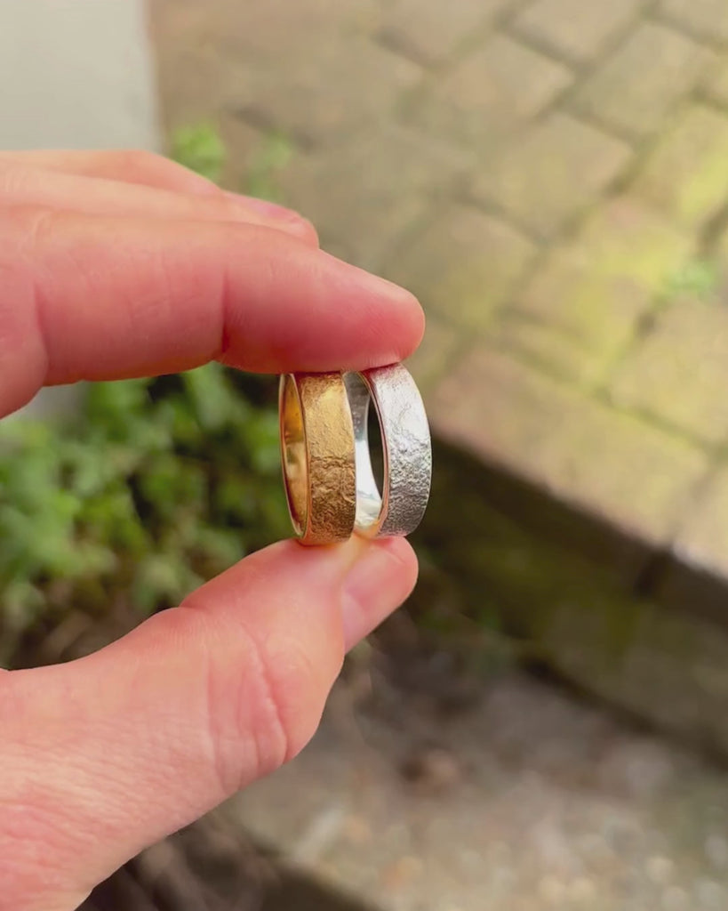 Unique Texture: This texture is created through a process called reticulation. The metal for the ring is placed on cold steel then heated with a flame. The steel keeps the inside surface cold and the shape and structure of the sheet intact. The flame melts the outside surface of the metal. The melting surface expands, then, as it cools it shrinks leaving this unique pattern. Its replicates the naturally occurring process of the earths cooling crust. Each one is unique.