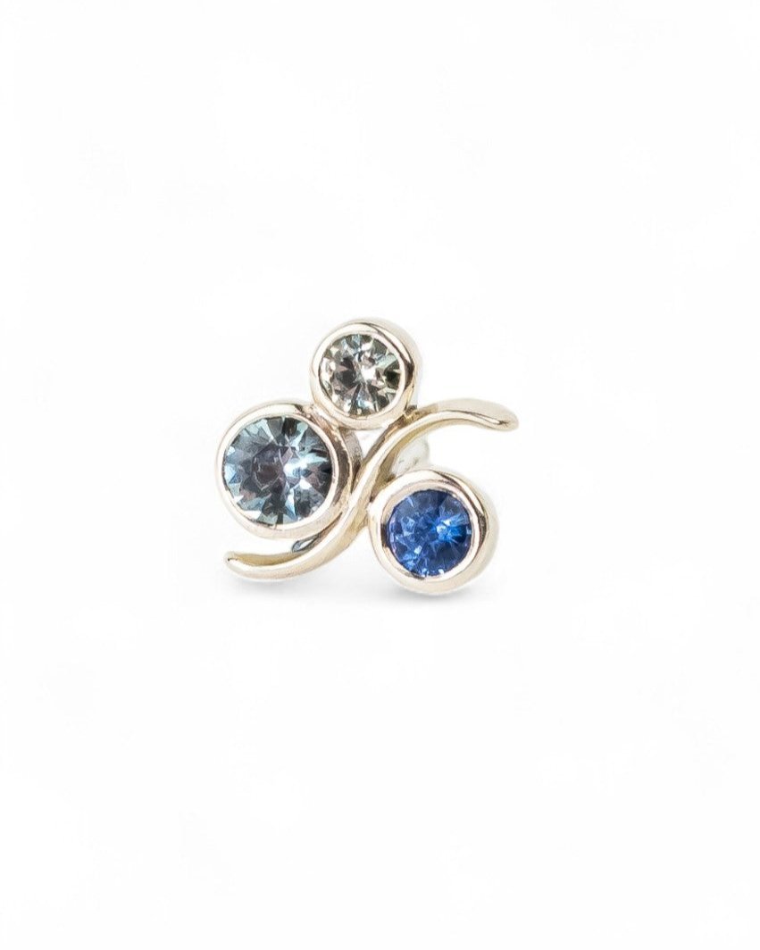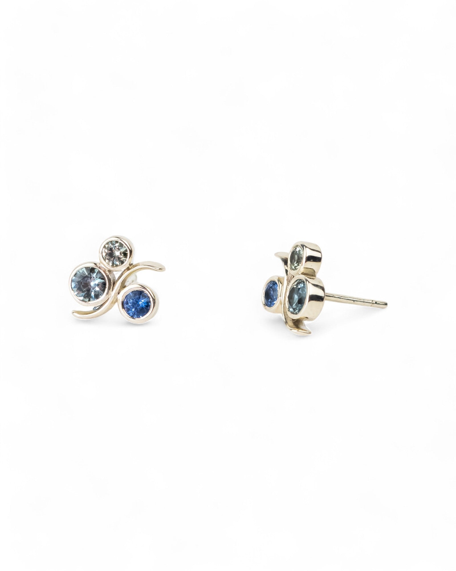 Die Water Bubbles Saphir-Diamant-Ohrstecker vereinen Eleganz und Luxus. Mit einem 3,5 mm großen blauen Saphir, einem 3 mm großen blaugrünen Saphir und einem 2,5 mm großen runden Diamanten oder drei runden Brillanten sind diese Ohrstecker in perfekter Handarbeit gefertigt.
