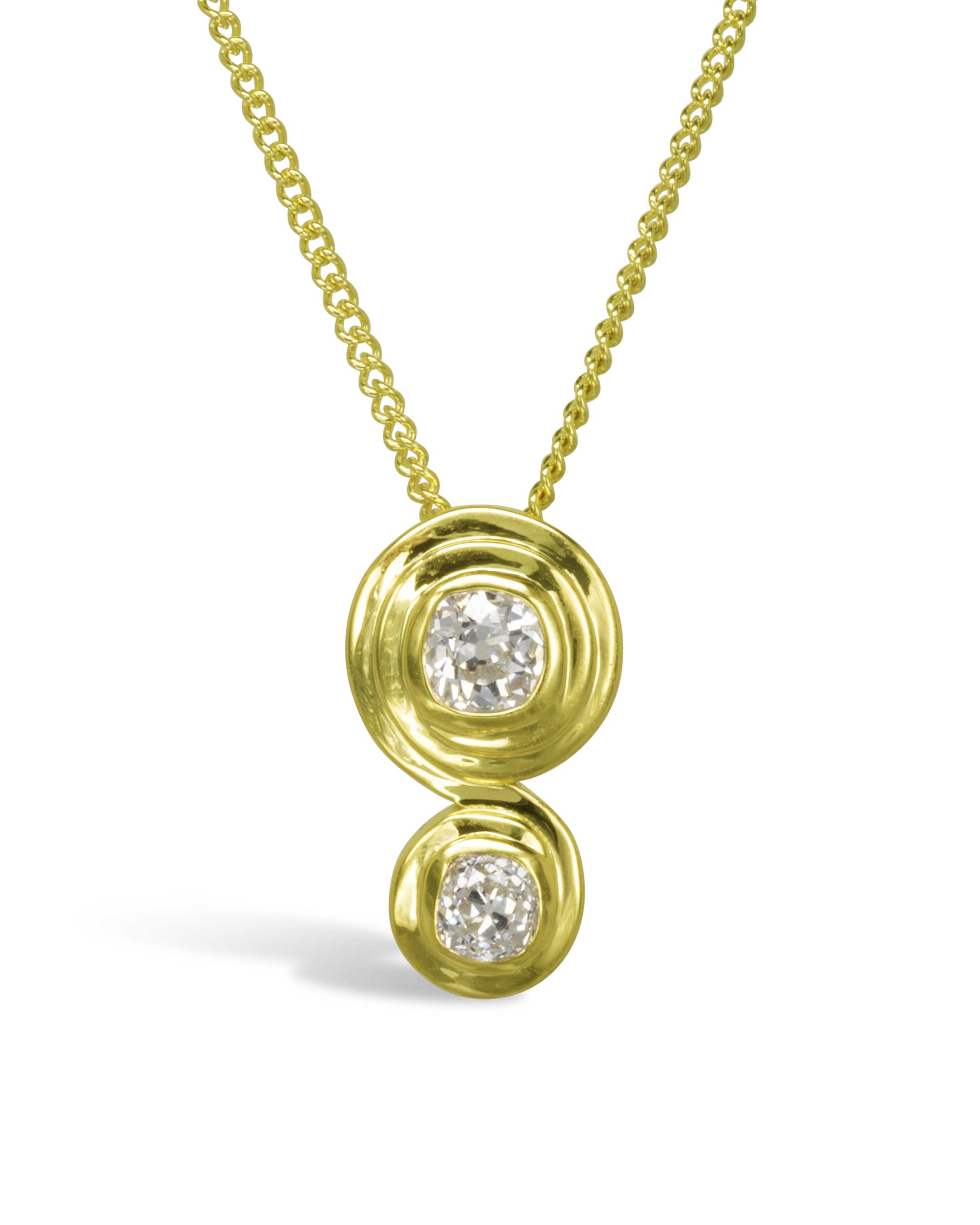 Der Anhänger aus 18 Karat Gelbgold mit Diamanten im Altschliff ist eine Verschmelzung von Geschichte und Eleganz. Diamanten im Altschliff, neu gefasst in 18 Karat Gelbgold, bilden einen spiralförmigen Anhänger im römischen Stil. Die Spirale folgt anmutig den leicht unebenen Kanten der Diamanten und verleiht dem Design Charakter.