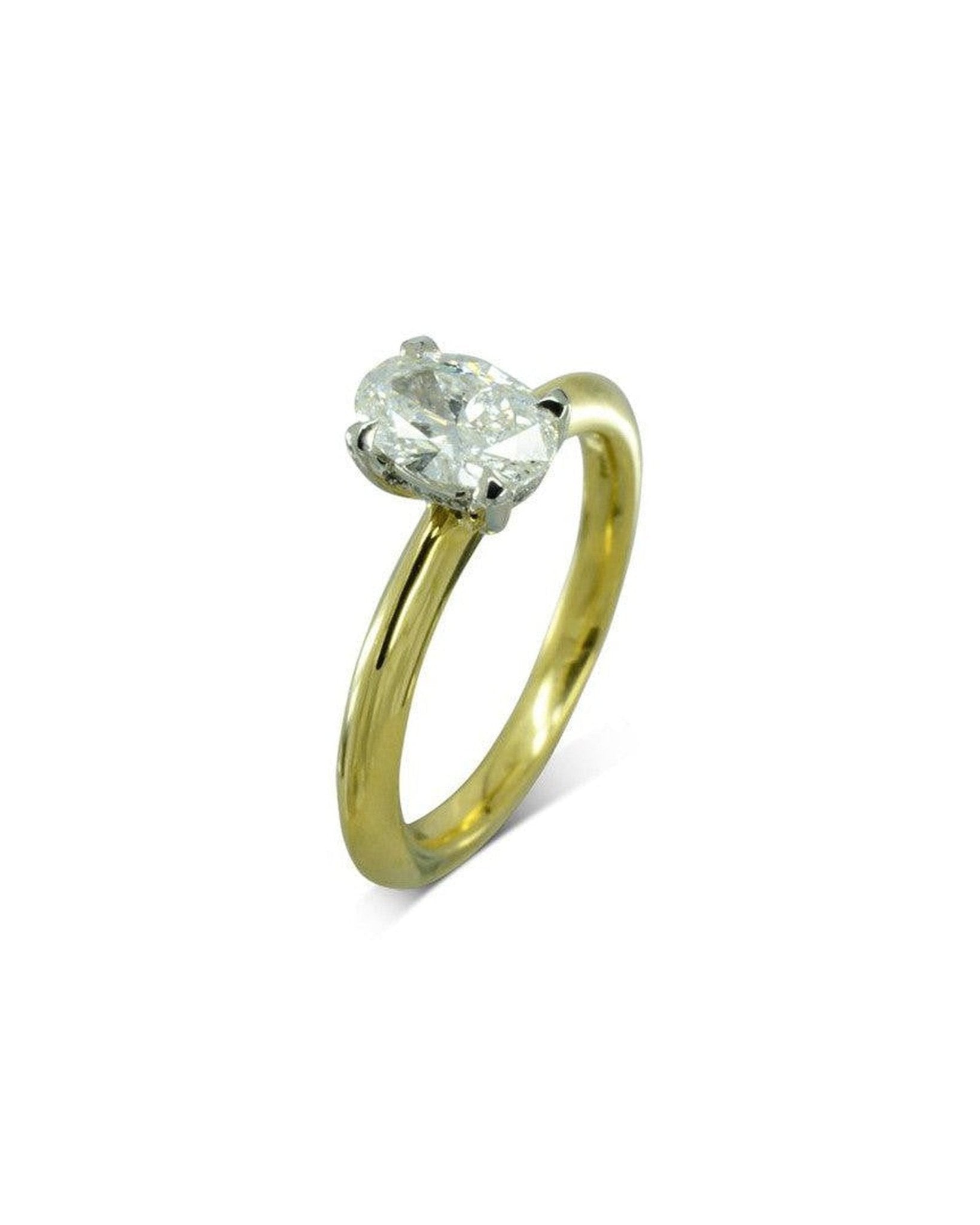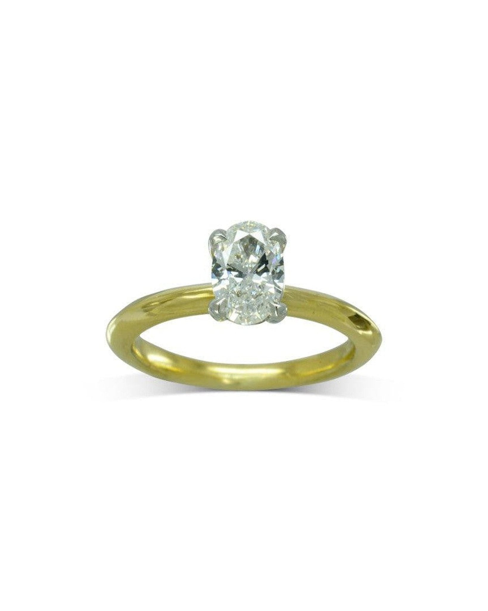 Der Halo-Diamant-Verlobungsring aus Gelbgold verfügt über einen ovalen Diamanten, der von einem versteckten Ring aus Diamanten umgeben ist, der diskret in die Basis der Krappen eingebettet ist.