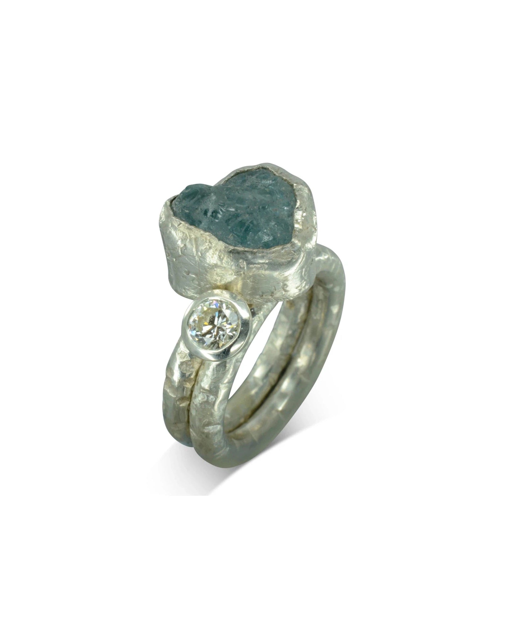 Der Aquamarin- und Diamant-Stapelring aus Silber kombiniert klassische Designelemente mit einzigartigen Texturen und schafft so einen einzigartigen Ring, der auffällt.