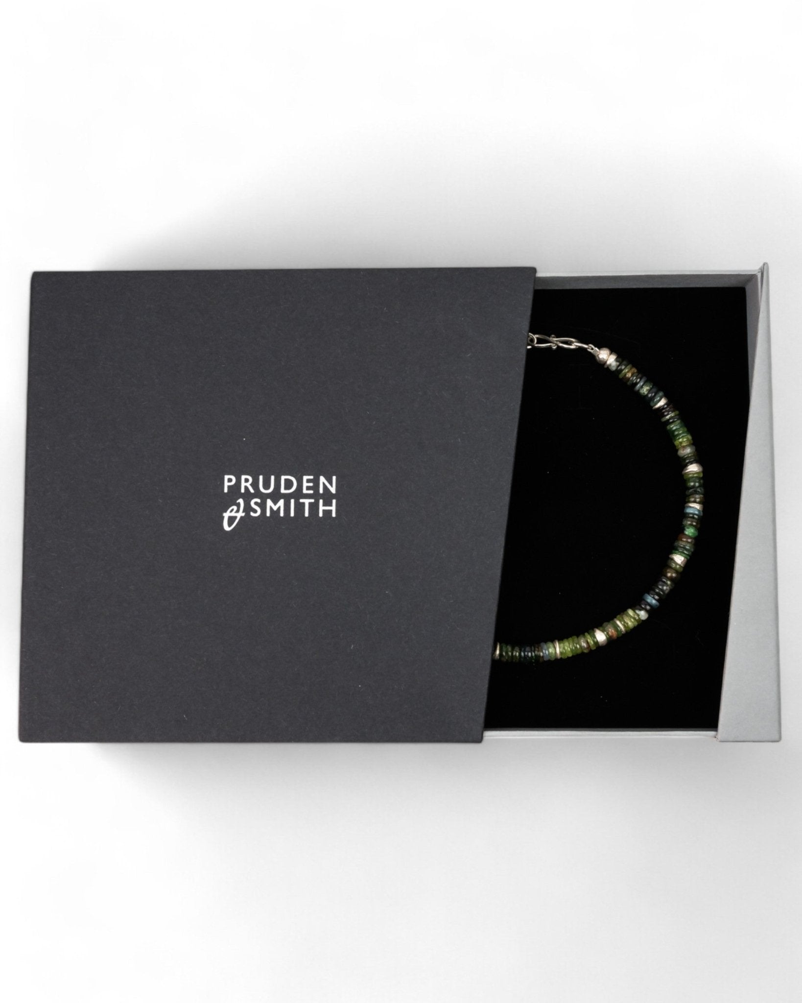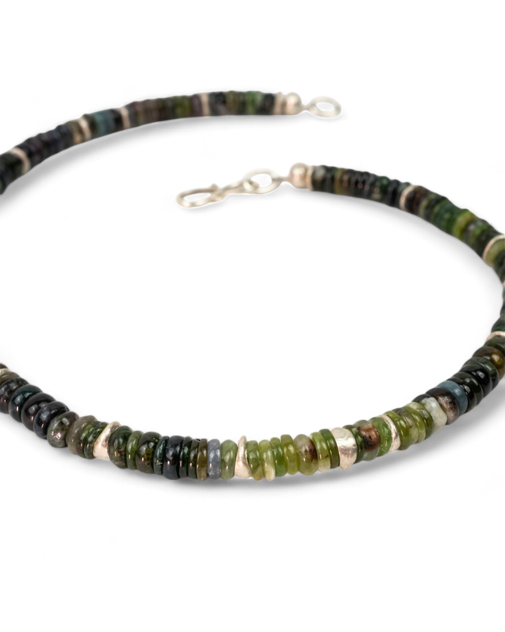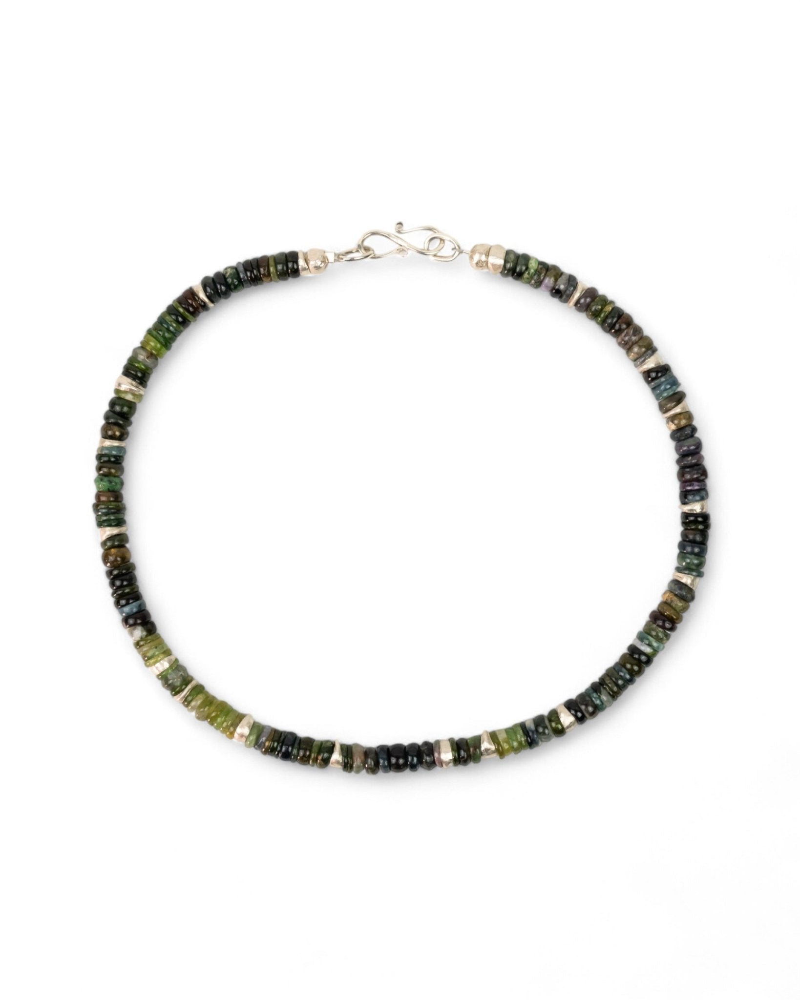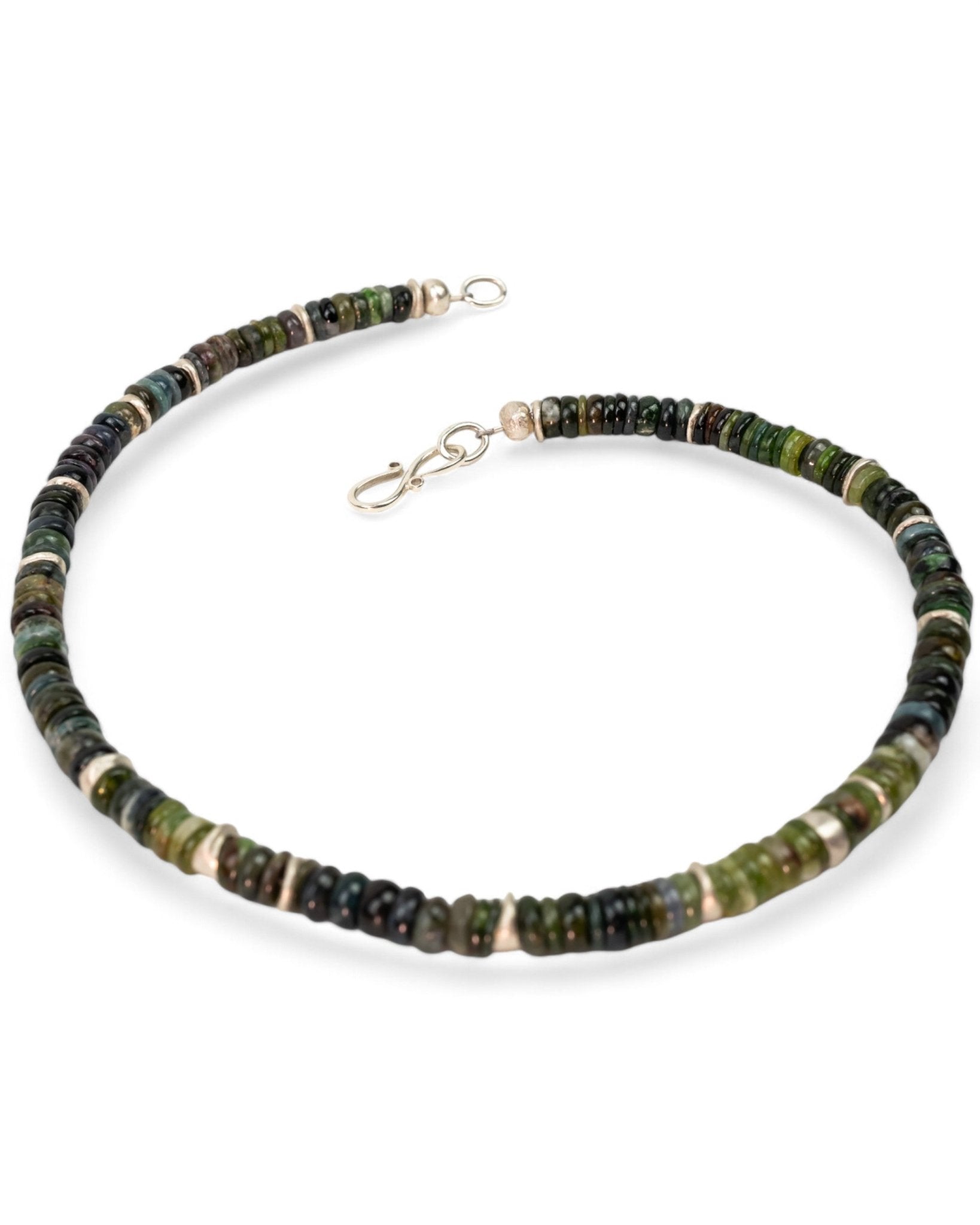 Die silberne Turmalinkette (grün) ist in verschiedenen Farbkombinationen erhältlich. Diese hier besteht aus einer Mischung blauer bis grüner Turmalin-Edelsteine, wunderschön bespannt mit Silbernuggets und grob gehämmerten Silberknöpfen. Die Kette ist mit einem handgefertigten „S“-Verschluss mit Silberpunze gesichert, der dem Design einen Hauch von Eleganz und Authentizität verleiht. Passende Armbänder und Ohrringe sind erhältlich.