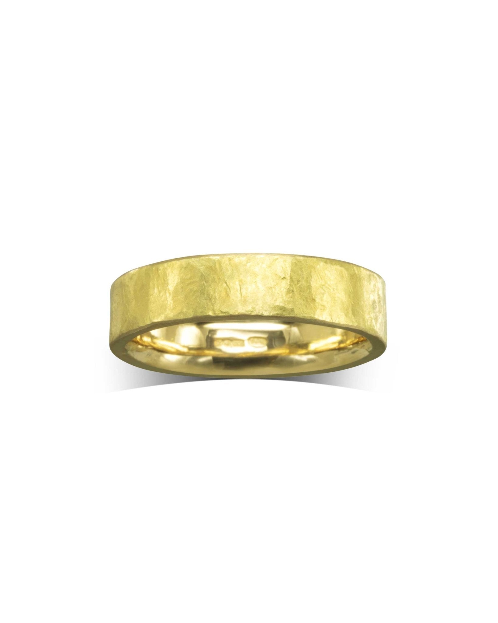 Der strukturierte, flache Ehering aus Gelbgold weist eine einzigartige, grob gehämmerte Textur auf und ist mit einem schweren Gewicht für ein eindrucksvolles und zeitloses Gefühl gestaltet.