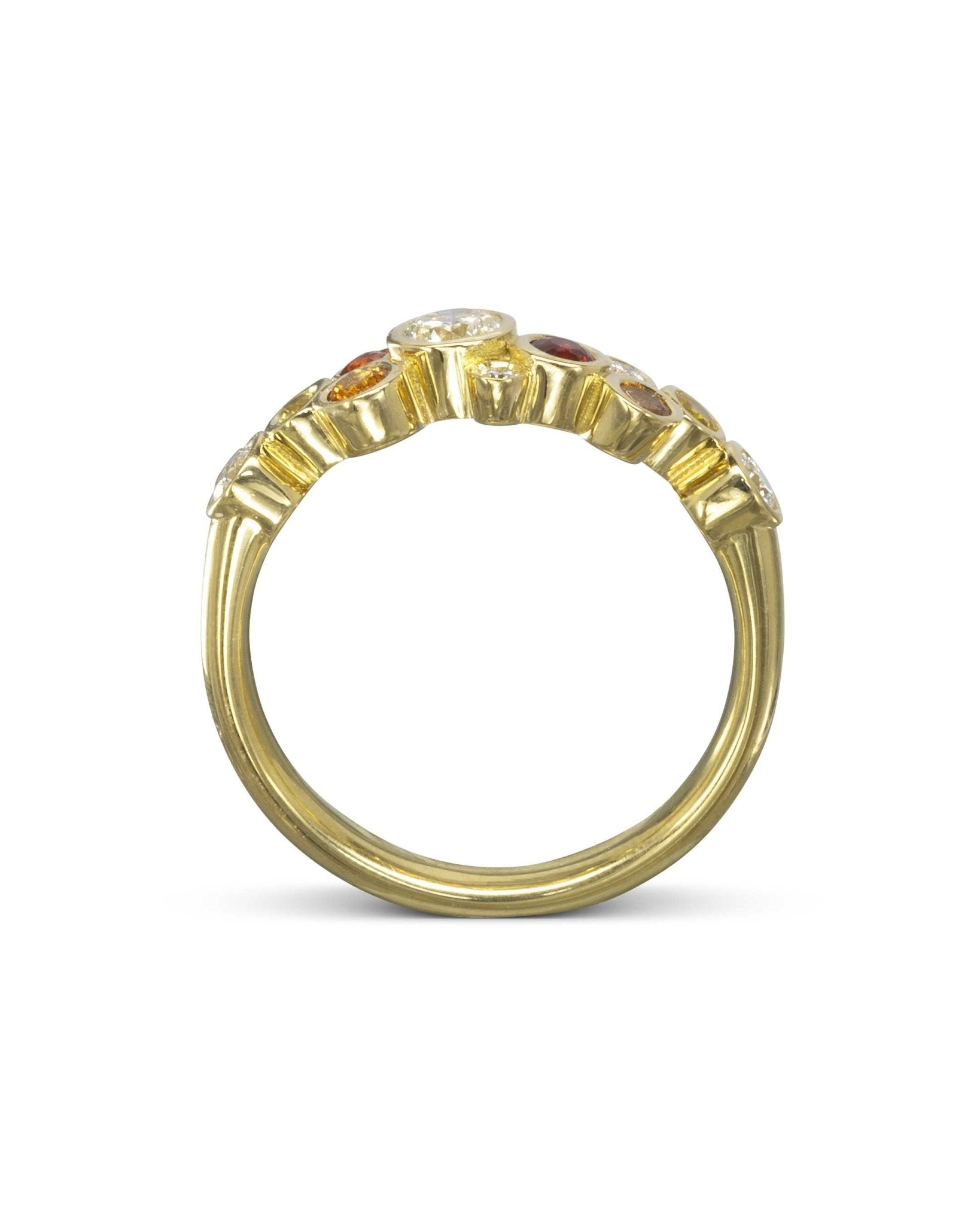 • Unregelmäßige Eleganz: 40 % des Rings sind mit runden Diamanten im Brillantschliff und gelbroten und orangefarbenen Saphiren im Bereich von 1,8 mm bis 3,5 mm besetzt, wodurch ein einzigartiges, unregelmäßiges Muster in warmen Farben entsteht.