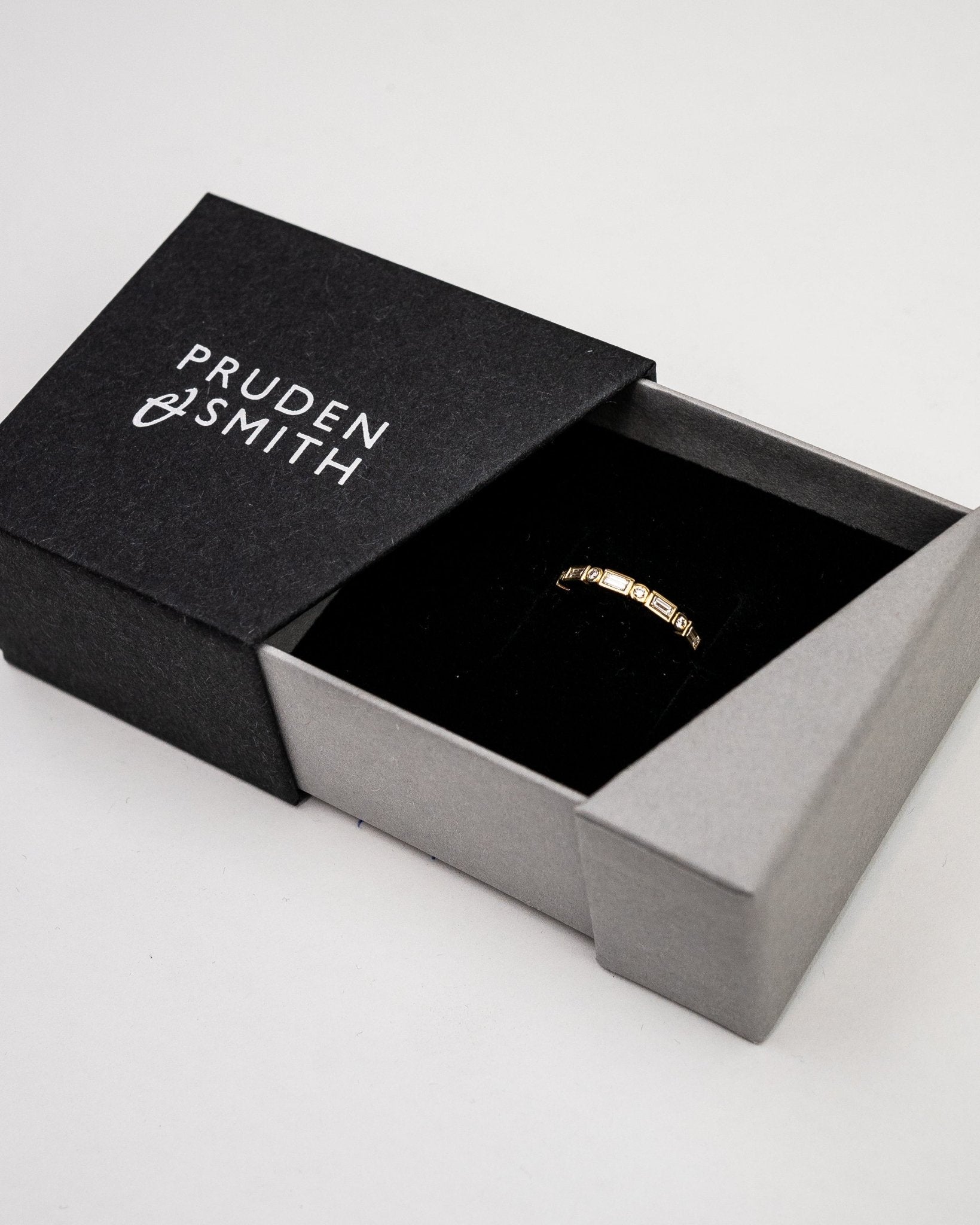 • Anpassungsoptionen: Erhältlich als Vollset (1,08 ct) mit ungefähr acht Baguette-Diamanten oder wählen Sie aus unseren Halbset-Versionen: 50 % mit 0,65 ct und vier Baguettes oder 40 % mit drei Baguettes, insgesamt 0,52 ct. Die Anzahl der Steine ​​kann je nach Ringgröße variieren, um eine perfekte Passform zu gewährleisten.