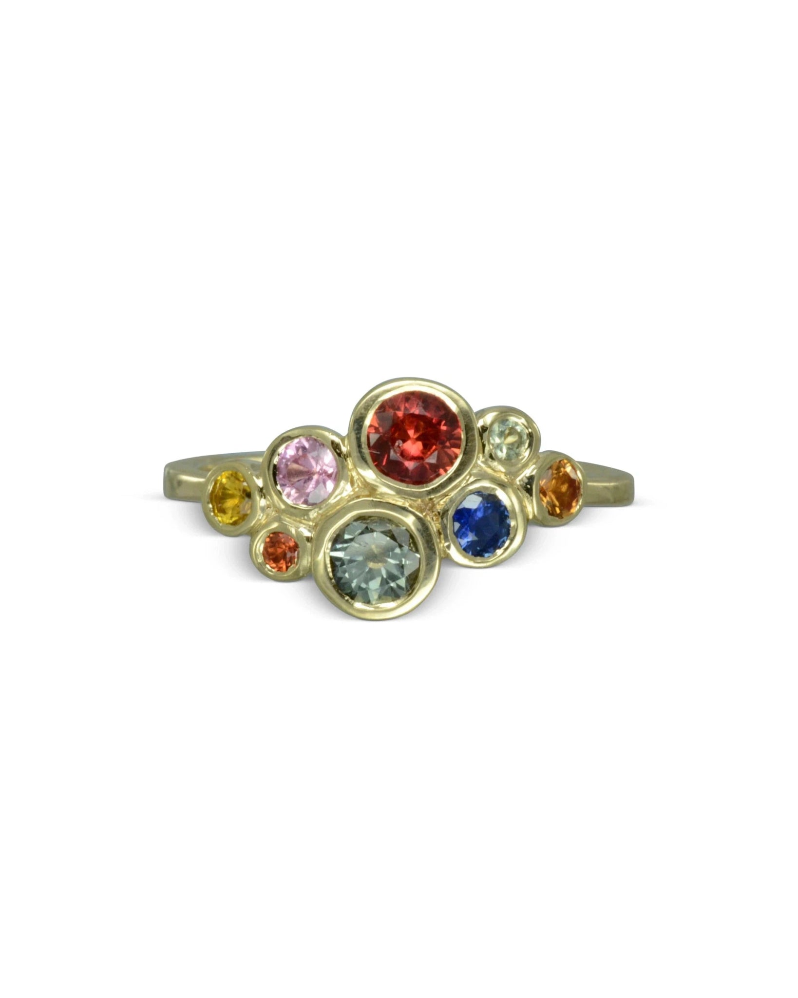 Der mehrfarbige Saphir-Clusterring „Water Bubbles“ aus 9 Karat Gelbgold feiert die Vielfalt dieses bemerkenswerten Edelsteins.