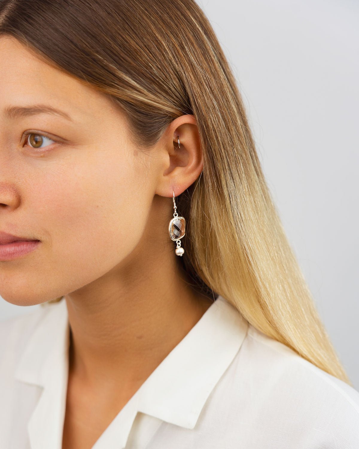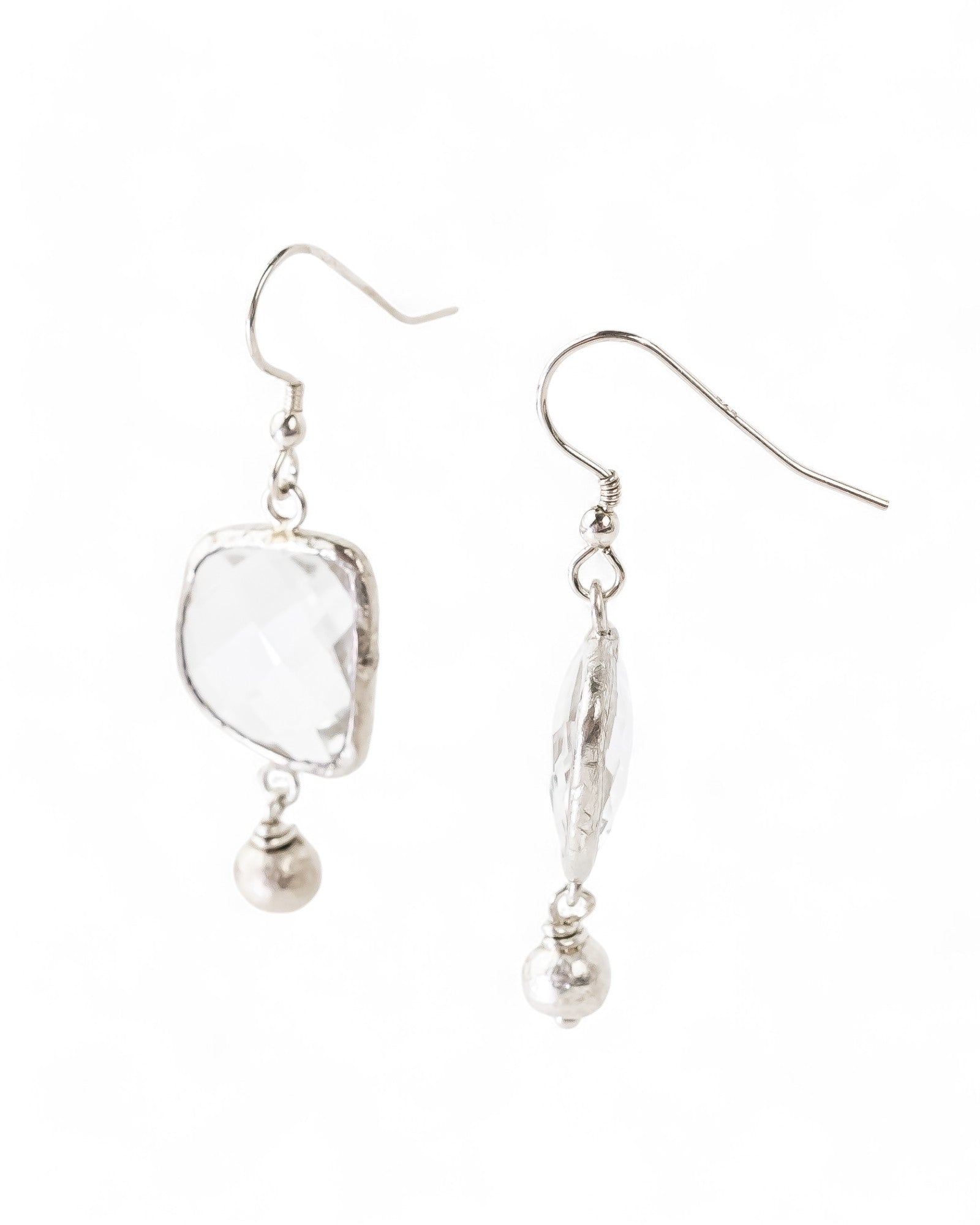 Die Bergkristall-Ohrhänger sind handgefertigt aus Sterlingsilber und haben ein charakteristisches gehämmertes, mattes Finish.