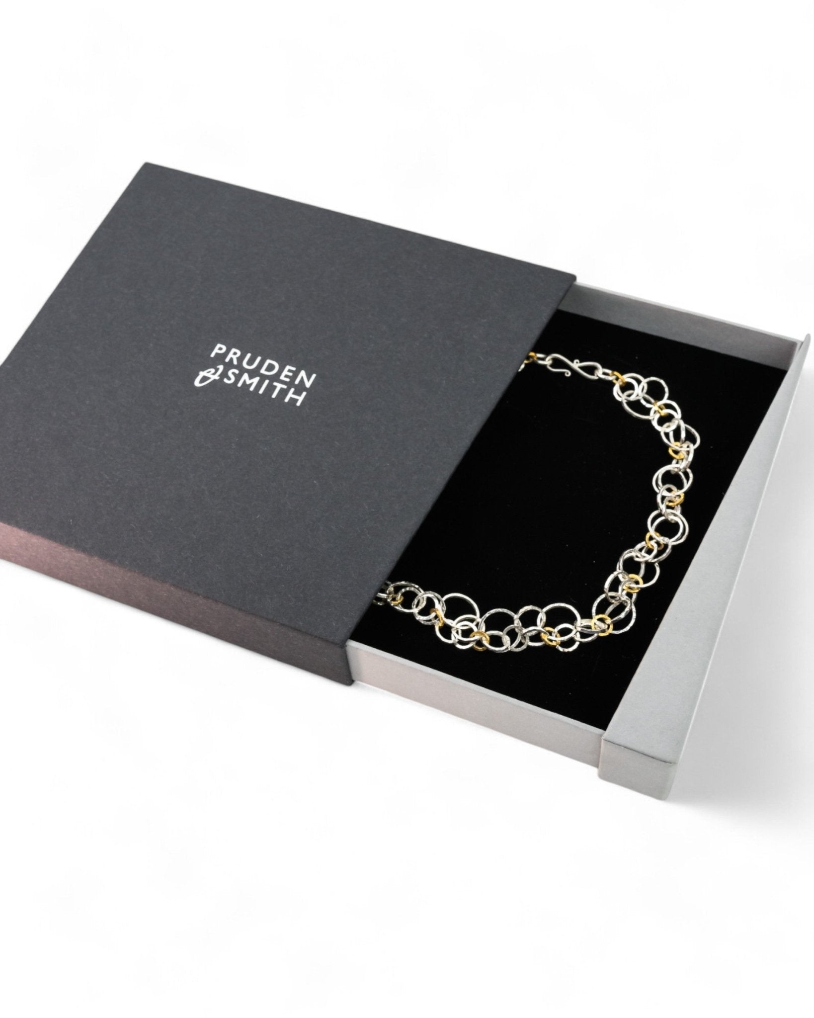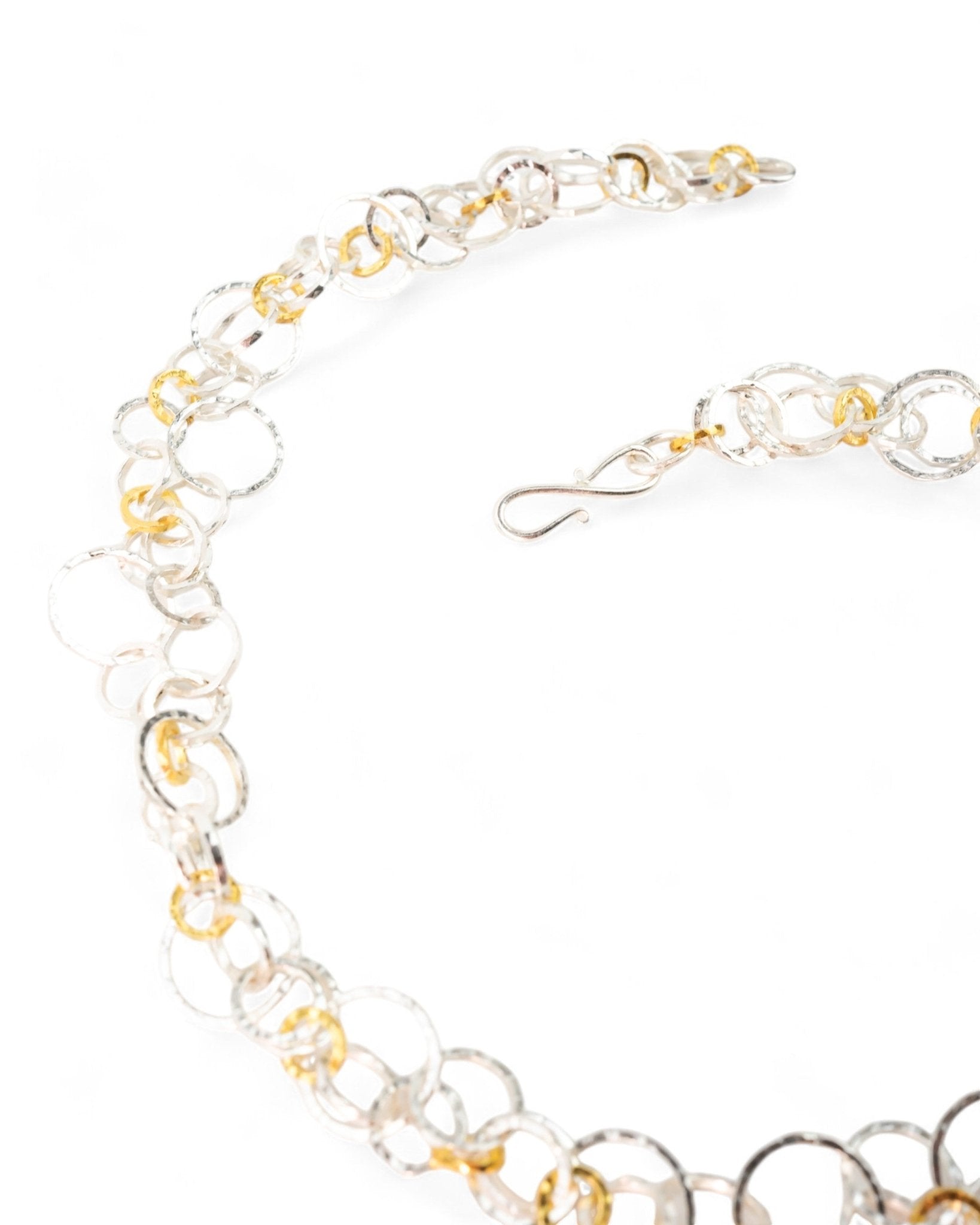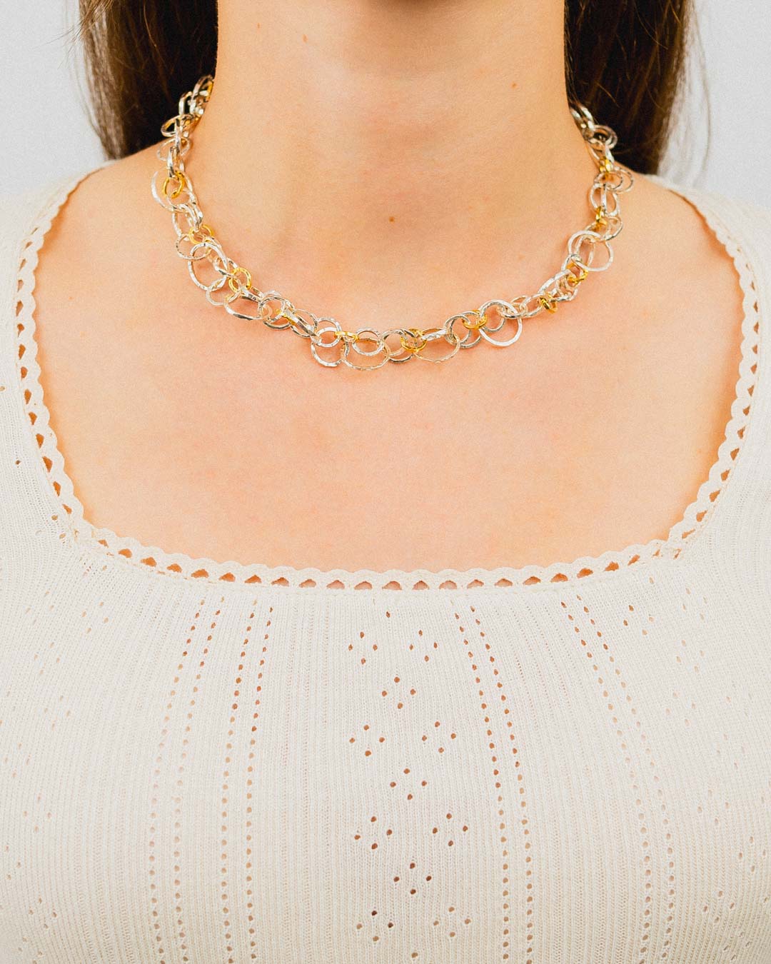 Die gehämmerte zweifarbige Halskette ist eine vielseitige Halskette, die mühelos warme und kühle Töne in einem Stück vereint. Ihr elegantes Design fällt nicht nur allein auf, sondern ergänzt auch wunderbar andere Stücke unserer Kollektion.