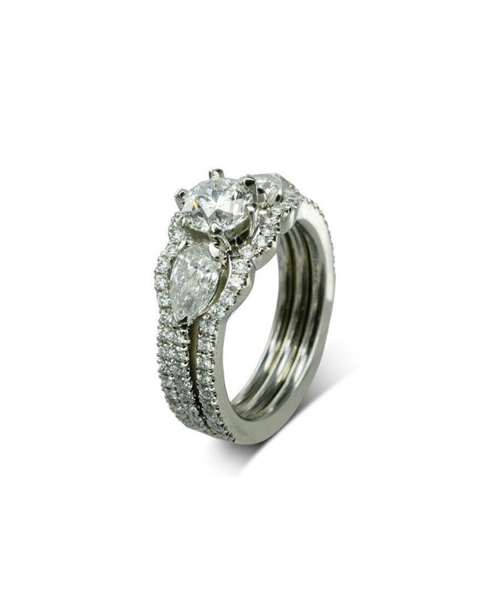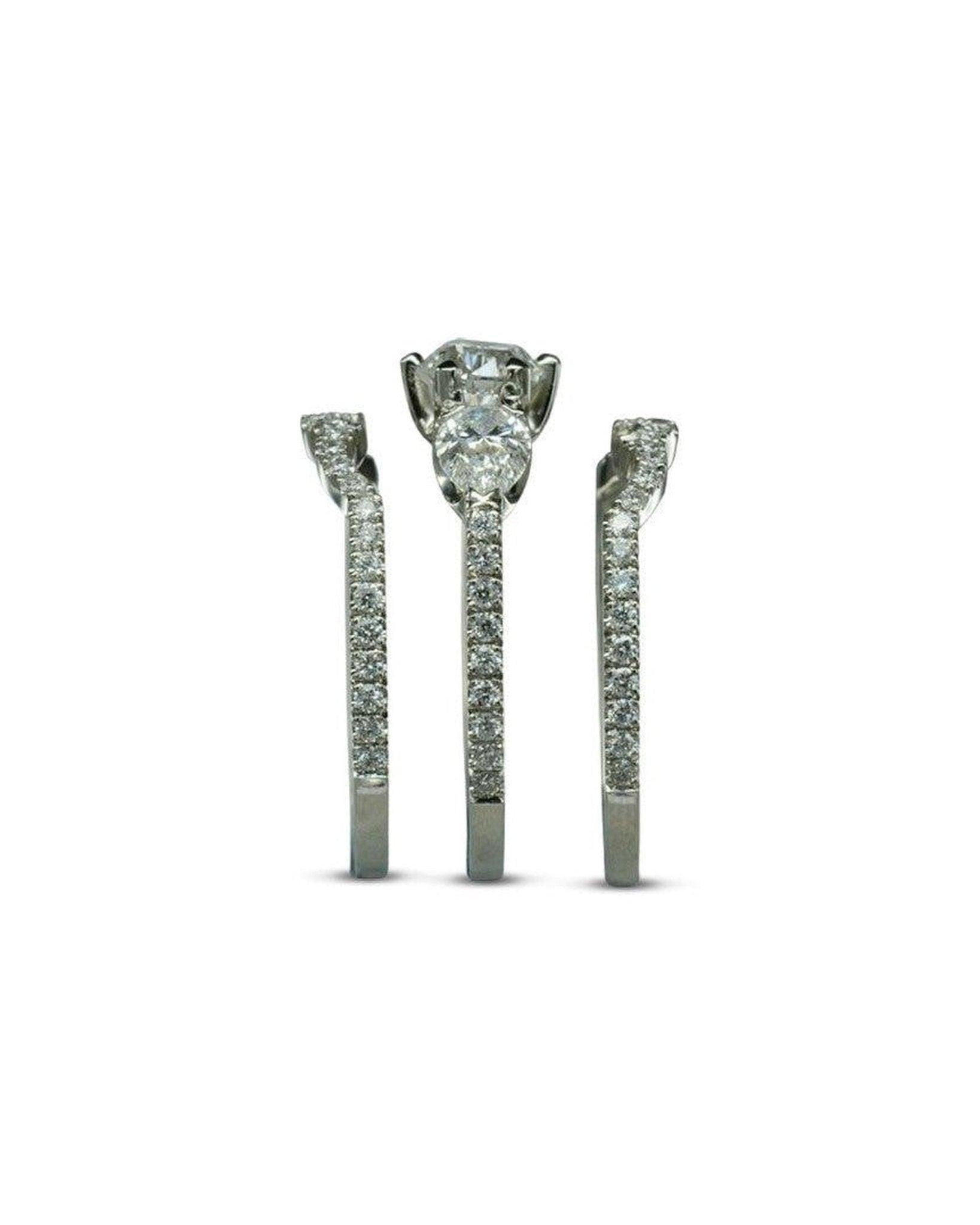 Trilogie-Ringset mit runden Brillanten und birnenförmigen Diamanten in Krappenfassung