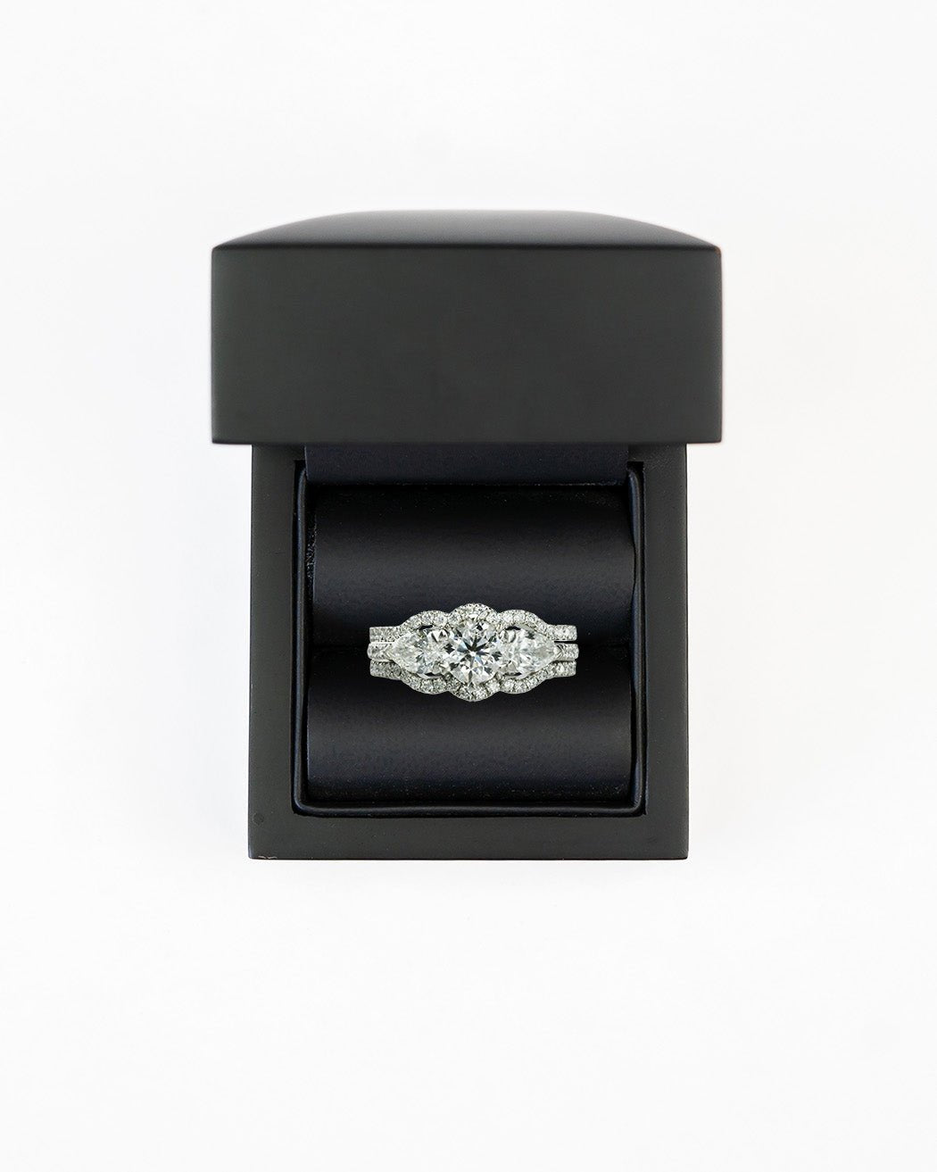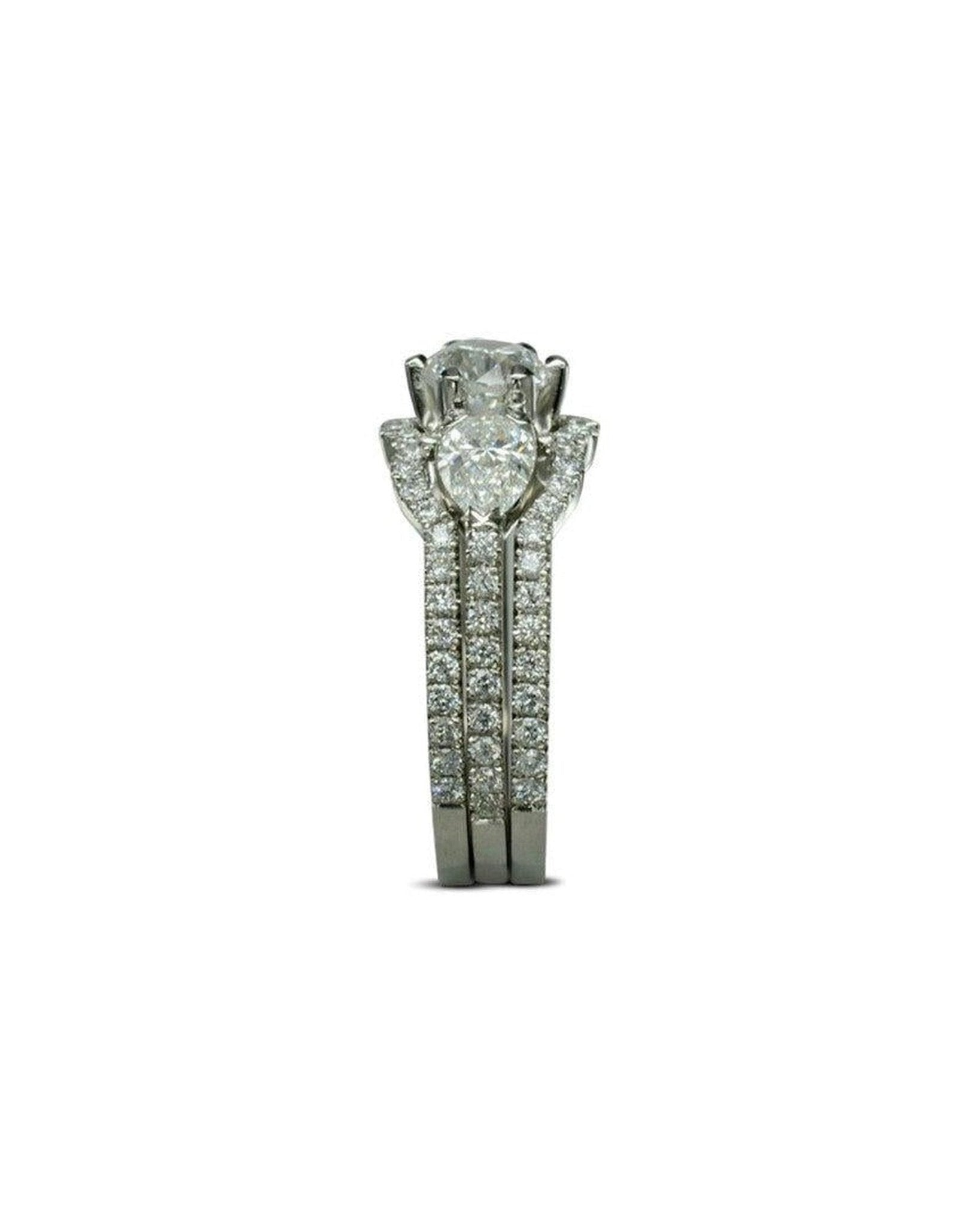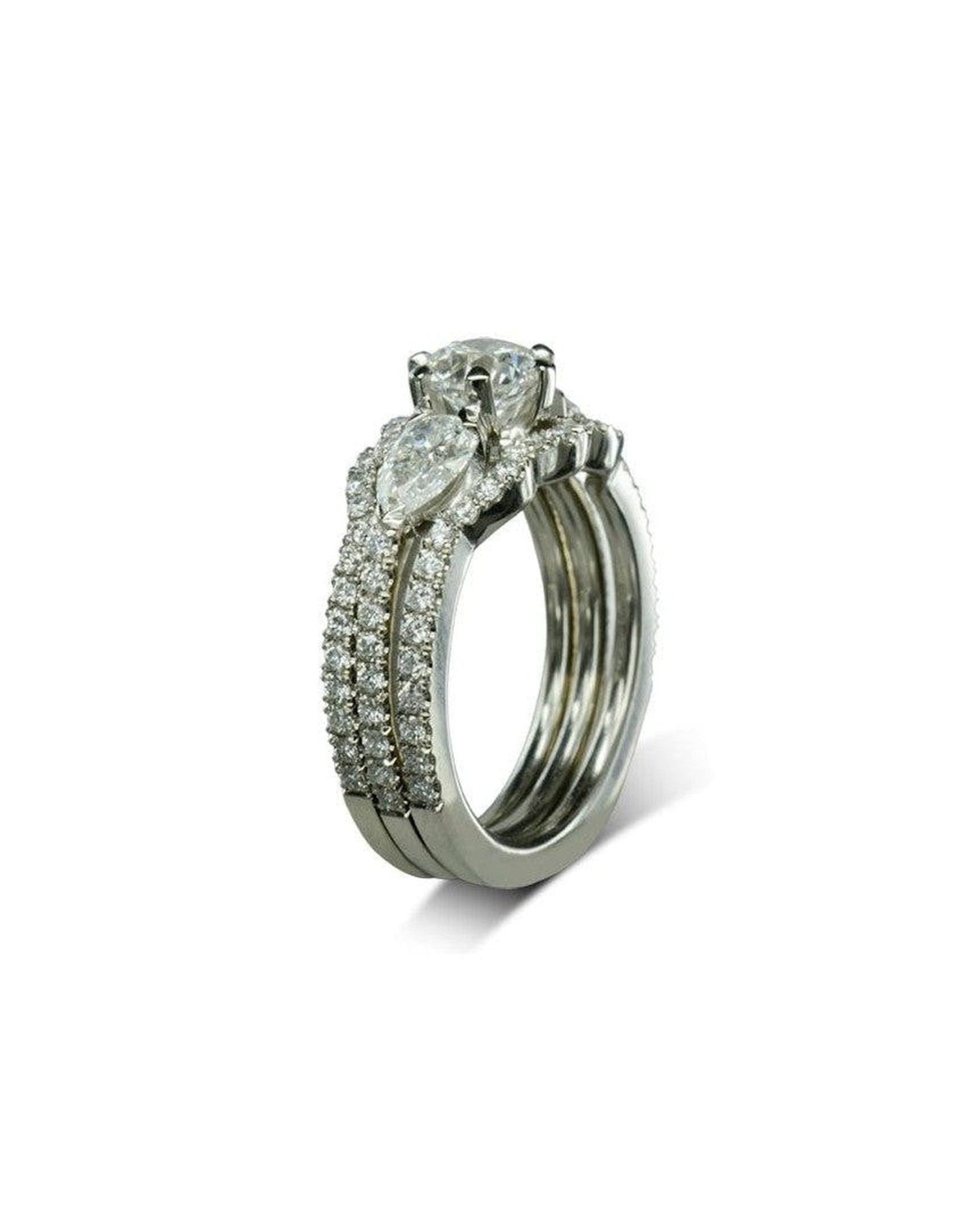 Das Trilogie-Ringset mit runden Brillanten und birnenförmigen Diamanten verfügt über einen atemberaubenden birnenförmigen Diamanten als Mittelstück, flankiert von zwei birnenförmigen Diamantseiten. Der passende Ehering und der Eternity-Ring in Schlossfassung sind so gestaltet, dass sie perfekt auf beide Seiten des Verlobungsrings passen und die Illusion eines größeren, zusammenhängenden Rings erzeugen.