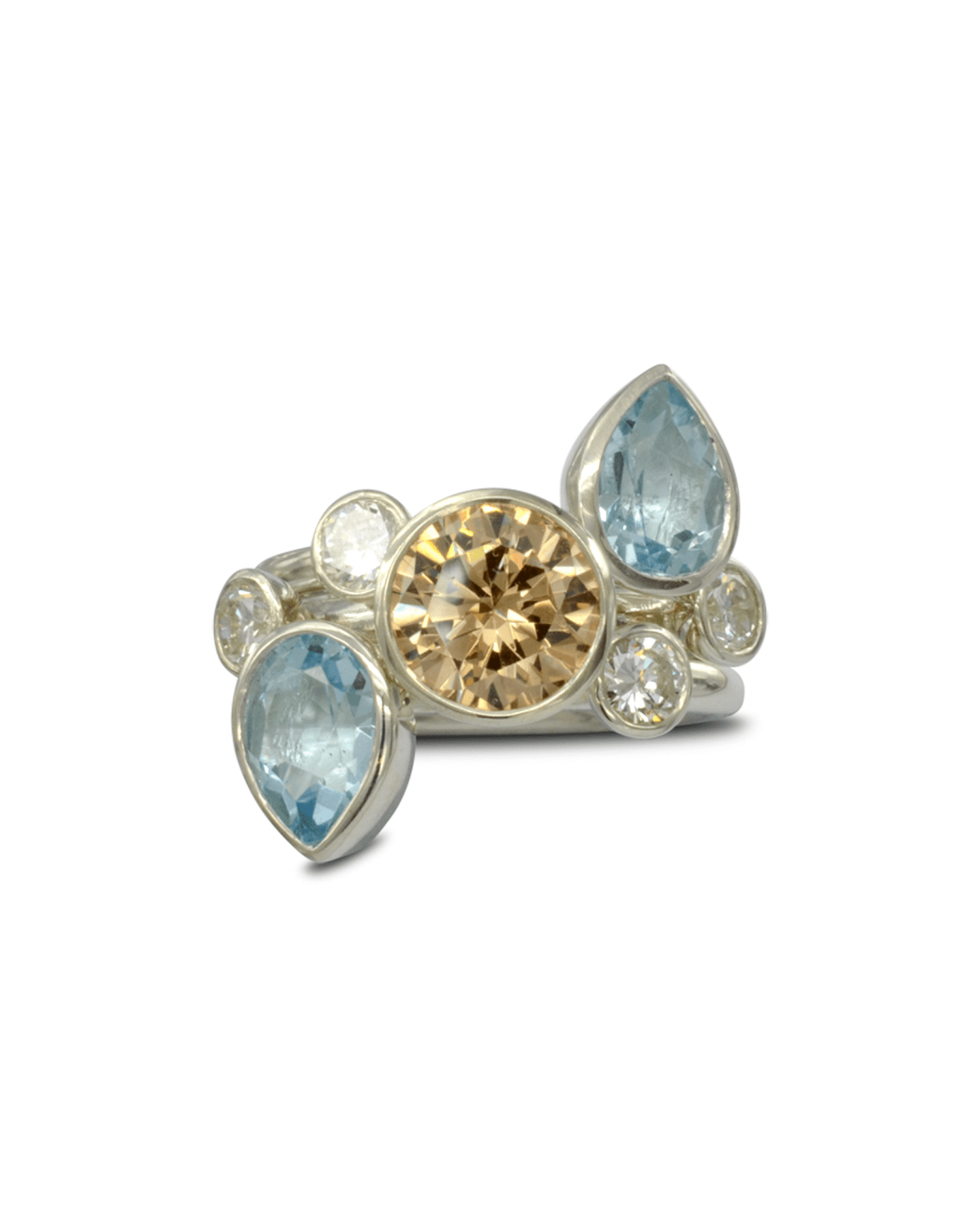 • Eigene Steine ​​des Kunden : Der Mittelstein im abgebildeten Set ist ein zart gefärbter Citrin, der einen schönen Kontrast zu den Aquamarinen und Diamanten bildet. Diese Ringe können Sie mit Ihren eigenen Steinen versehen und so wirklich individuell gestalten.