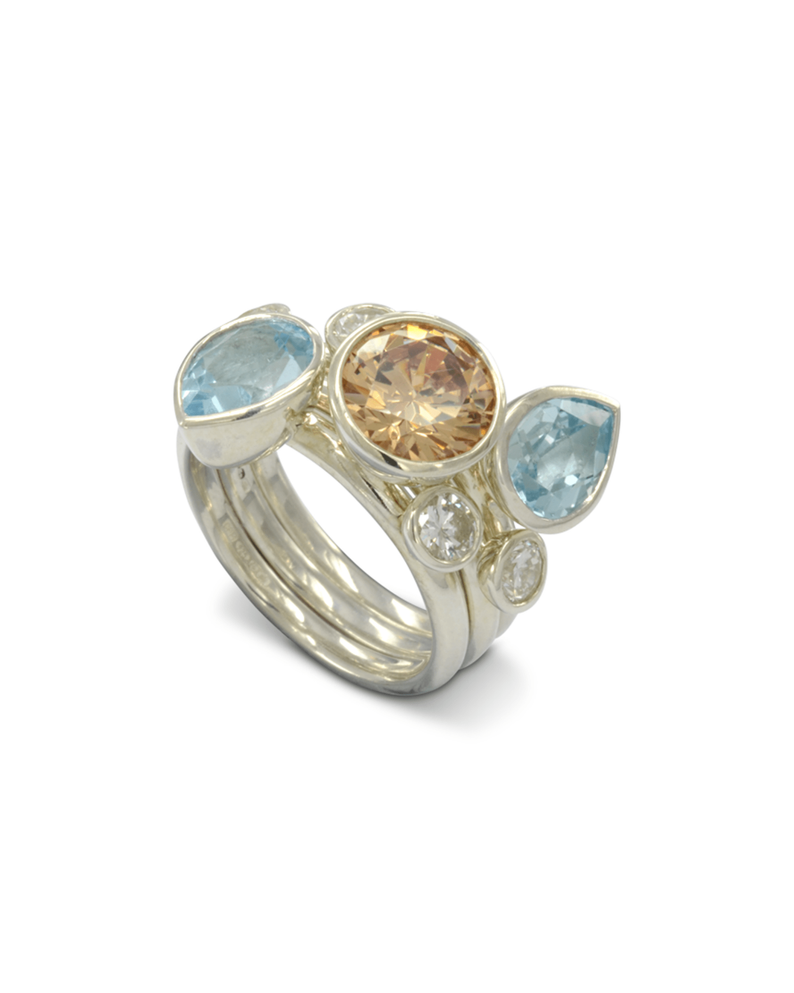 Diese Stapelringe aus Aquamarin, Diamant und Citrin bieten eine einzigartige und kreative Möglichkeit, eine Kombination von Edelsteinen zu präsentieren. Die Ringe sind handgefertigt aus 9 Karat Weißgold und verfügen über markante Schalenfassungen, die dem Design einen Hauch von Eleganz verleihen.