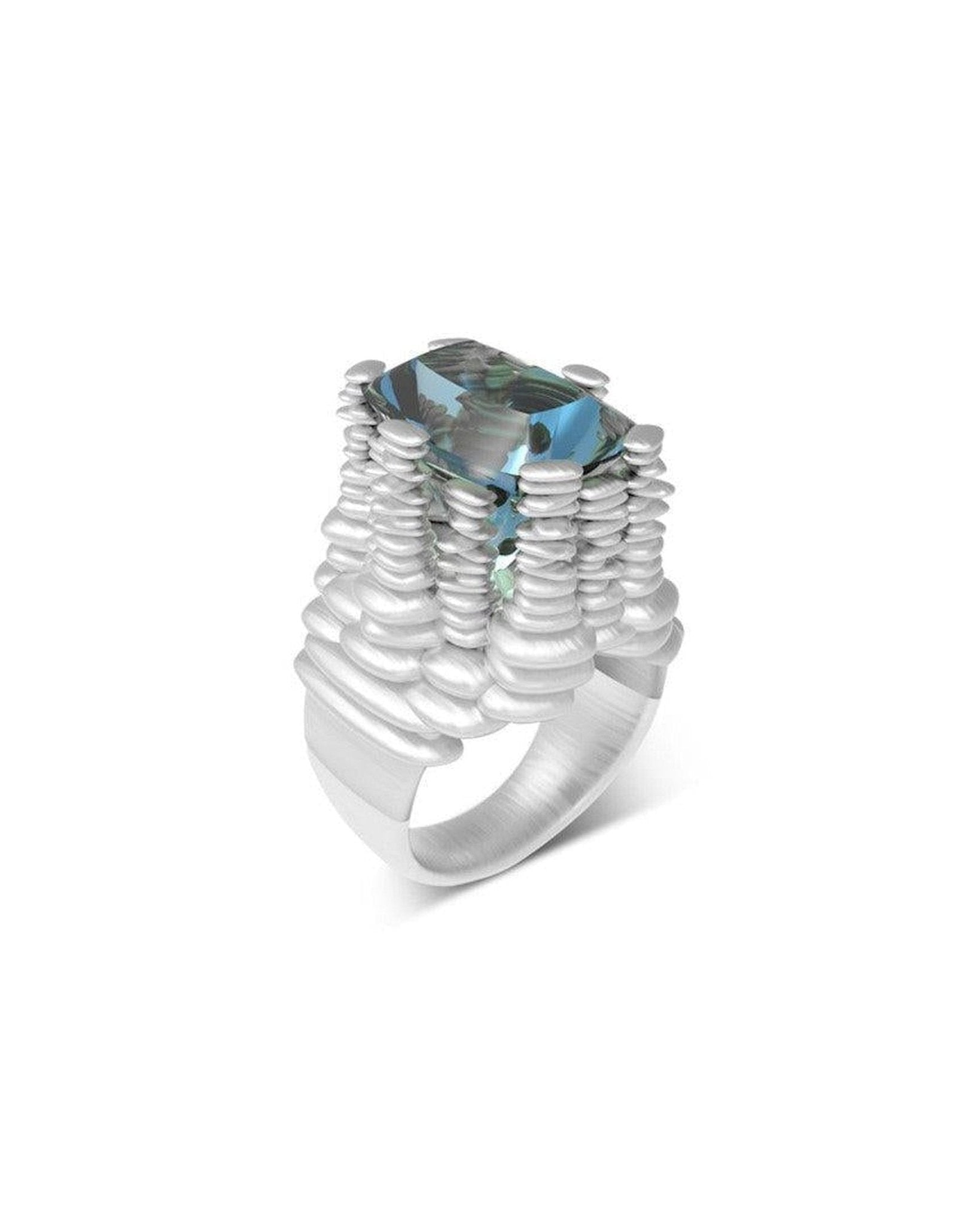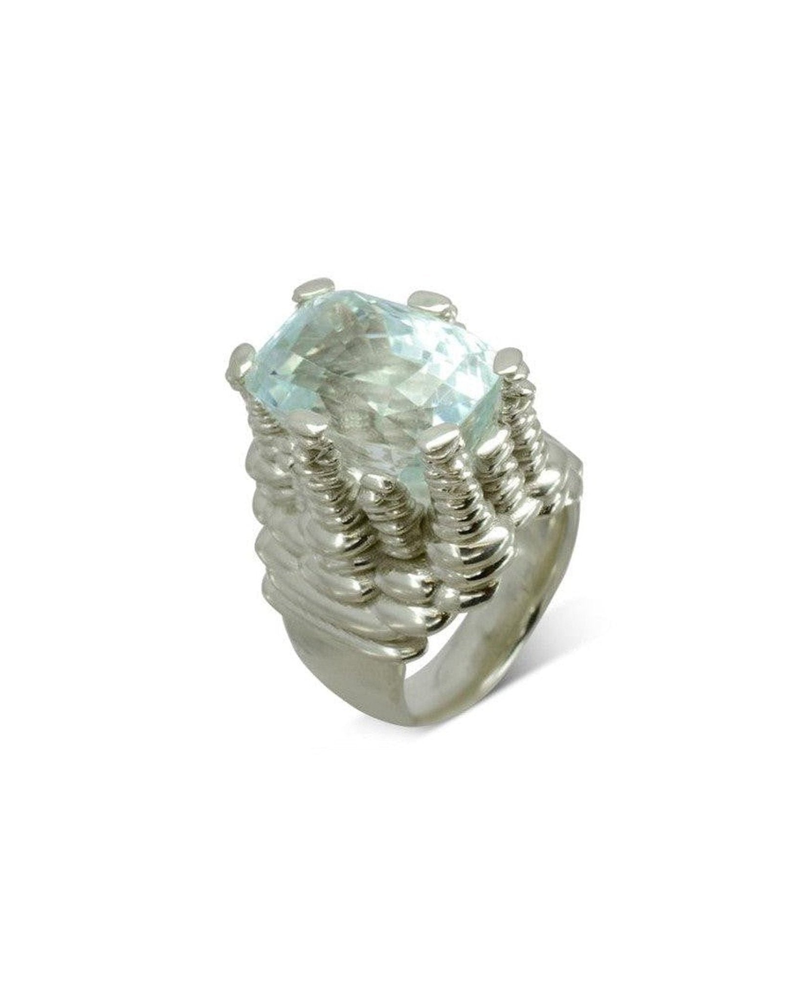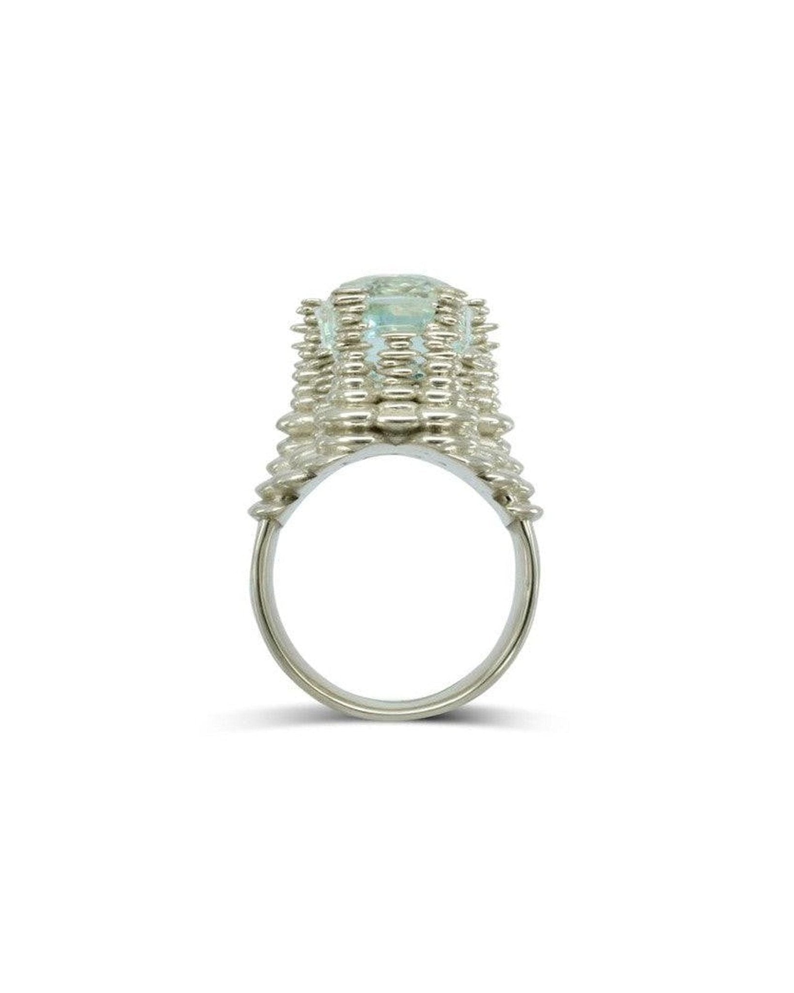 Der maßgeschneiderte Cairn Aquamarine Dress Ring ist eine maßgeschneiderte Kreation, die für einen Kunden entworfen wurde. Dieser einzigartige Ring ist ein wahres Meisterwerk, das den außergewöhnlich großen Aquamarin des Kunden mit kreativem Design kombiniert, um ihn zu einem wahren Fingerkunstwerk zu machen.