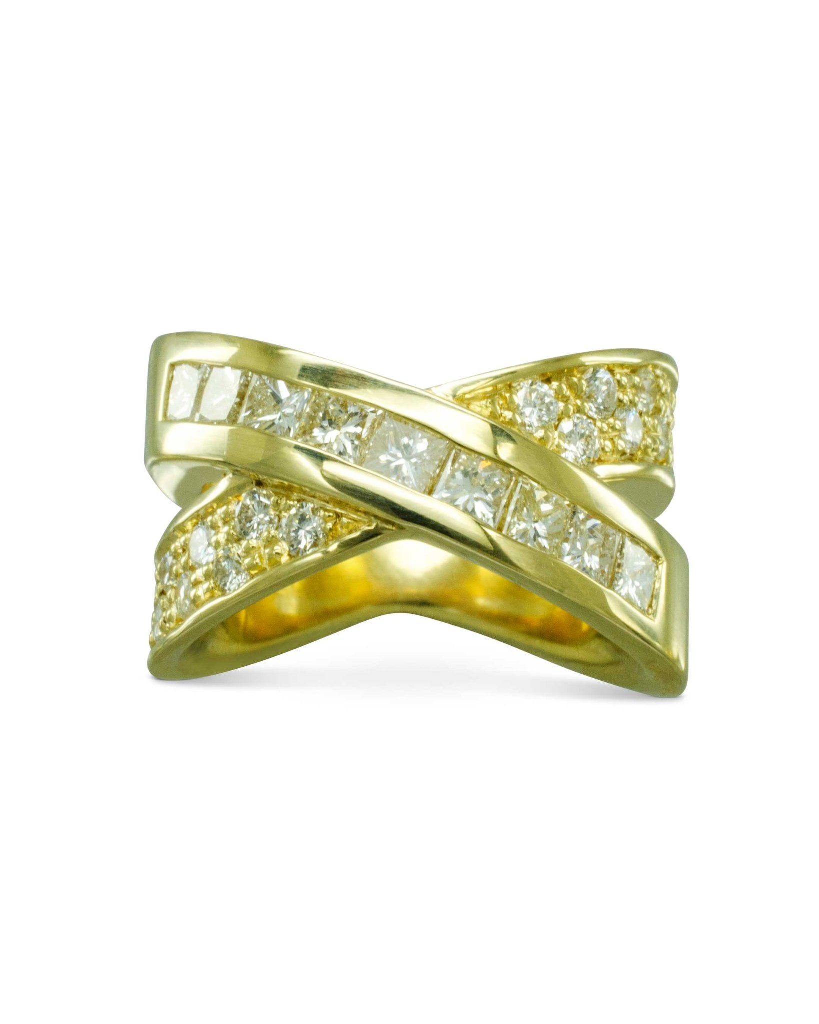 Der maßgeschneiderte Crossover Gold Diamond Ring ist ein sentimentales und zeitloses Stück, das handgefertigt aus recyceltem 18-karätigem Gelbgold hergestellt wurde. Dieser einzigartige Ring ist eine wunderschöne Verkörperung der Bewahrung des Erbes geerbten Schmucks und verbindet nahtlos die Vergangenheit mit der Gegenwart.