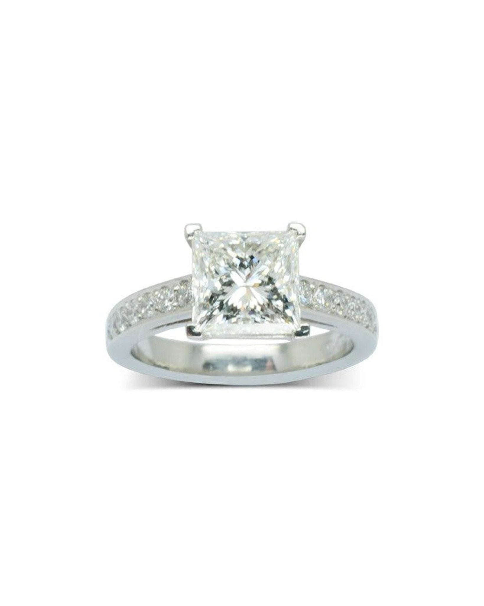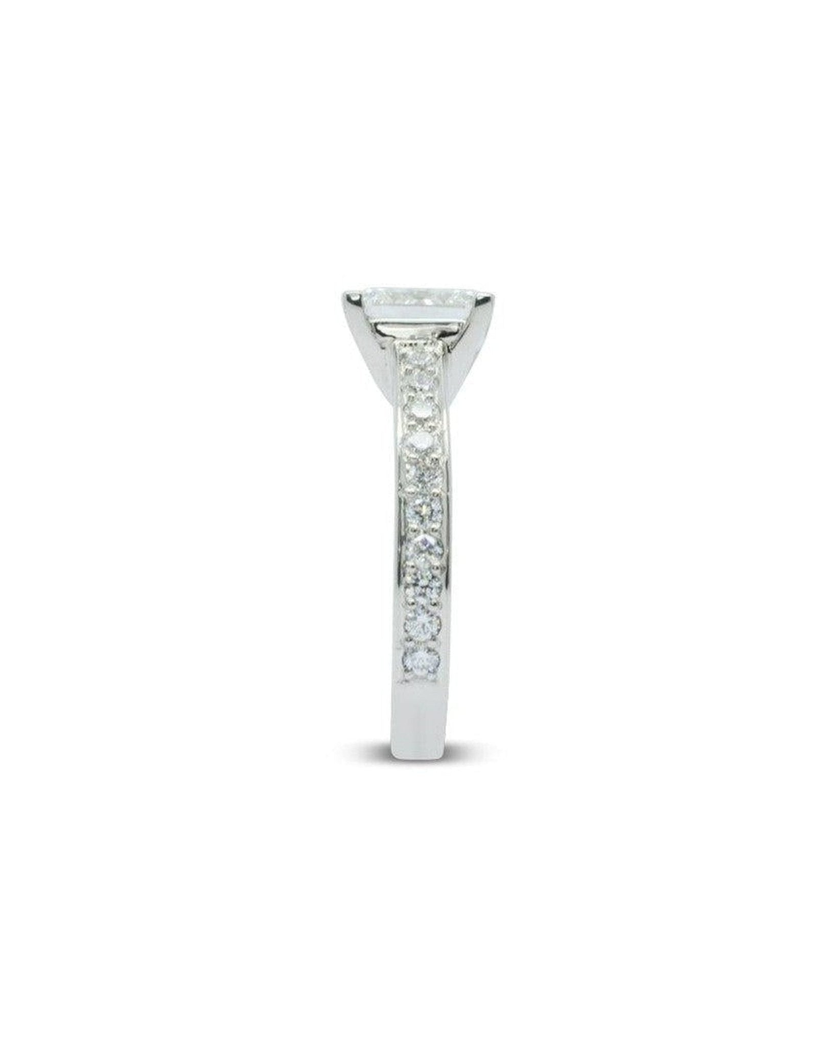 Der mit vier Krappen besetzte Diamant-Verlobungsring im Prinzessschliff verbindet nahtlos traditionellen Charme mit einem modernen Touch und verfügt über einen zarten, mit Diamanten besetzten Ring, der anmutig im Licht funkelt.