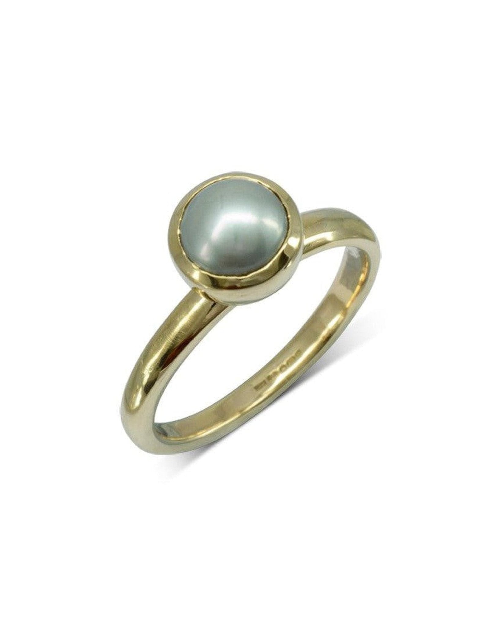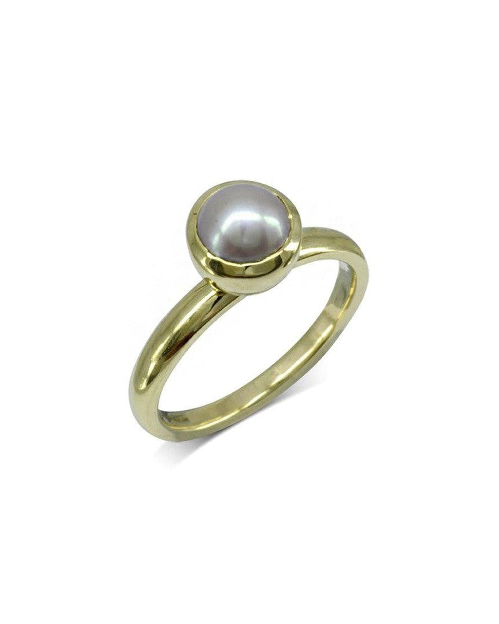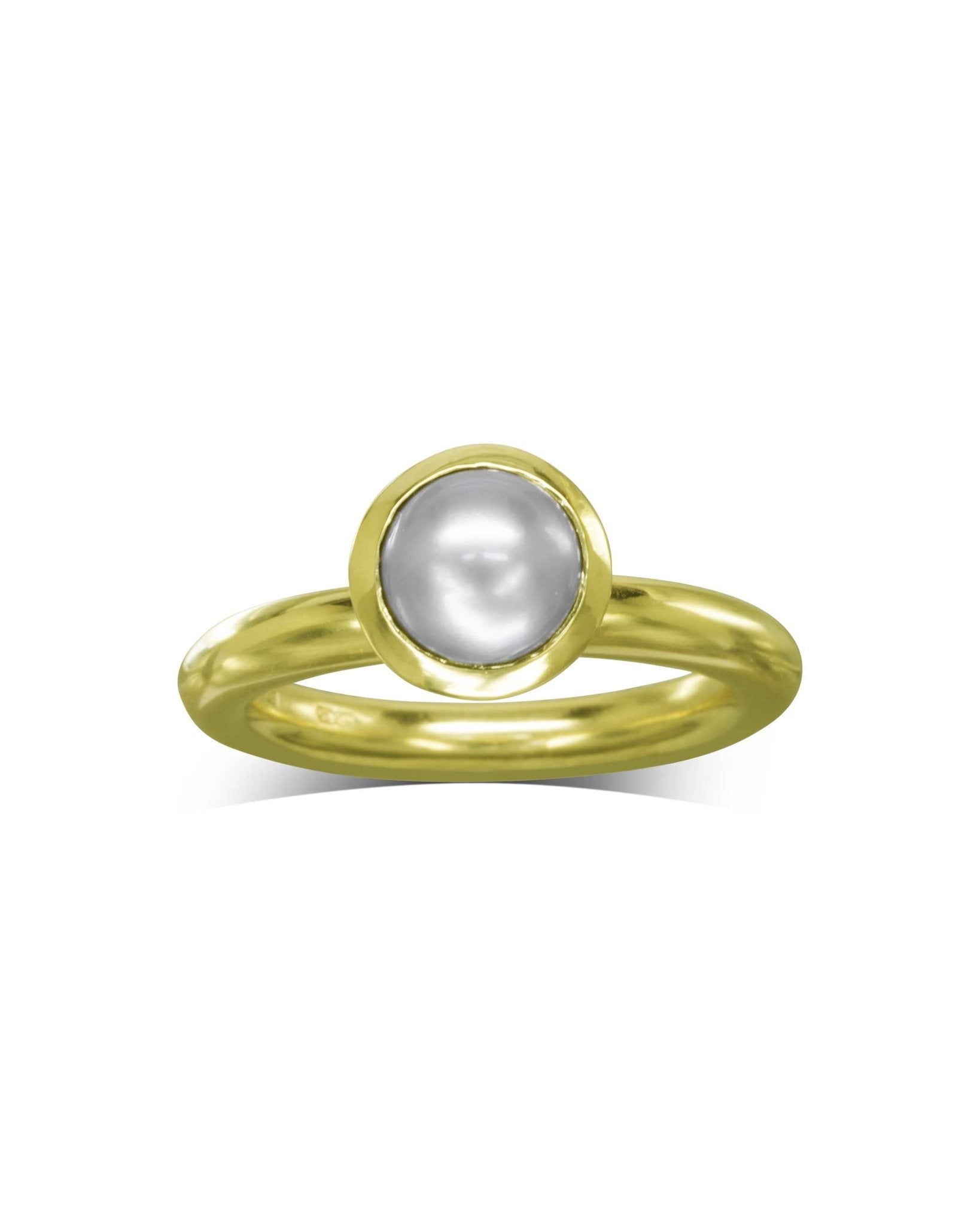 Der runde, farbige Perlengoldring wurde entworfen, um die klassische Schönheit einer runden Perle hervorzuheben. Dieser elegante Ring verfügt über eine „Eichel“-Fassung.