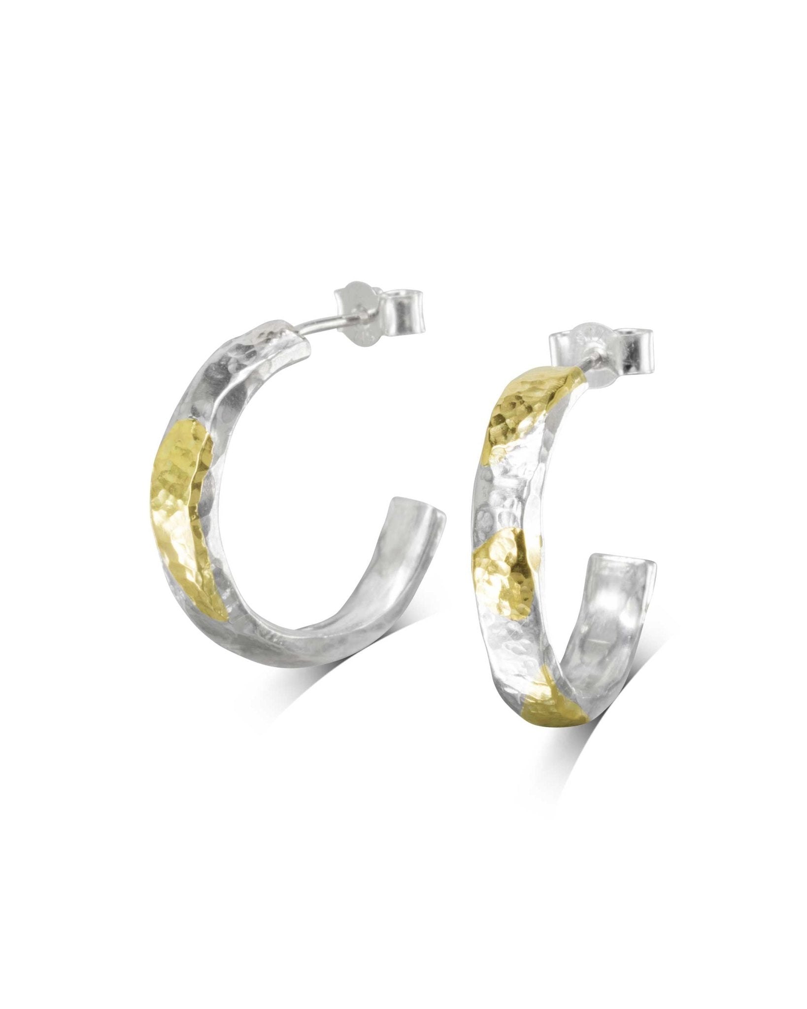 The Hammered Silver and Gold Hoop Earrings combine the beauty of silver and yellow gold. These earrings offer a stunning two-tone effect in an eye-catching and elegant design.
