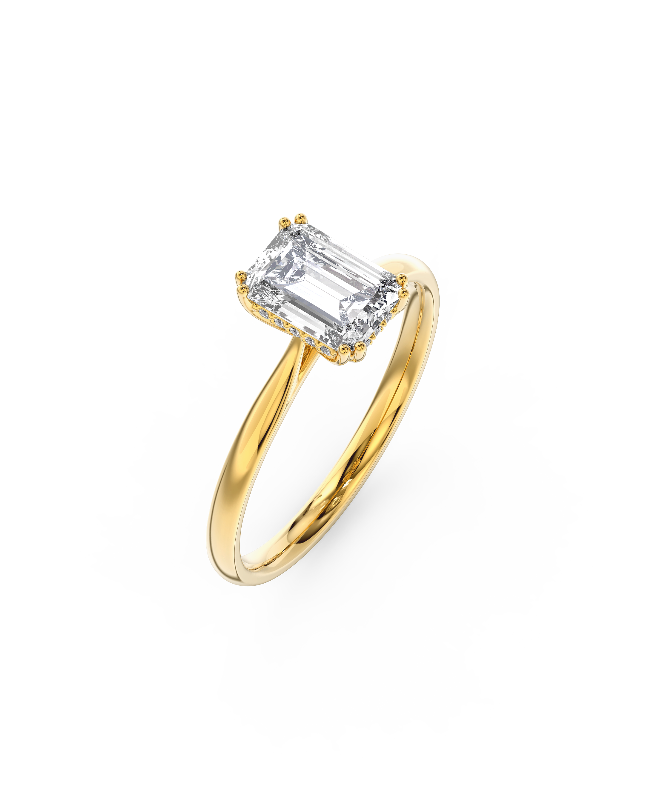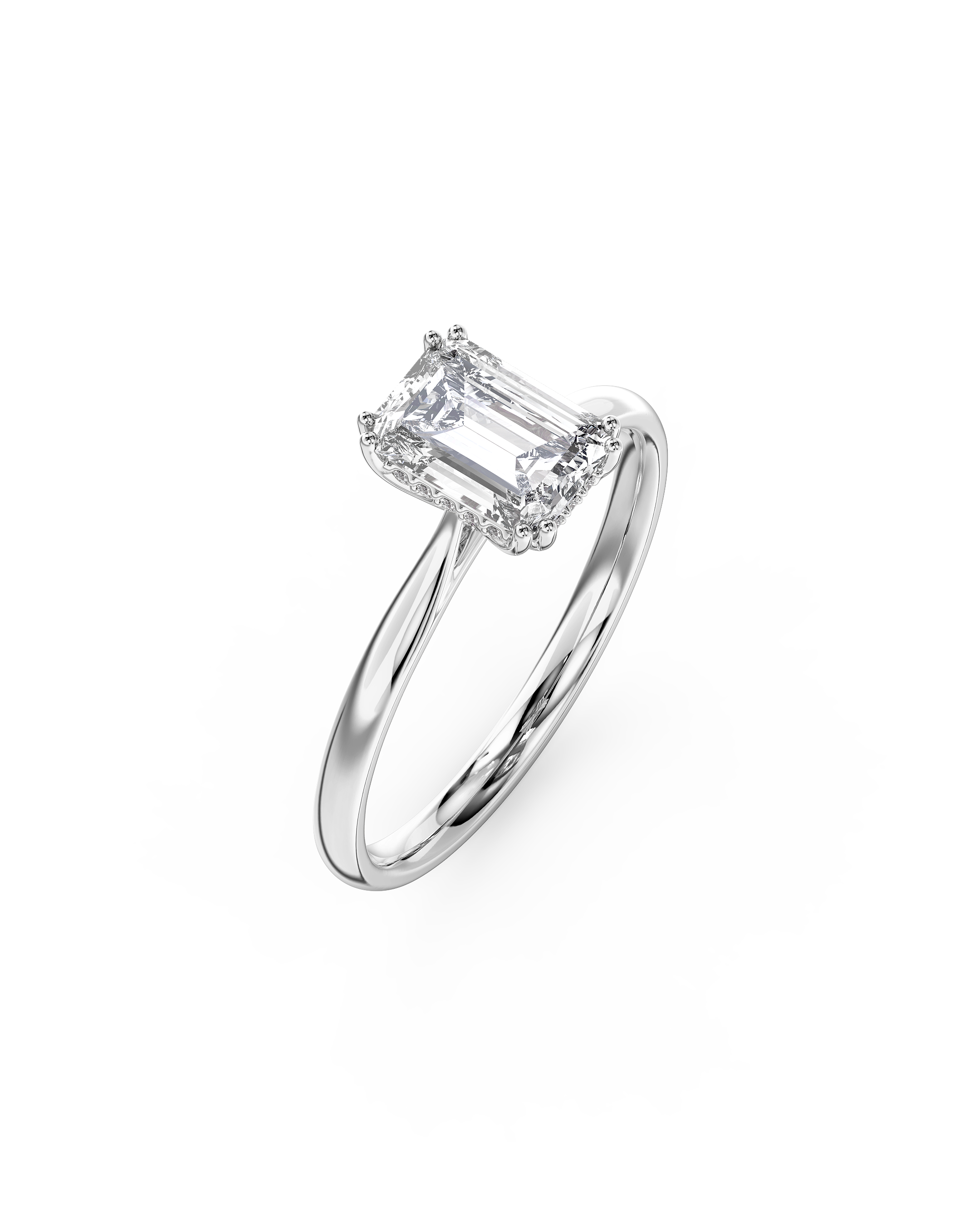 From above, a vivid emerald takes centre stage — but look closer, and you’ll discover a delicate halo of hidden diamonds encircling the base of the setting. Our Emerald Hidden Halo Engagement Ring is handmade to order, combining clean, modern lines with an unexpected layer of brilliance, giving the ring a subtle glow that reveals itself as you move.
