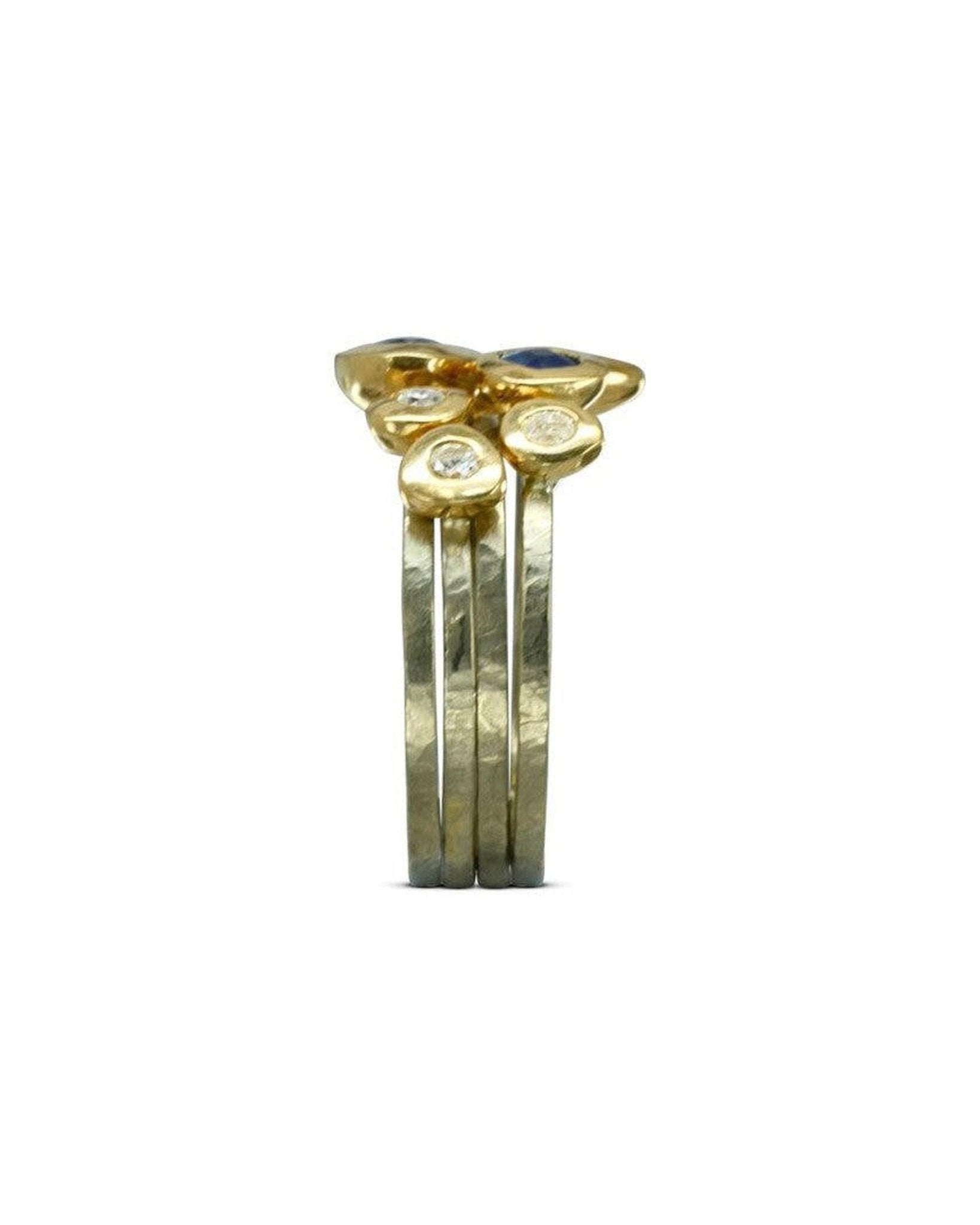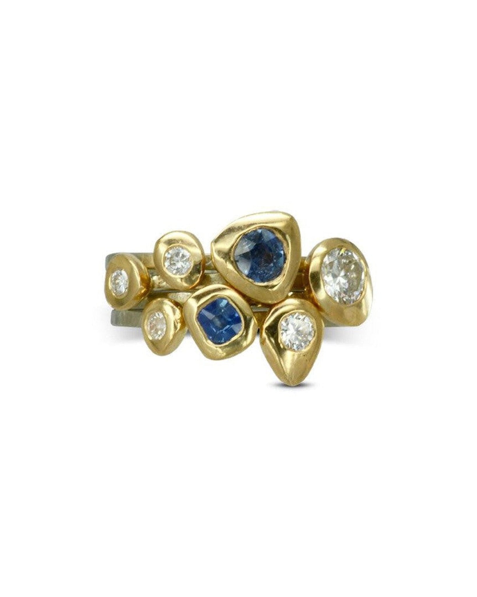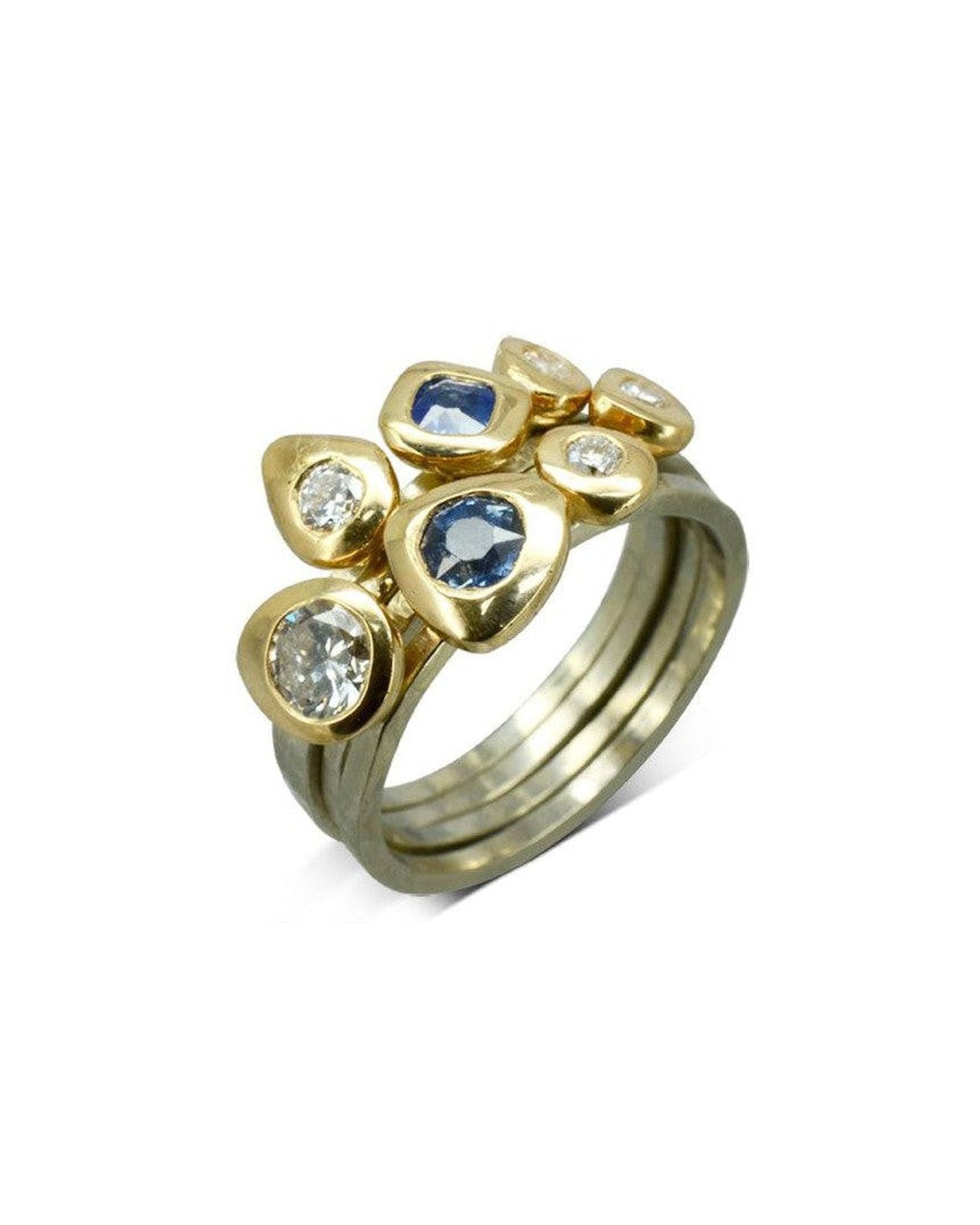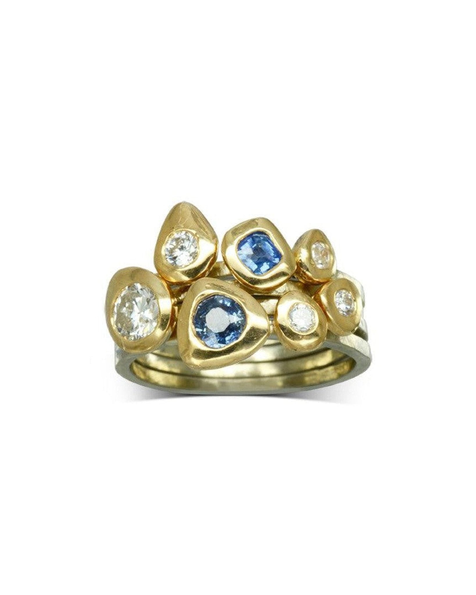 The Pebble Sapphire and Diamond Stacking Ring features sapphires and old-cut diamonds set into 18ct gold pebble settings, resulting in a harmonious blend of colours and shapes.