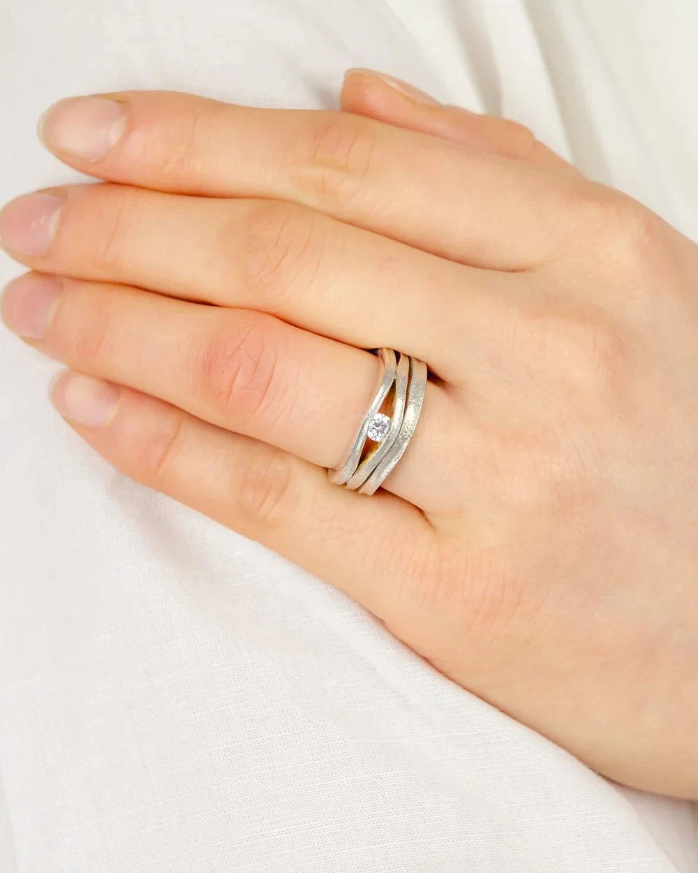 The Platinum Diamond Three Strand Trap Eternity Ring is inspired by pebbles trapped in wood along the Sussex coastline. The cool tones of the chalk cliffs are subtly combined for an organic look.