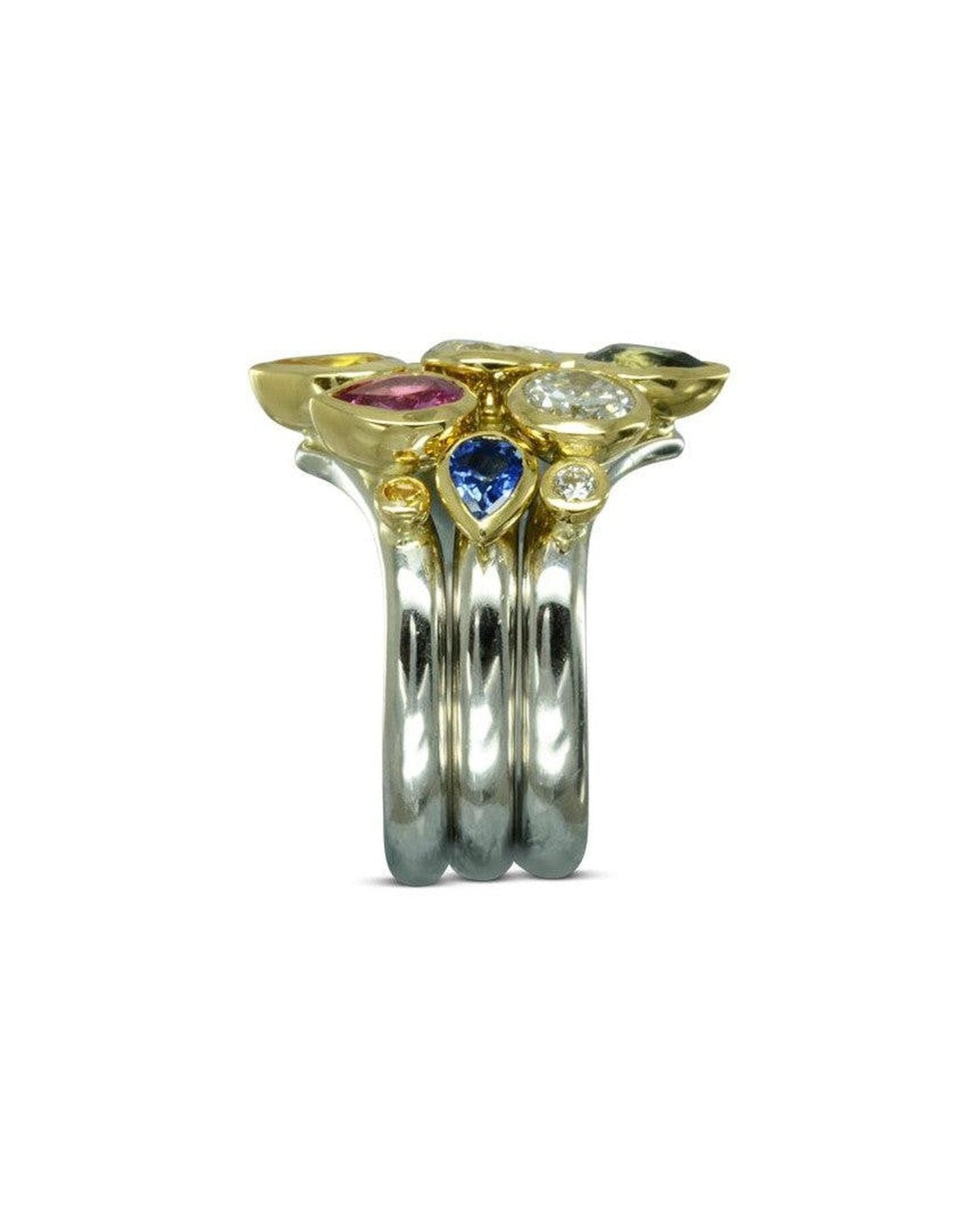 The Peacock Colourful Sapphire Stacking Ring blends precious metals with vibrant gemstones in an eye-catching design.