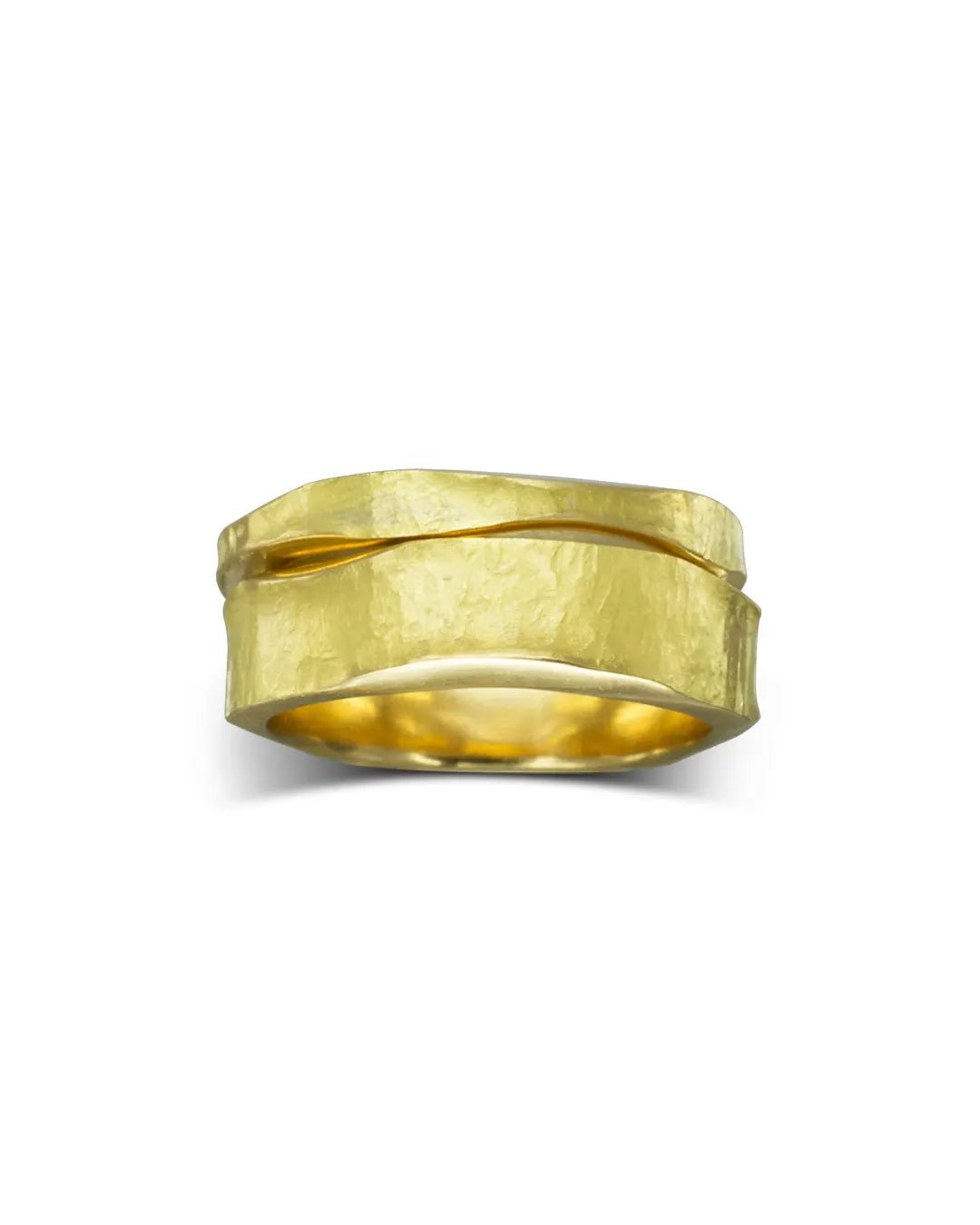 The Side Hammered Double Yellow Gold Ring (Wide) is visually dynamic and unforgettable.