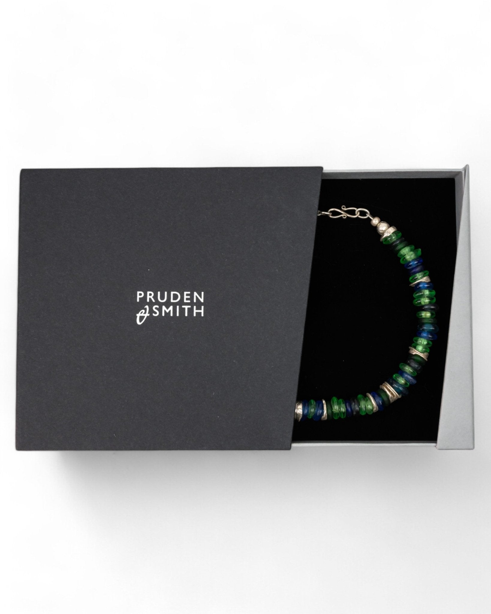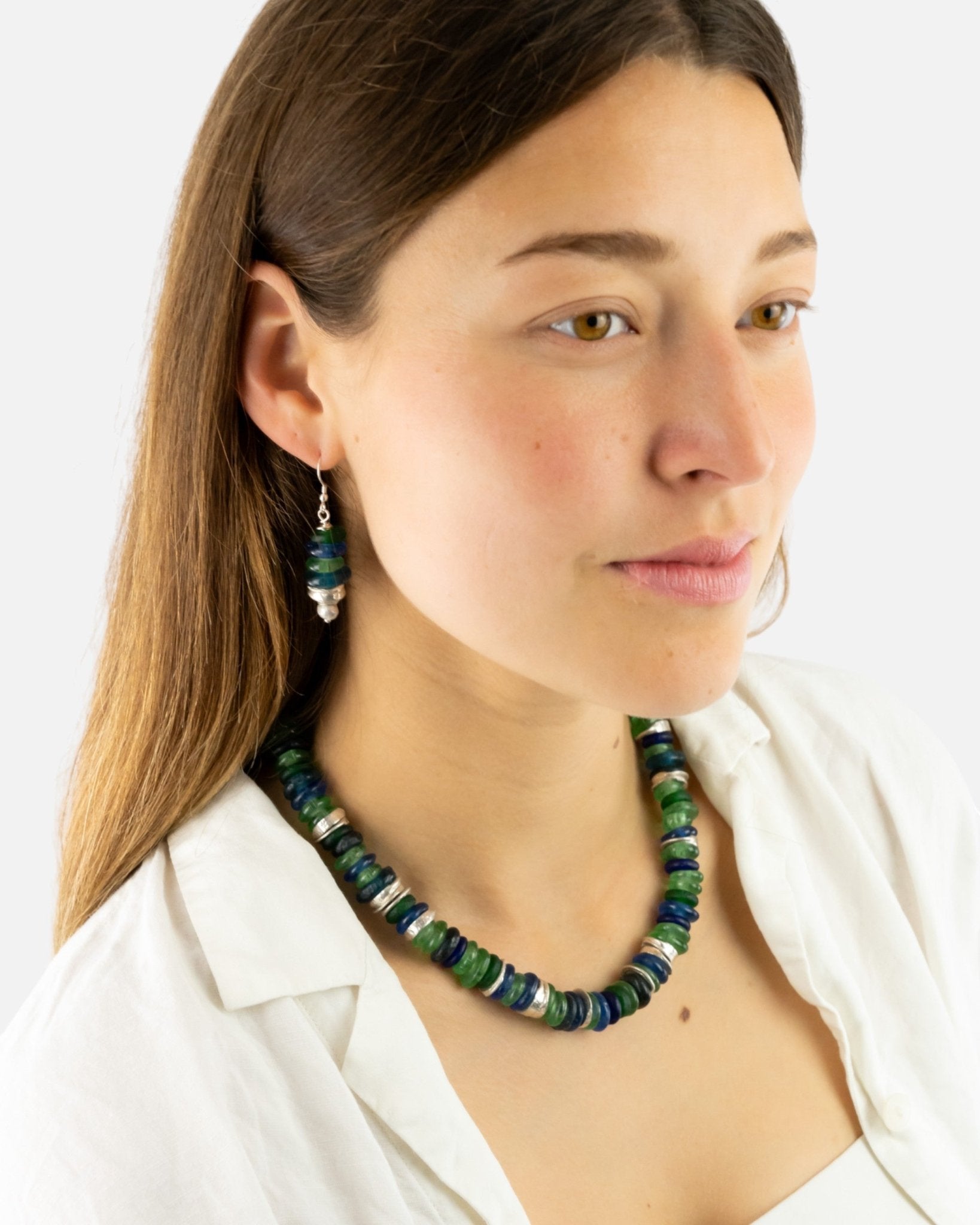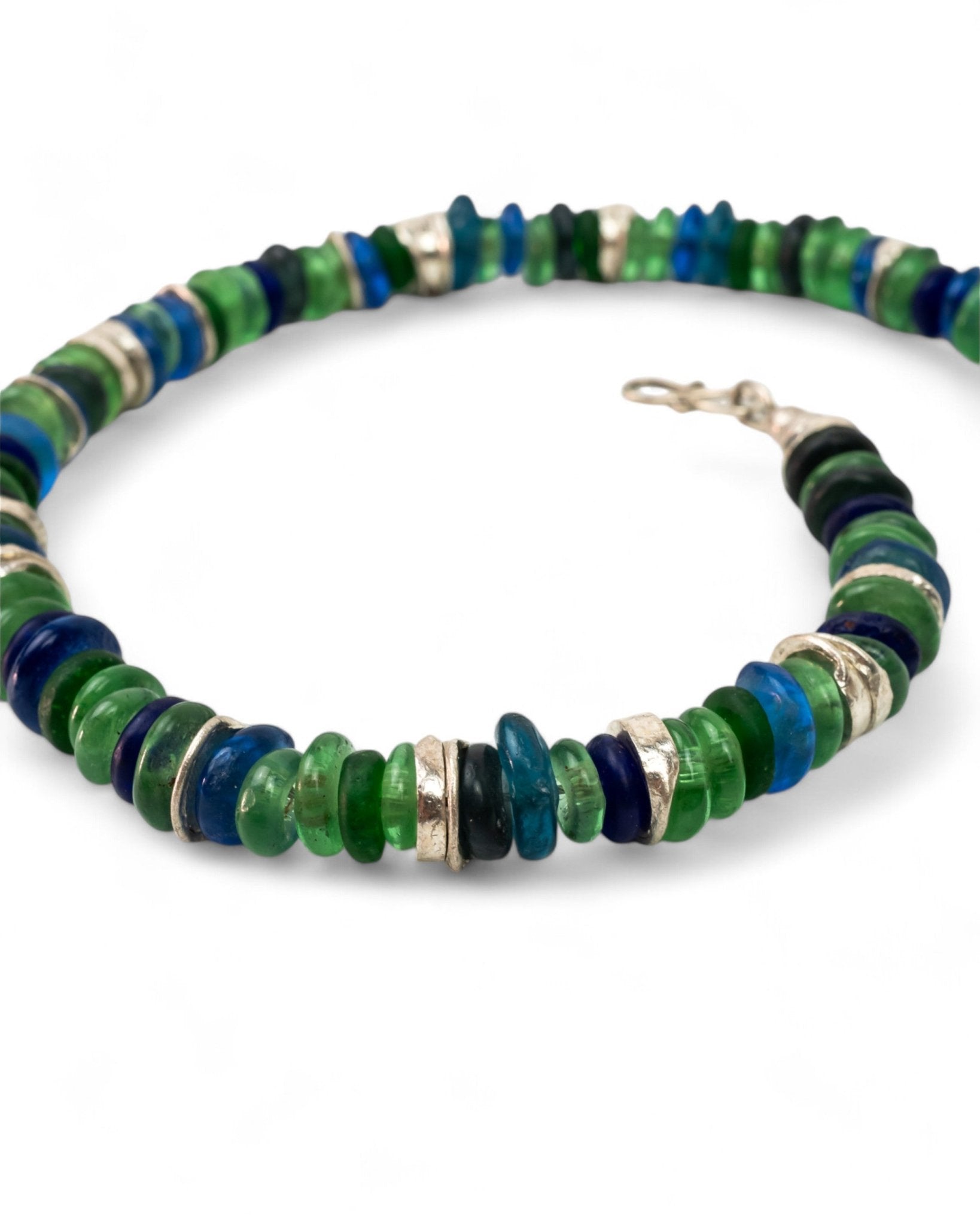 The African Recycled Blue Glass Bead Necklace is a vibrant and eco-friendly statement piece that combines the rich history of Ghana's glass-making tradition with handmade silver discs.