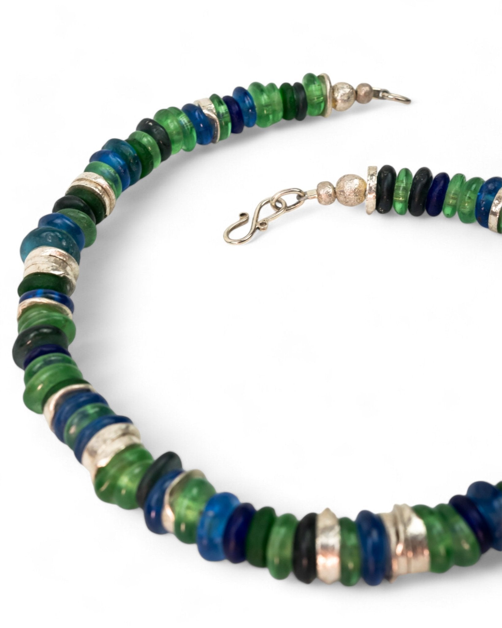 • Handmade Irregular Silver Discs: Along with the glass beads are irregular silver discs, each handmade to add a touch of texture and uniqueness to the African Recycled Glass Bead Necklace.