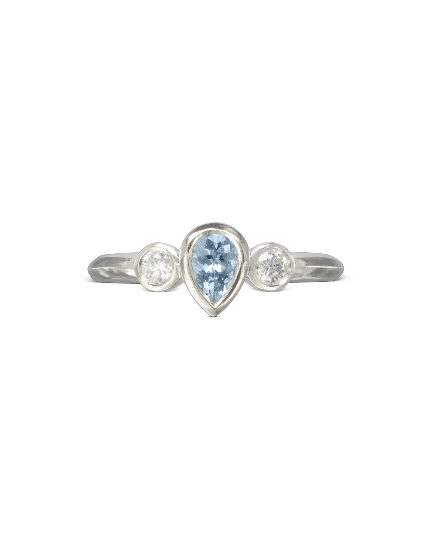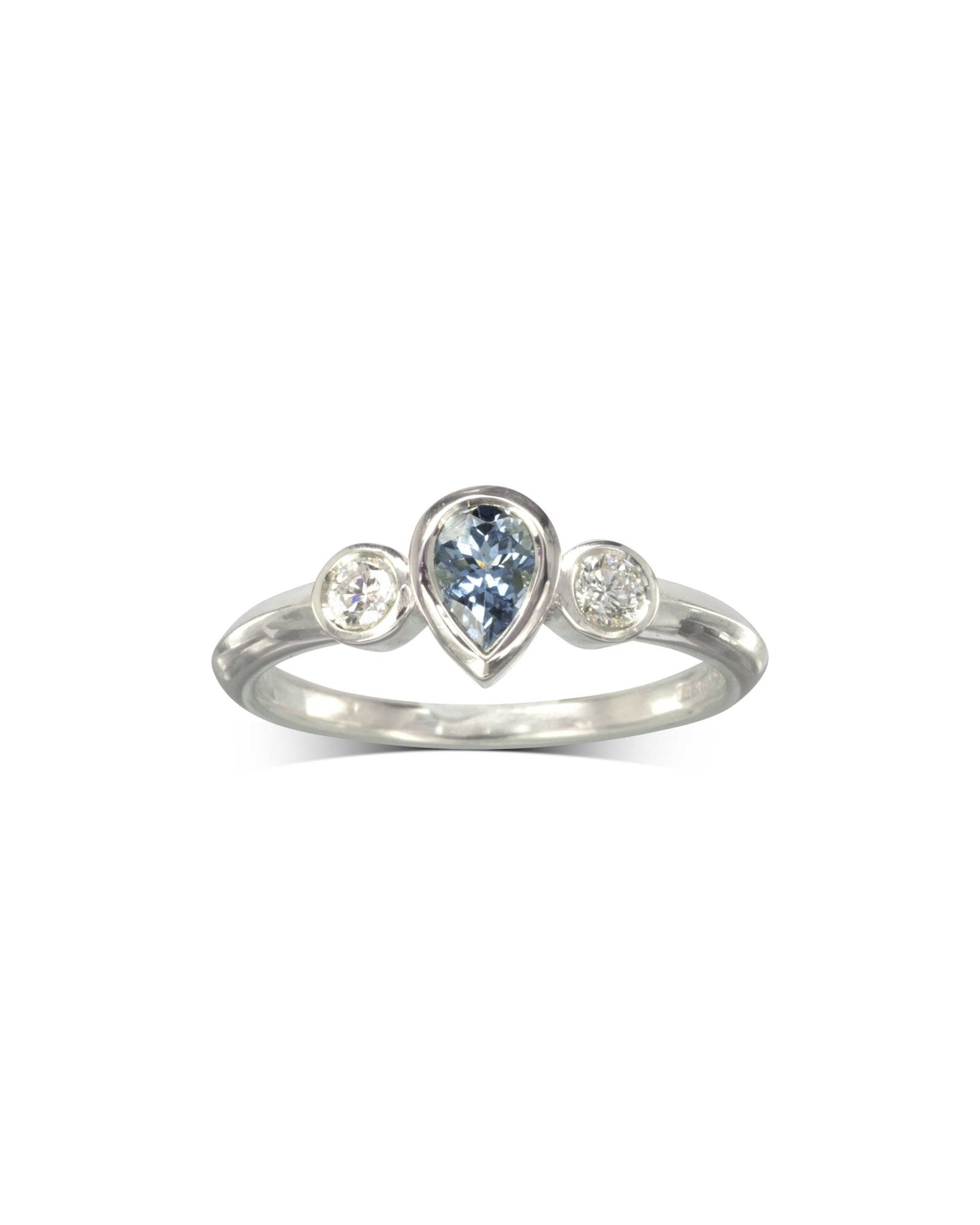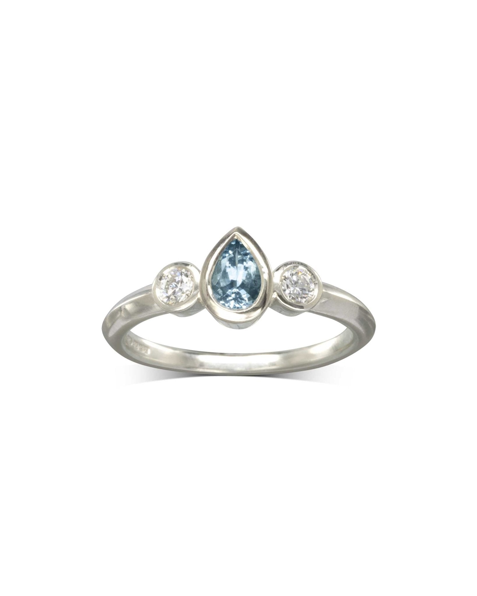• Aquamarine Brilliance: Pictured is a ring set with a 6x4mm pear-shaped aquamarine with two 3mm round (0.10pt) brilliant cut diamond sides.
