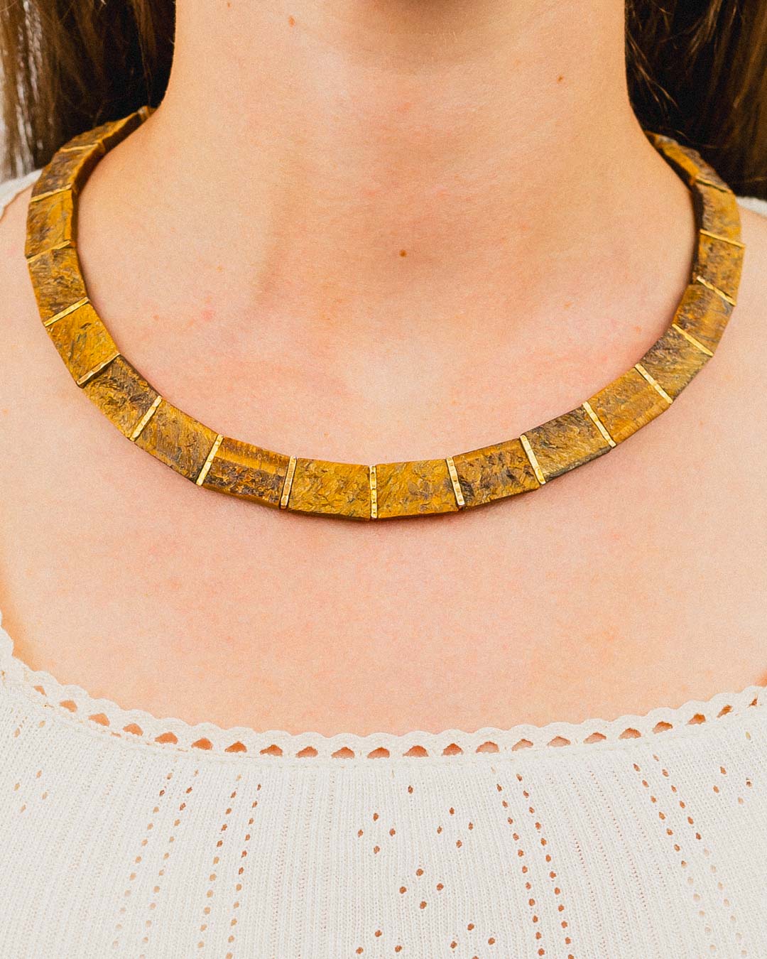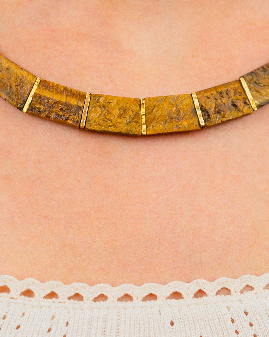 The Tiger's Eye Collar Necklace combines the rugged beauty of rough-cut tiger's eye with the gold vermeil and handmade silver components.