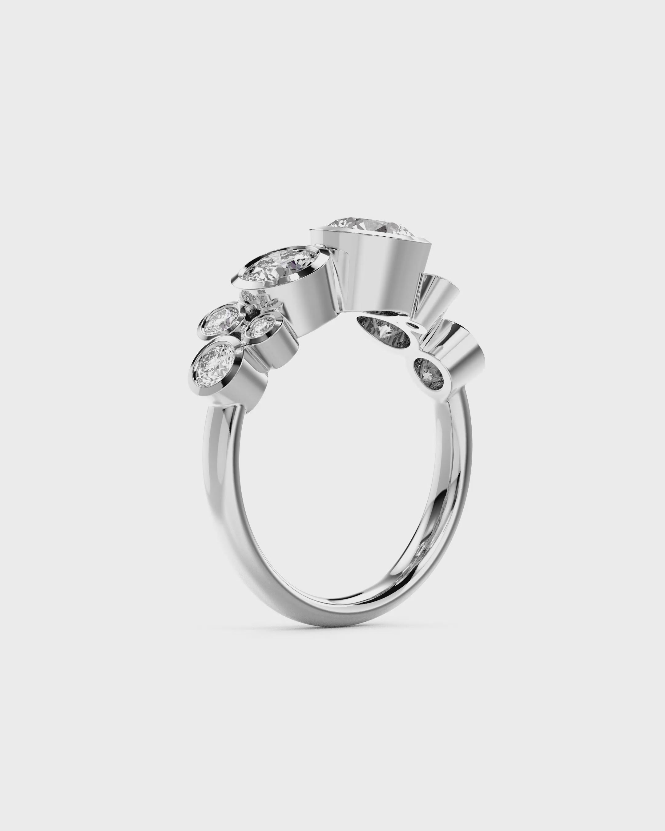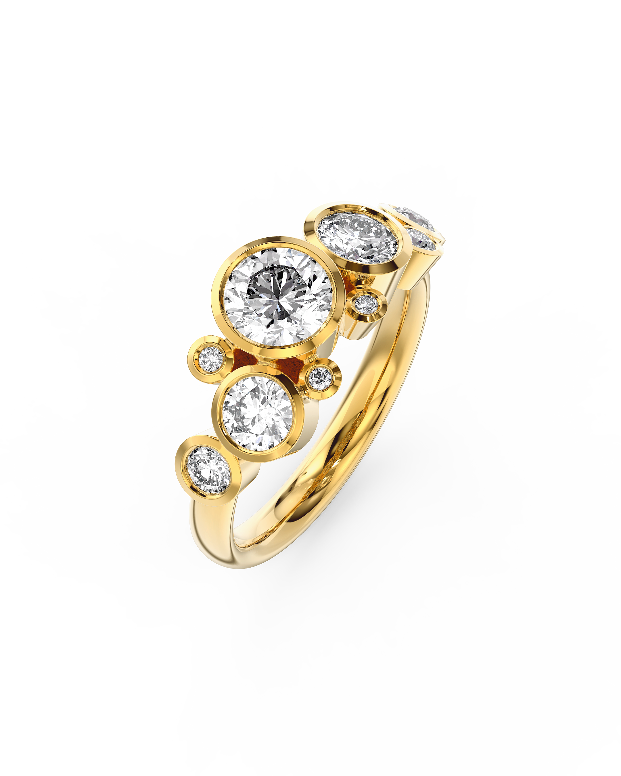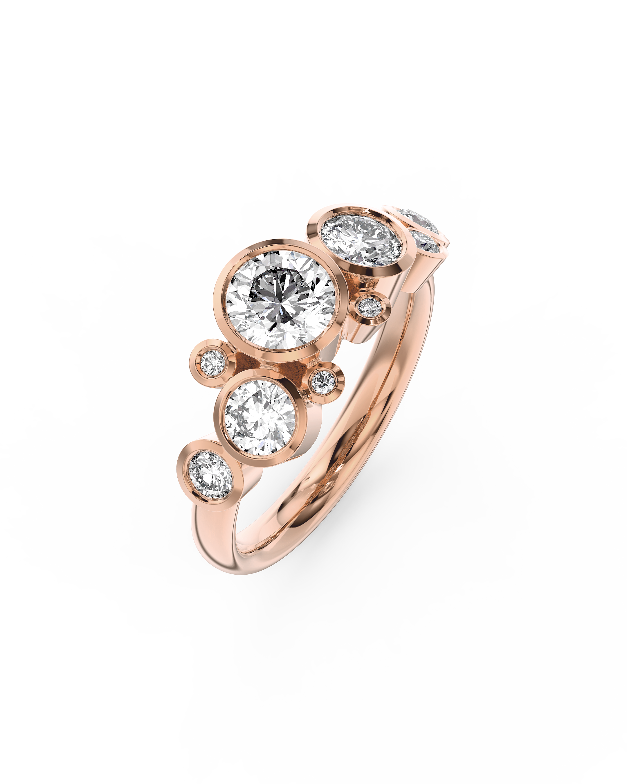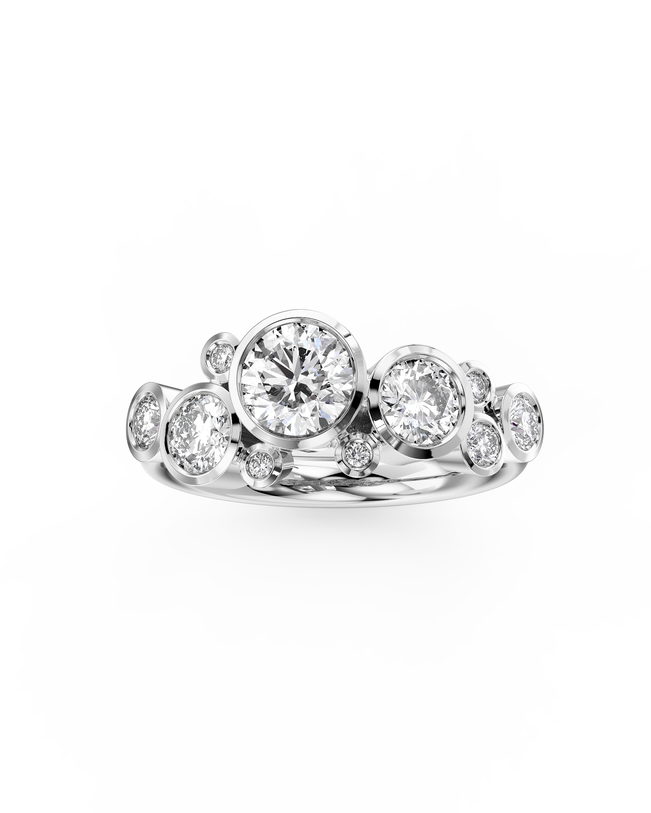 The Large Round Water Bubbles Engagement Ring features your choice of a 0.75ct natural or 1ct lab-grown centre diamond, surrounded by a scattering of smaller diamonds thoughtfully arranged in a perfectly balanced design. The additional diamonds have a total weight of 0.69ct, bringing the overall diamond weight to approximately 1.44ct for the natural version and 1.69ct for the lab-grown. Its distinctive round form and delicate water bubble detailing catch the light beautifully, creating a captivating shimmer with every movement. Crafted to embody both elegance and individuality, this design offers a timeless expression of love and artistry.