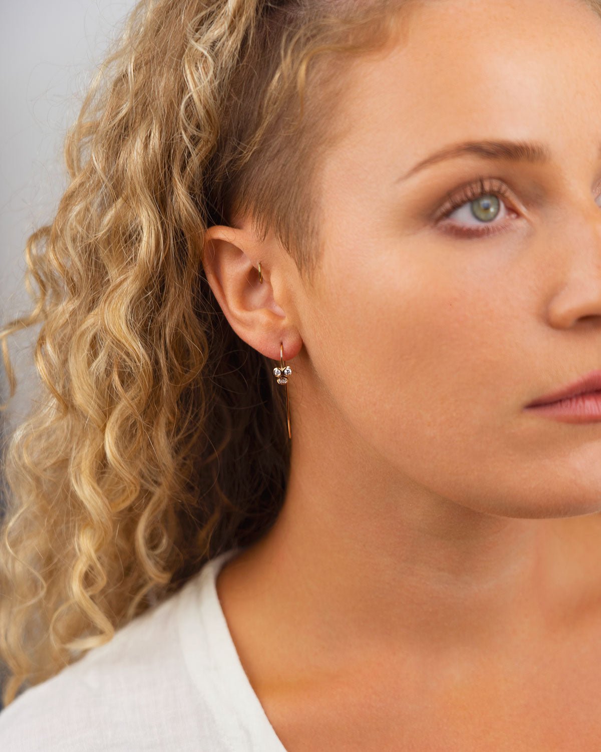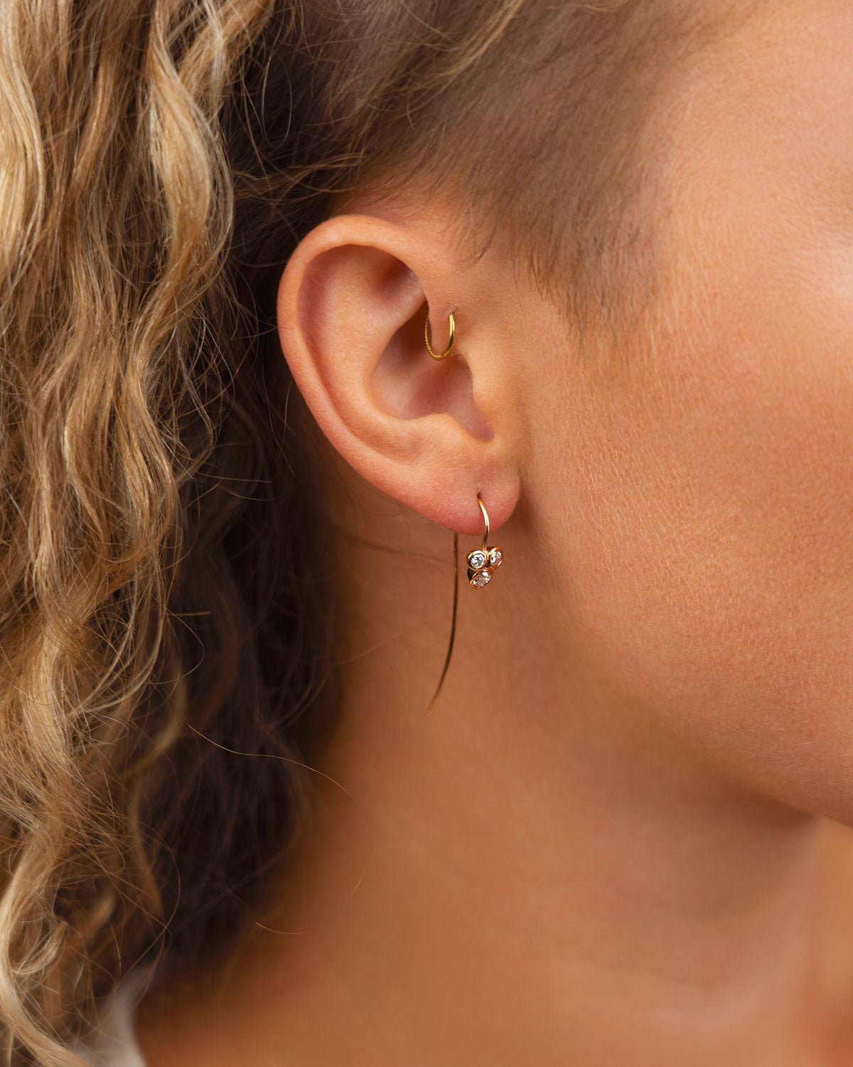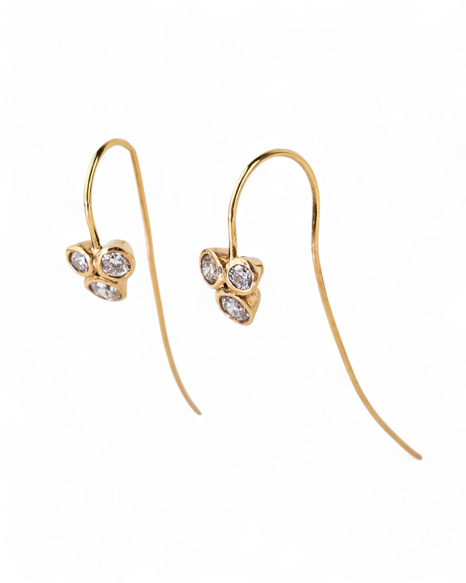 The Trefoil Yellow Gold Diamond Earrings are handmade in recycled 9ct yellow gold. With a stud width of approximately 7.5mm and a stylish long hook wire, these earrings are both elegant and environmentally responsible.