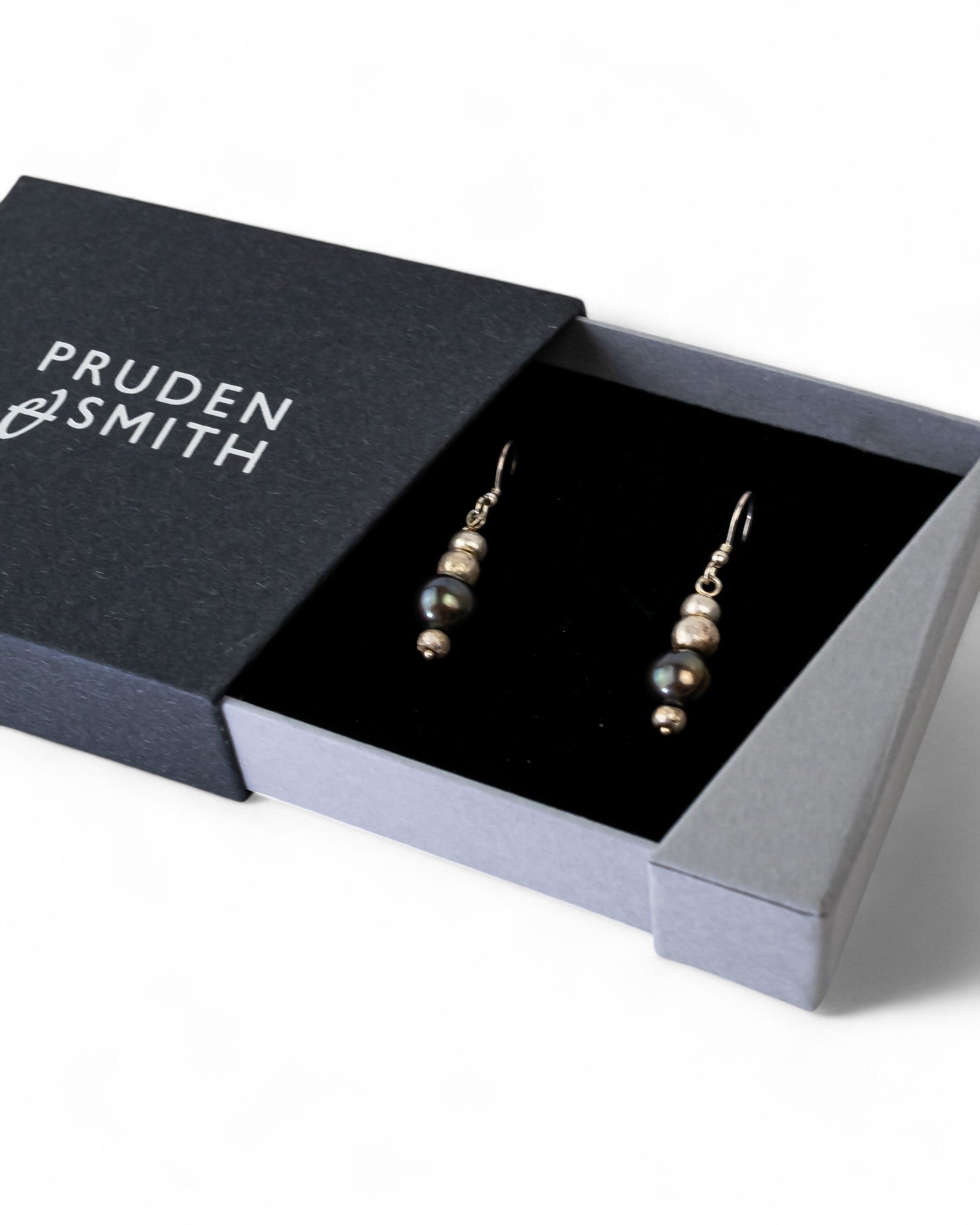 The Black Pearl Silver Nugget Dangly Earrings are an elegant and timeless addition to your jewellery collection. These earrings feature black pearls, renowned for their classic beauty, paired with tapered silver nuggets.