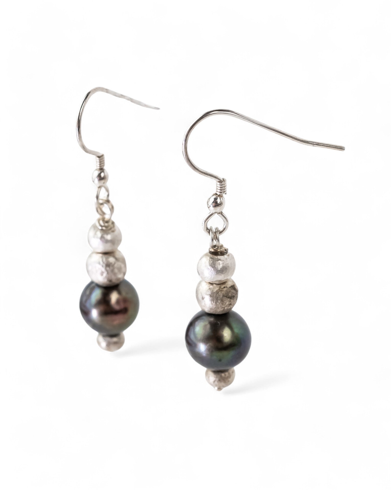 • Tapered Silver Nuggets: The tapered silver nuggets complement the pearls beautifully. Their unique shape adds depth and character to the Black Pearl Silver Nugget Dangly Earrings.