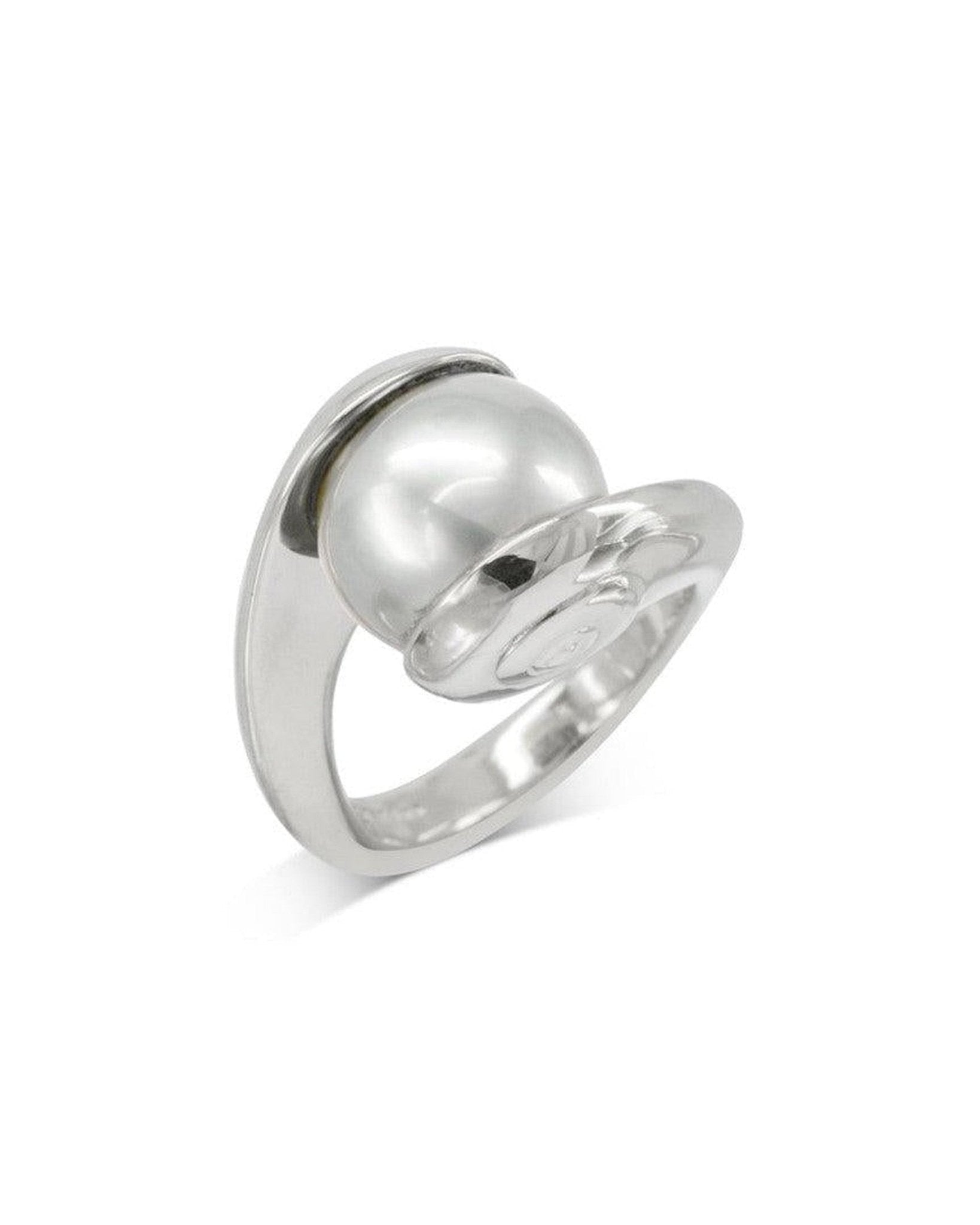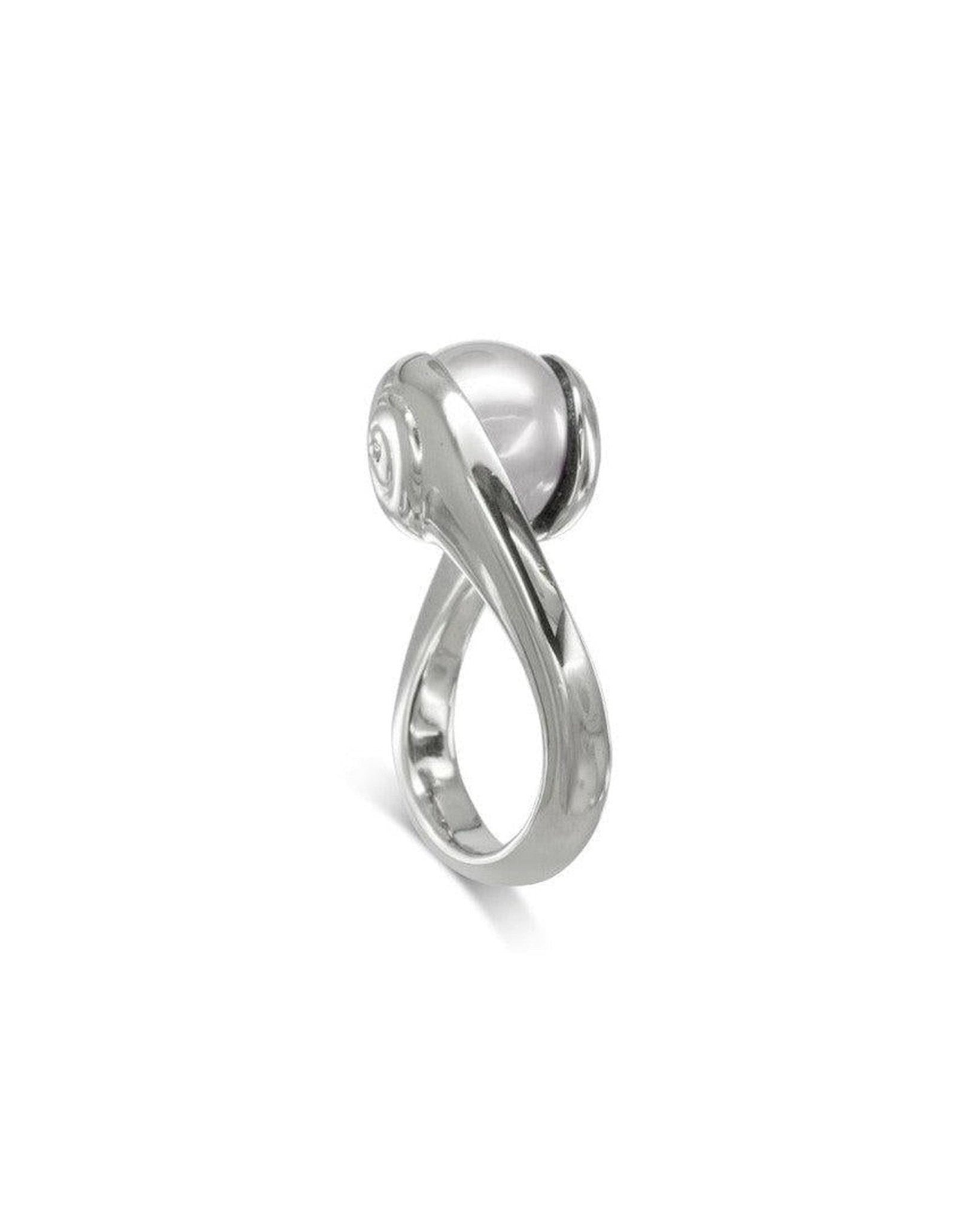 The Spiral Suspended White Pearl Ring is a unique and eye-catching design.
