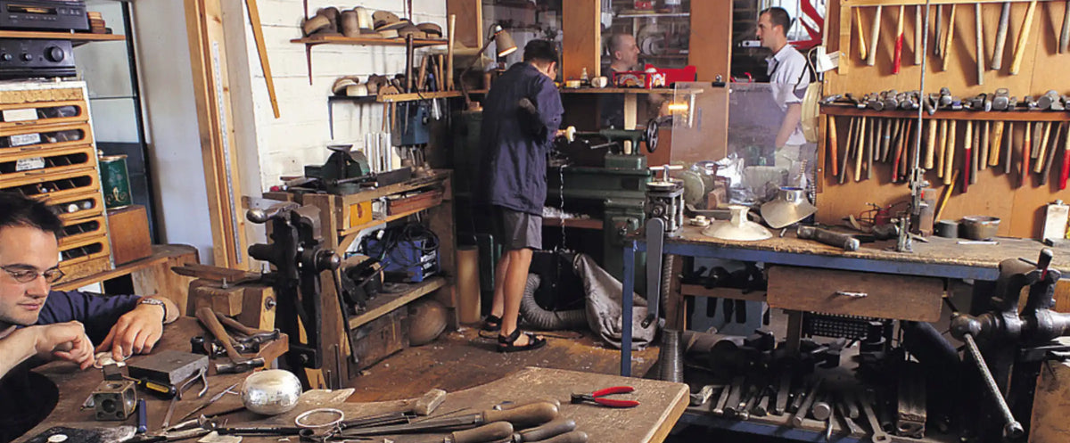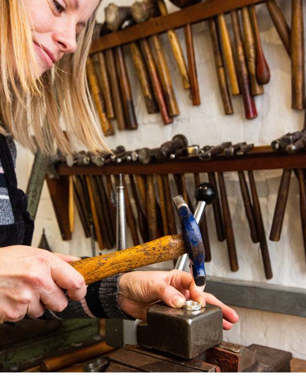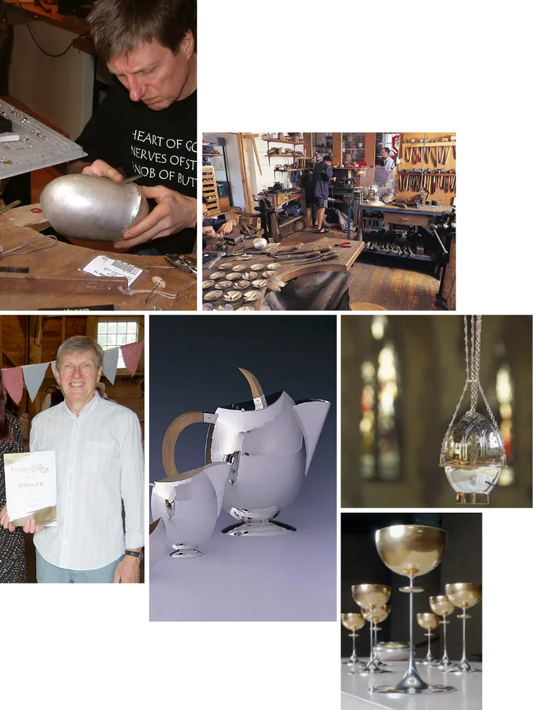Inspired by Dunstan, Anton Pruden trained as a silversmith in Gloucestershire under his aunt and uncle, Angela and Philip Lowery. Rebecca Smith, having studied Art and Design as a teenager, went on to study fine art at Farnham Art College. Their paths crossed in the workshop, leading to the creation of Pruden and Smith.