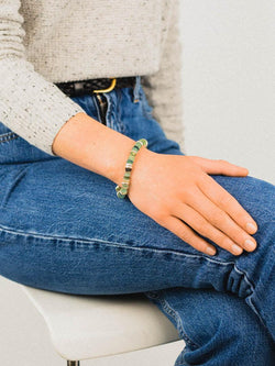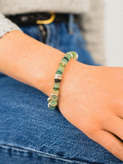 The Roman Glass Bracelet features frosted blue-green glass discs skilfully cut from buried ancient glass.