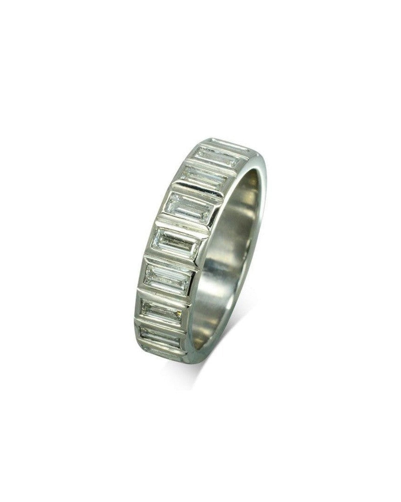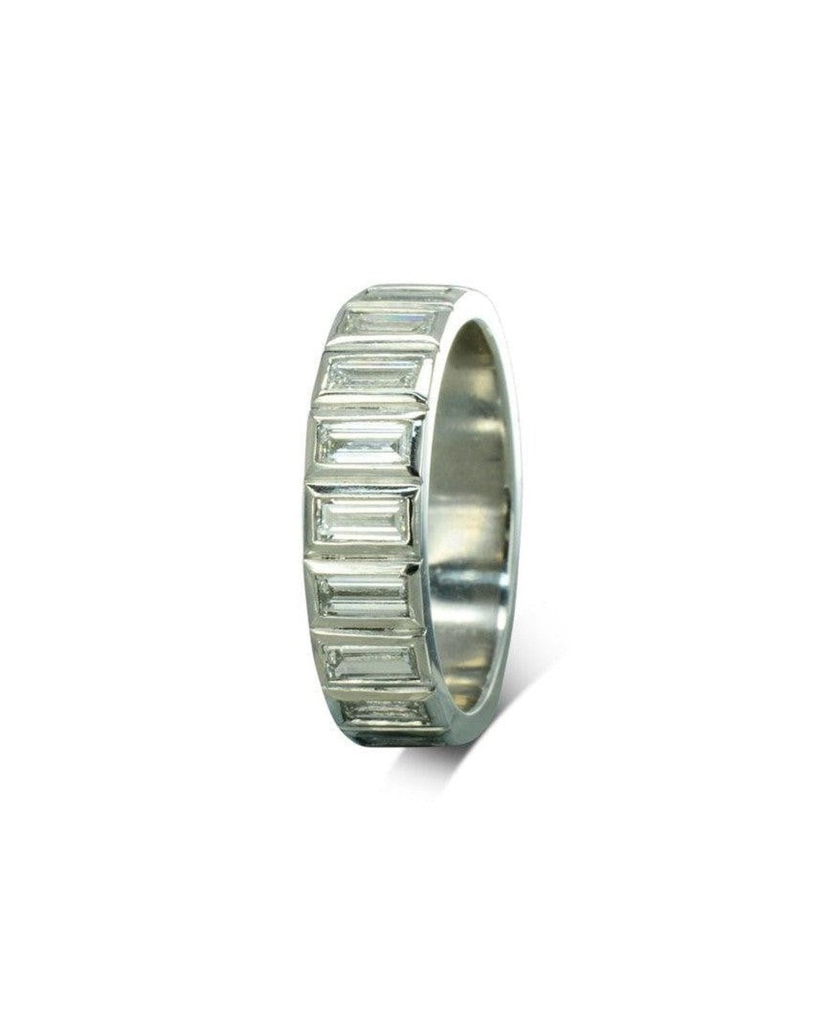 • Baguette Diamonds: This eternity ring is set with over 2cts of D-F colour VS clarity baguette diamonds, with the exact number of diamonds varying slightly based on the ring size. Each 0.12ct 4x2mm baguette cut diamond has an individually carved, angled setting edge.