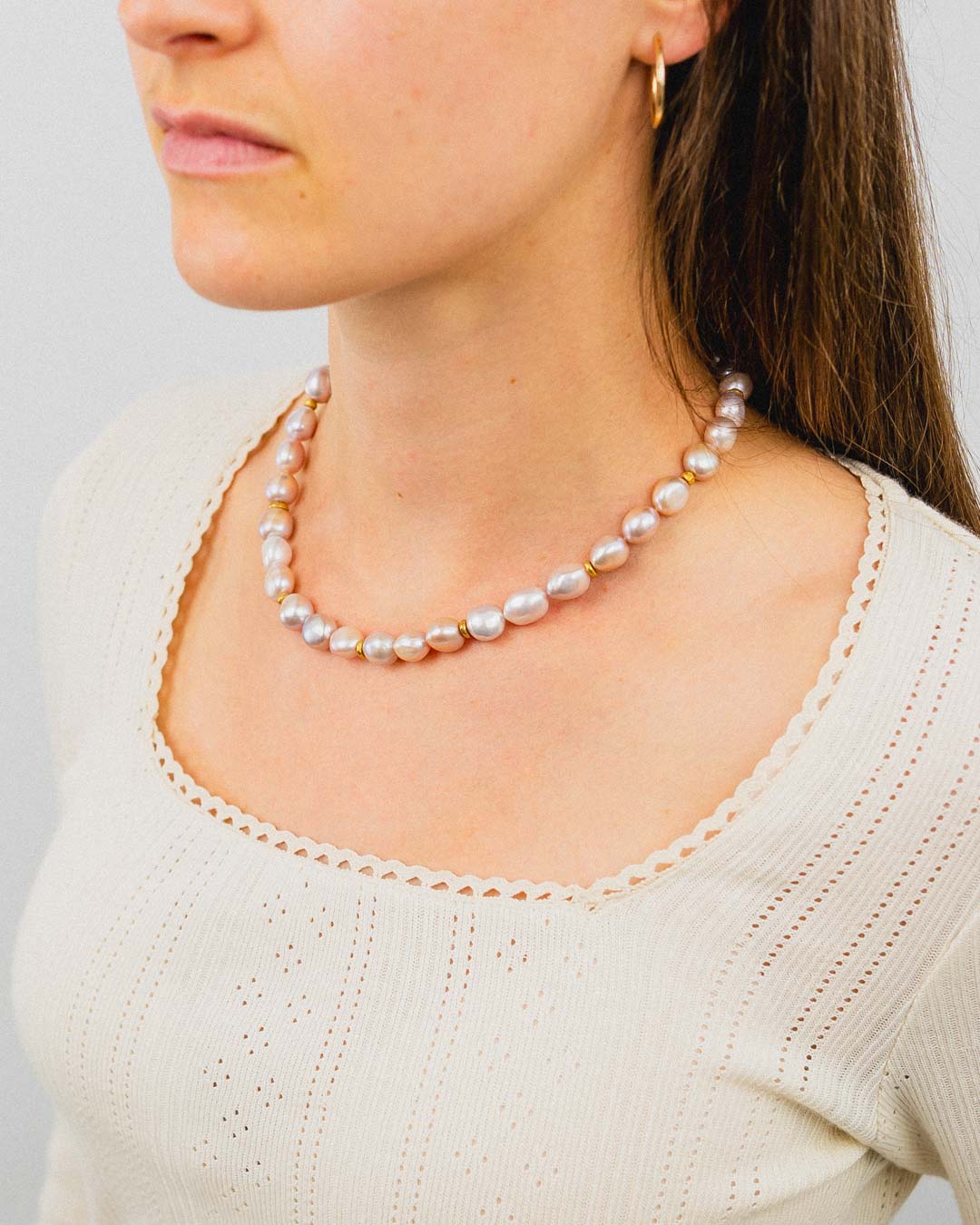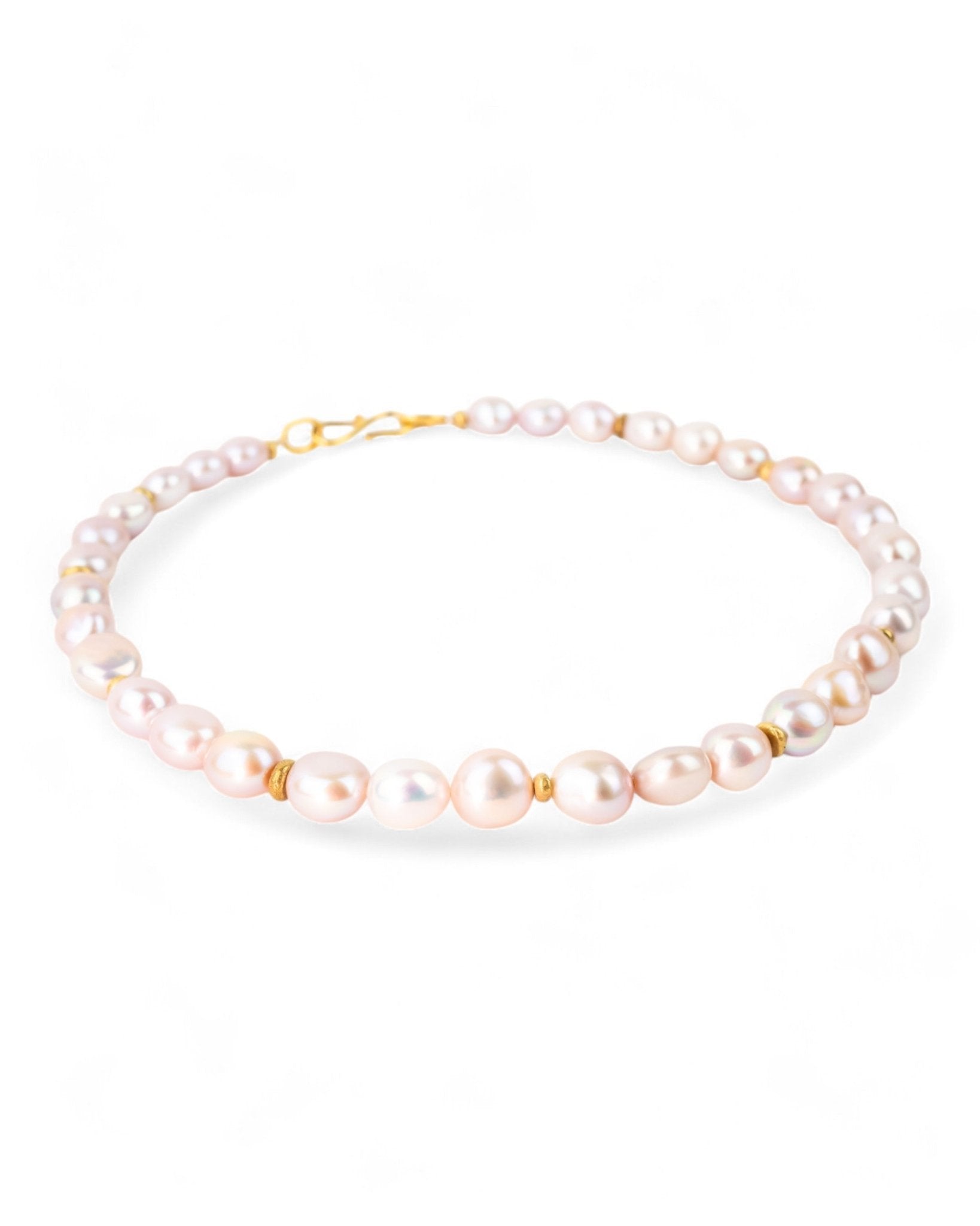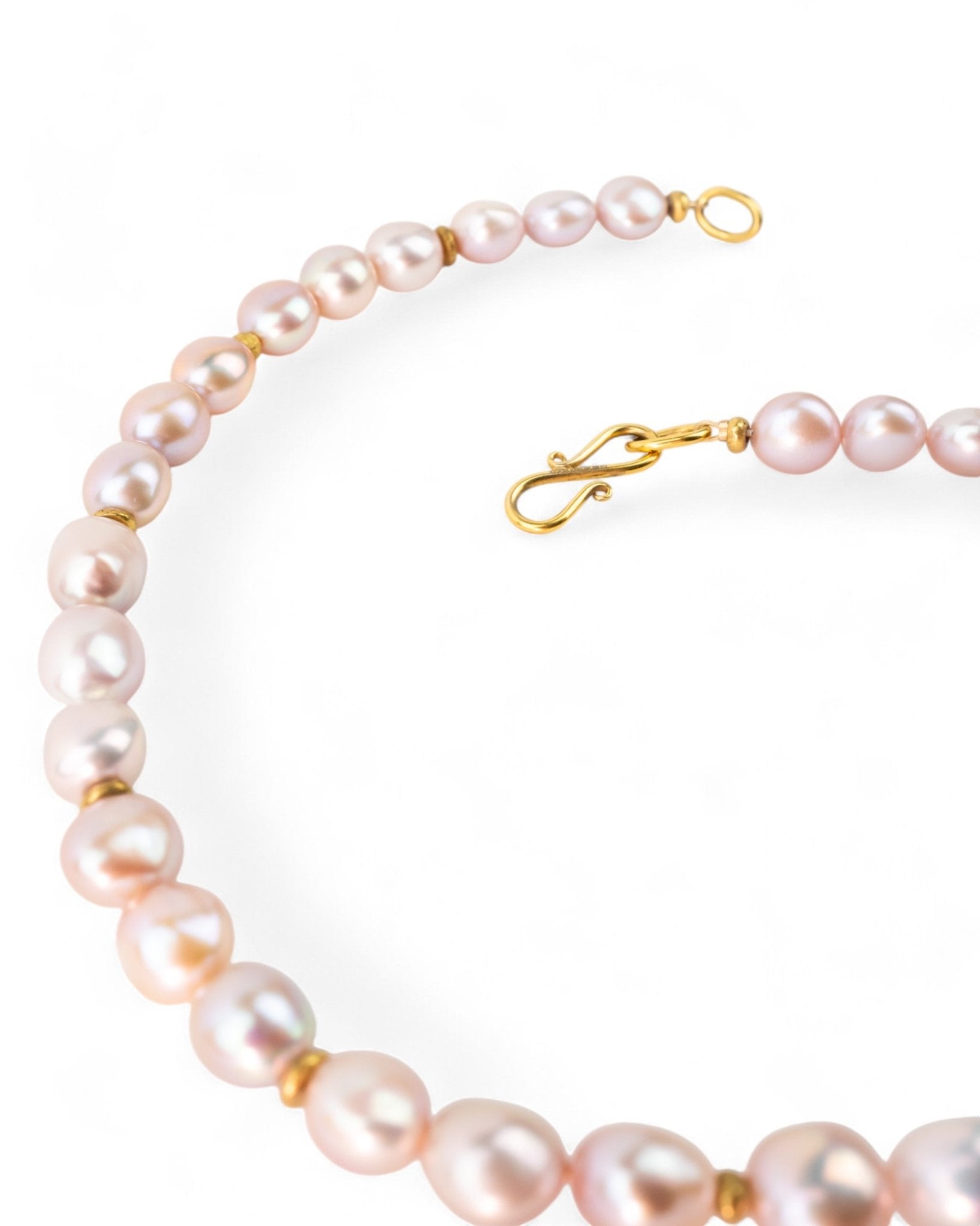 The Gold Nuggets and Pearl Necklace (Pink) effortlessly blends baroque pearls with the luxury of handmade gold nugget beads.