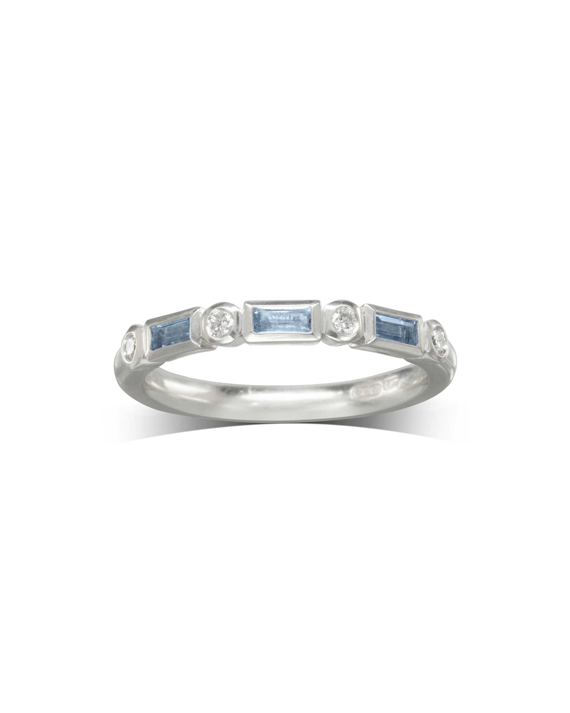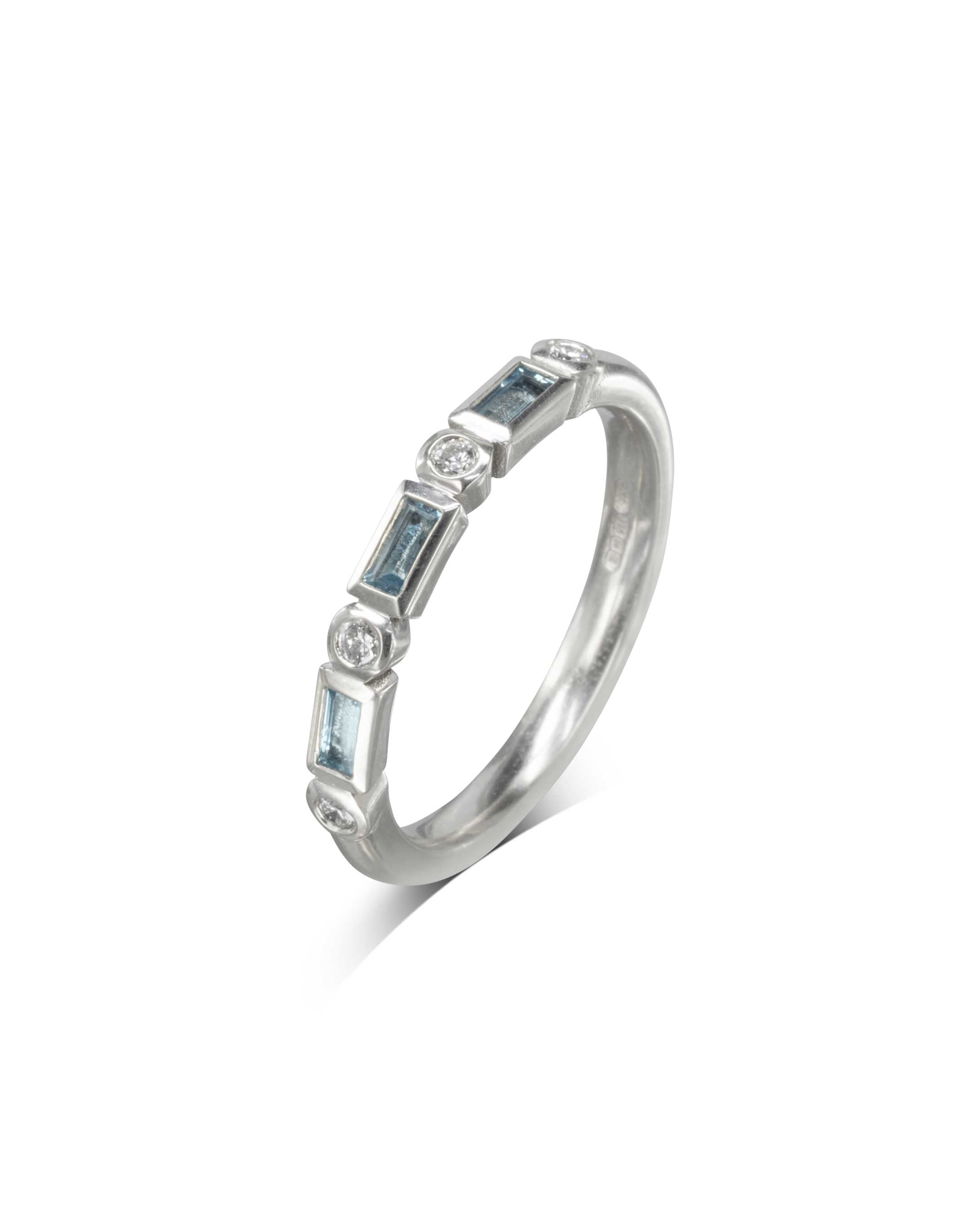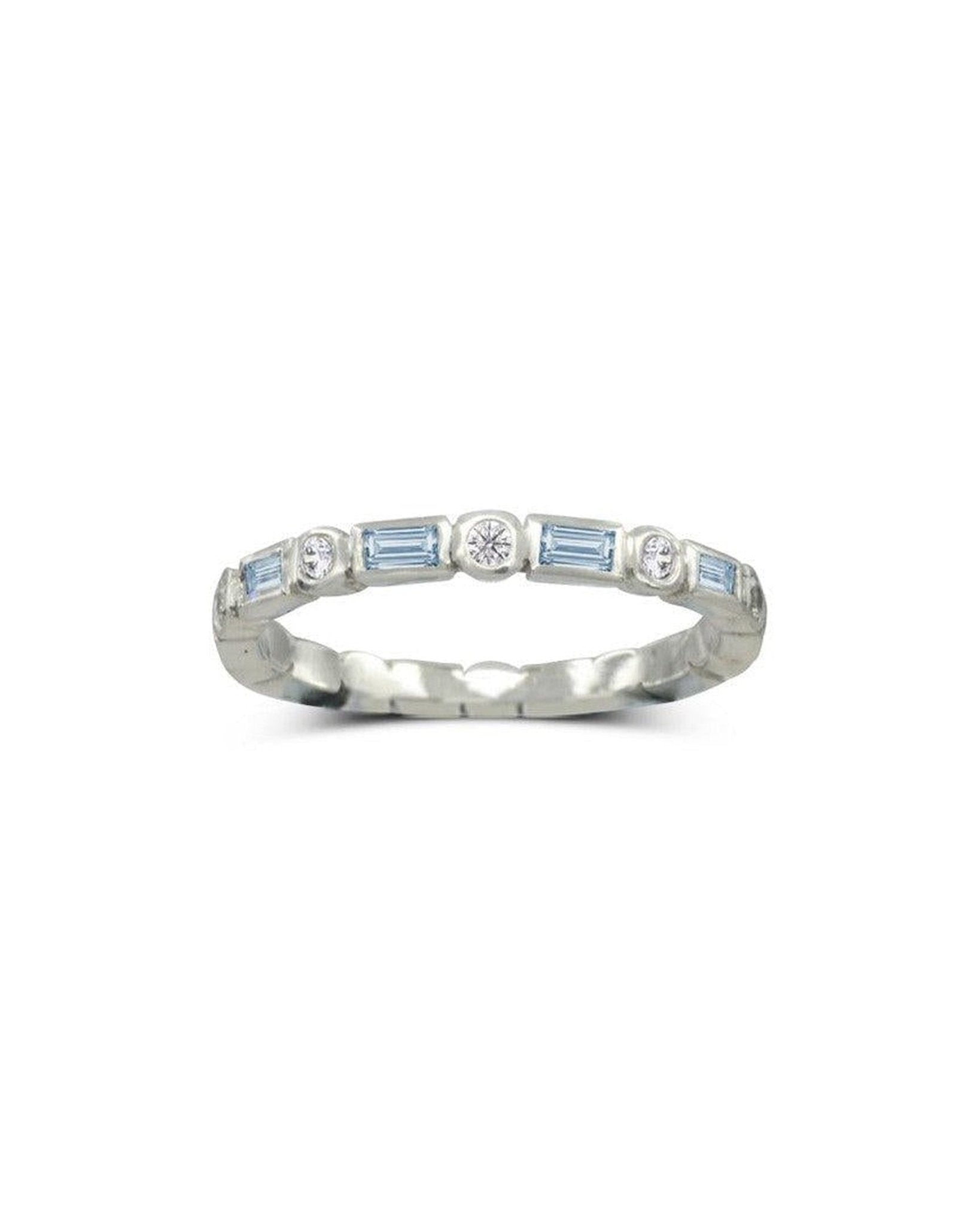 • Pierres alternées : la bague d'éternité complète en platine et diamant aigue-marine présente un motif de diamants ronds de 2 mm avec des aigues-marines taille baguette de 3,5 x 2 mm.