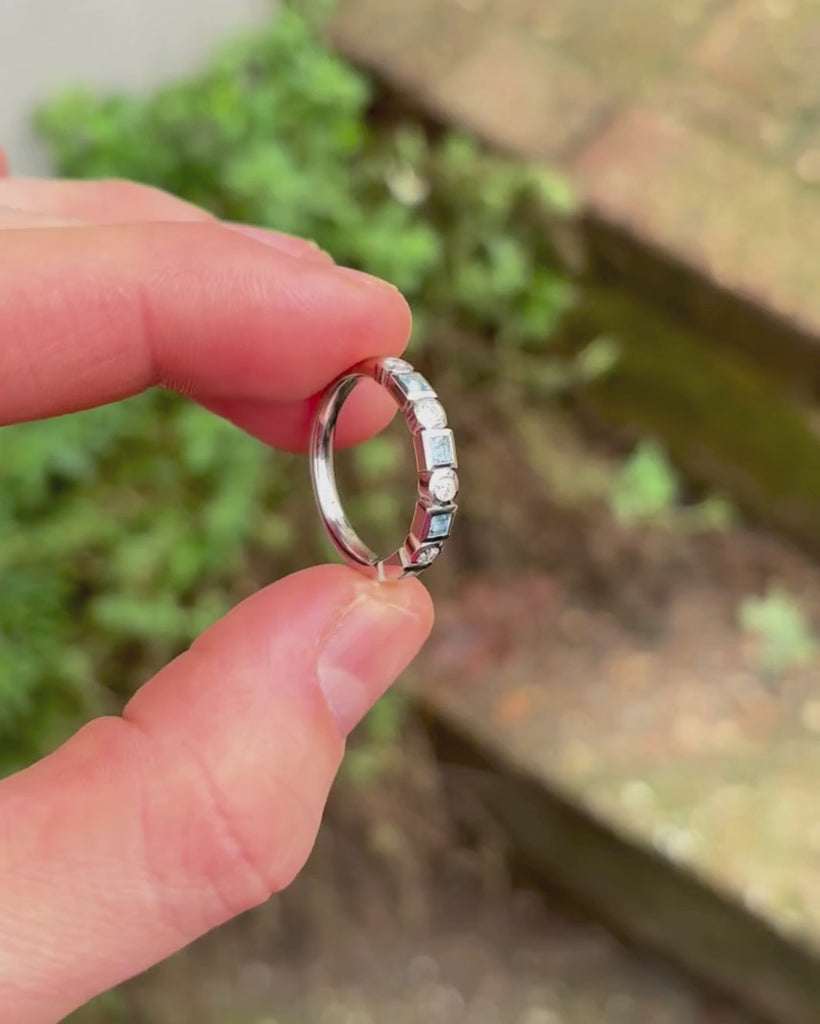 Bague d'éternité en platine avec diamants et aigue-marine alternés