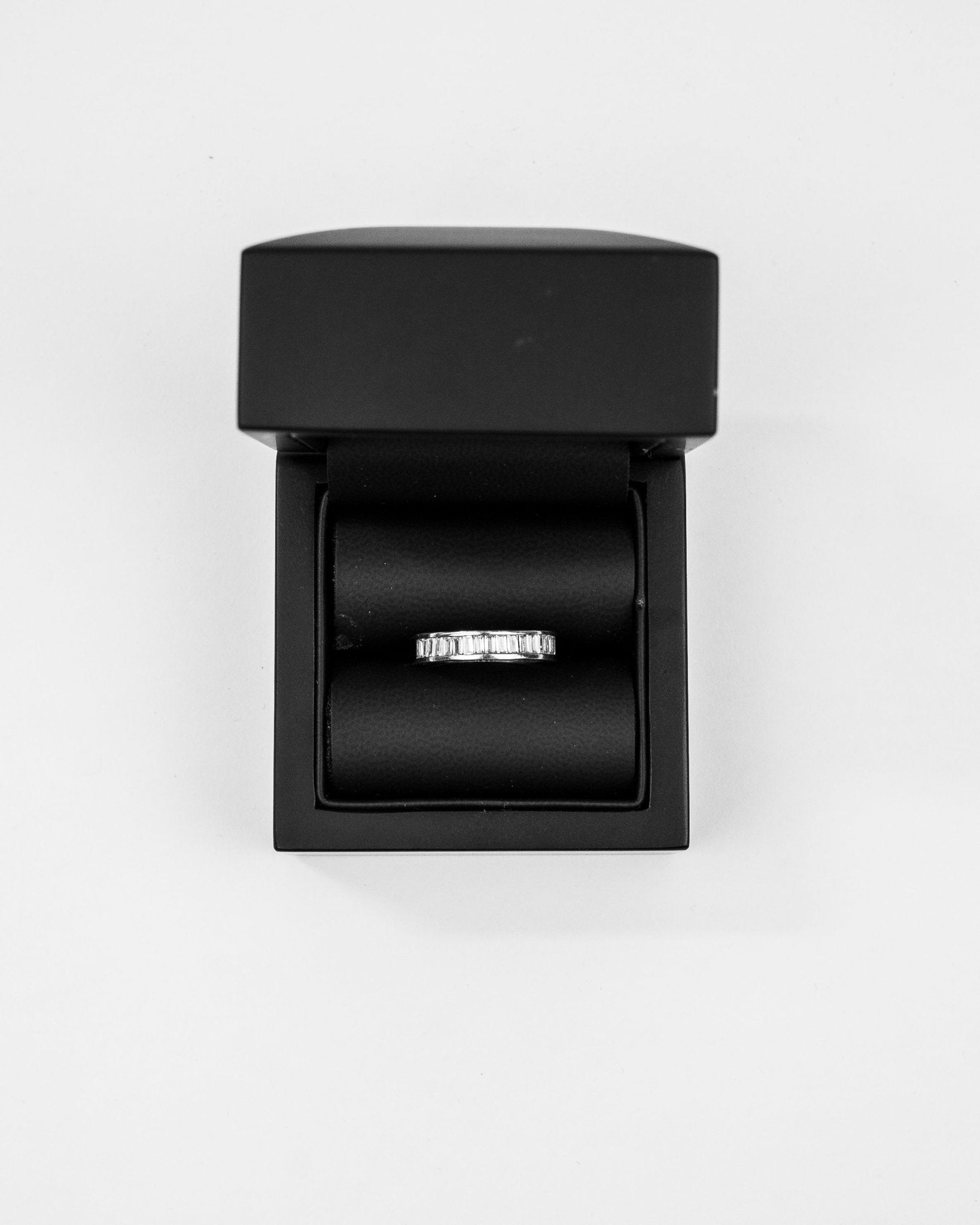 La bague d'éternité en platine avec diamants baguette est une superbe bague de mariage ou d'éternité parmi nos bagues de fiançailles d'inspiration Art déco.