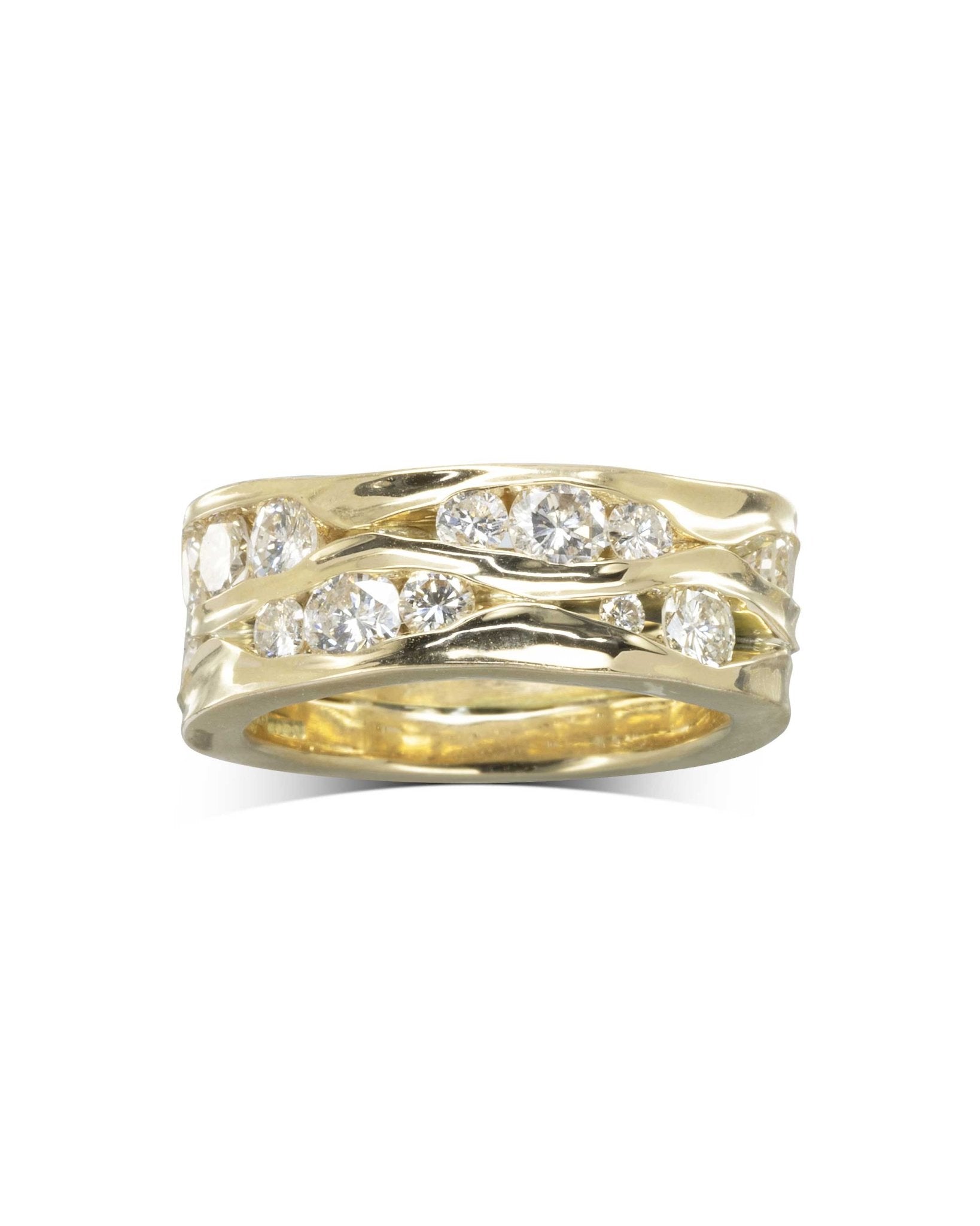• Conception large et unique : avec une largeur de 10 mm, la bague d'éternité en diamant à trois bandes Trap Wide est composée de trois bandes martelées latéralement de 3 mm.