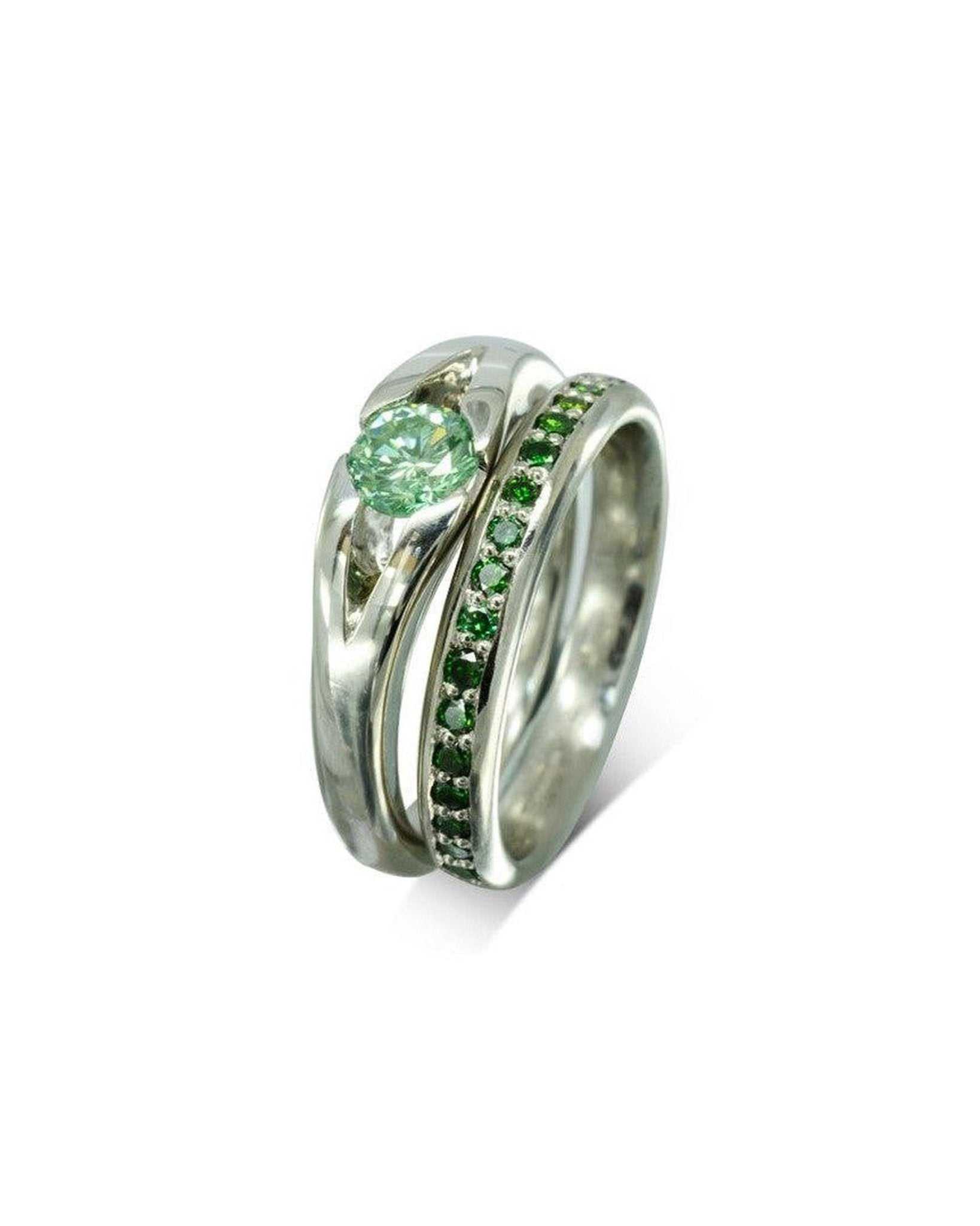 • Alliance assortie : la bague de fiançailles est associée à une alliance assortie comportant des diamants verts plus foncés.