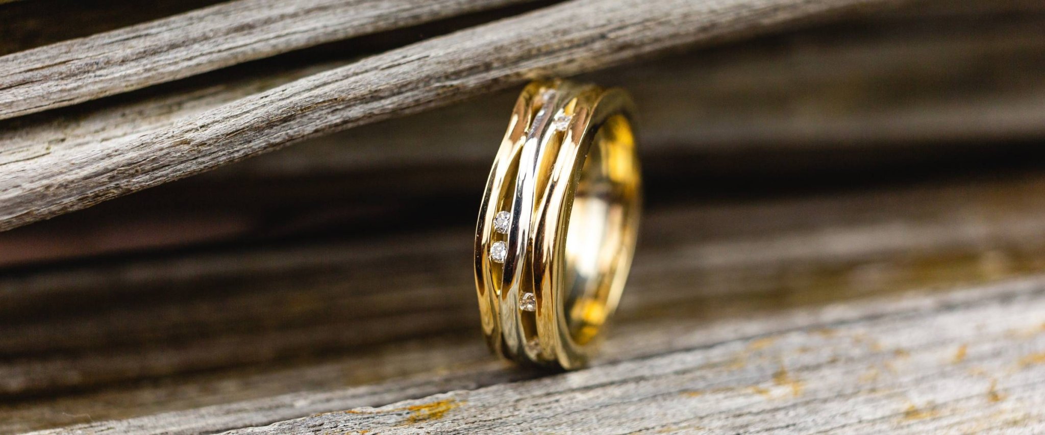 Nous pouvons également combiner différentes nuances d'or pour créer une variété de motifs et de textures. Par exemple, nous pouvons marteler votre alliance, lui donner une forme organique ou en créer une avec de la texture (voir nos bagues « martelées latéralement » avec des pierres serties à ras).