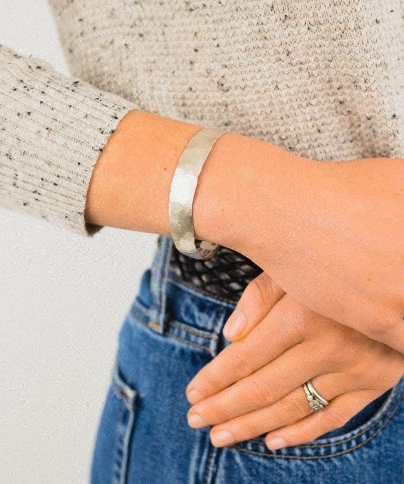 Nos pièces martelées sur le côté révèlent une finition texturée ondulée créative sur le travail du métal pour que votre bijou fait main se démarque vraiment de la foule. La finition organique a tendance à être délicate sur des bandes plus fines ou épaisse avec des bandes plus larges, ce qui rend chaque pièce vraiment unique.