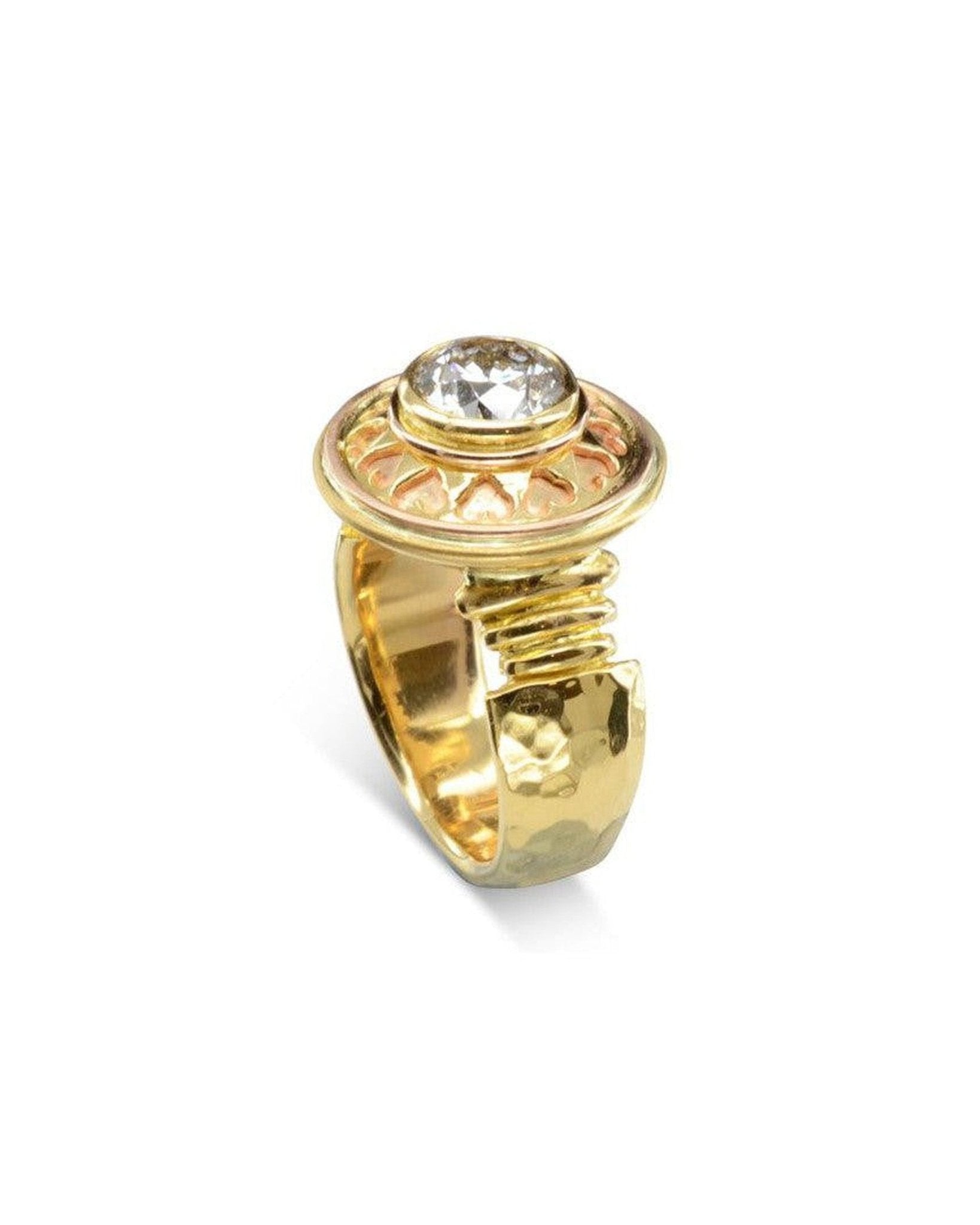 • Ribbed and Hammered Shank: The shank of the ring has a ribbed and hammered design, enhanced by a red gold backing to the beautiful heart accents, adding texture and character to the overall aesthetic. These unique features contribute to the ring's handmade feel.